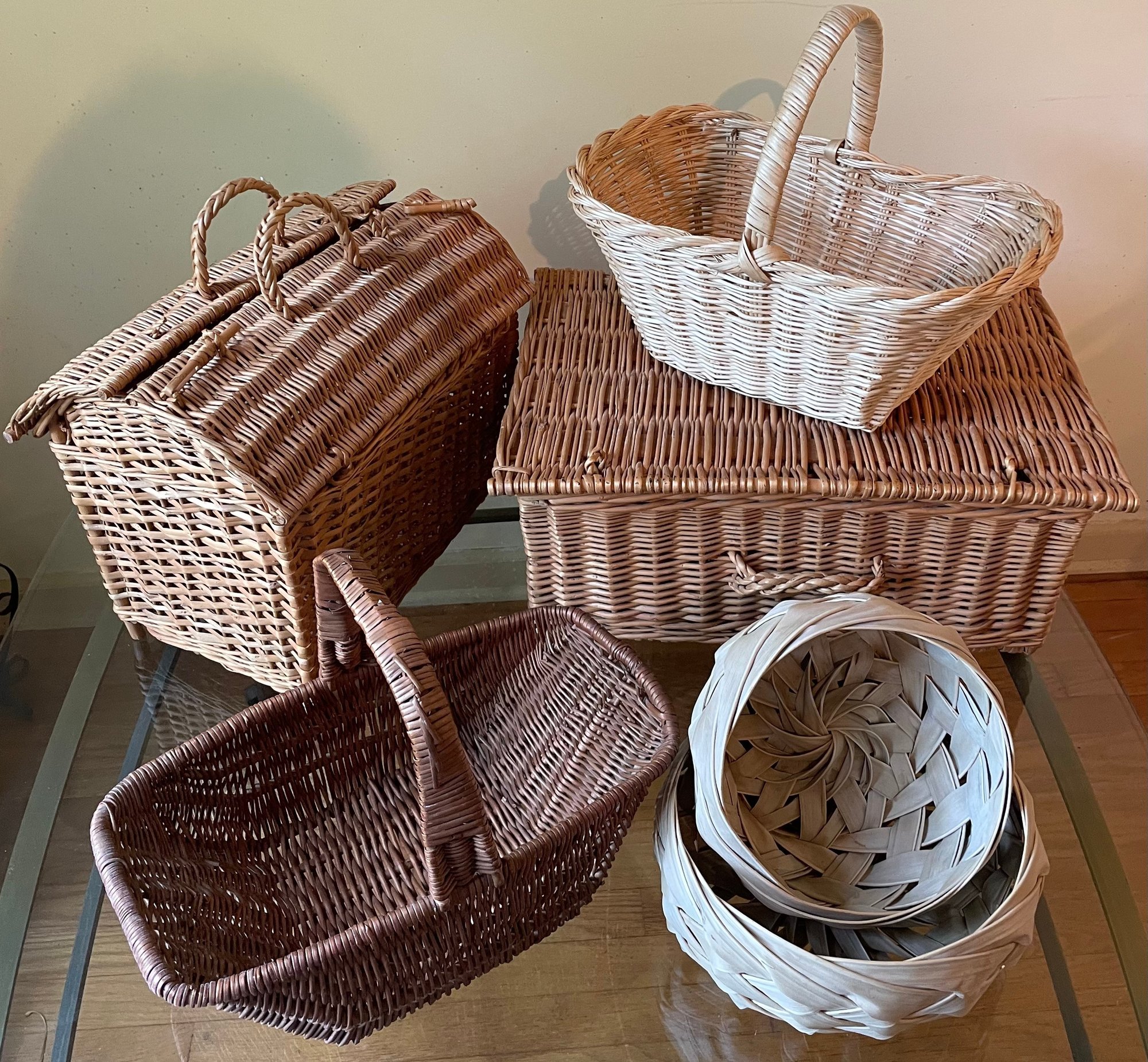 Another great group of baskets. Love the round woven baskets - they are 8" and 9" in diameter. The large one with 2 handles is 15" long - note that the little pieces that should lock it closed are no longer there. But there a lot here to use and enjoy. Most all are in good condition.