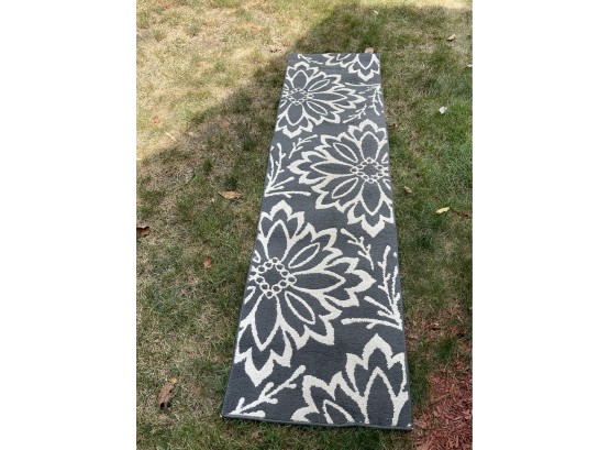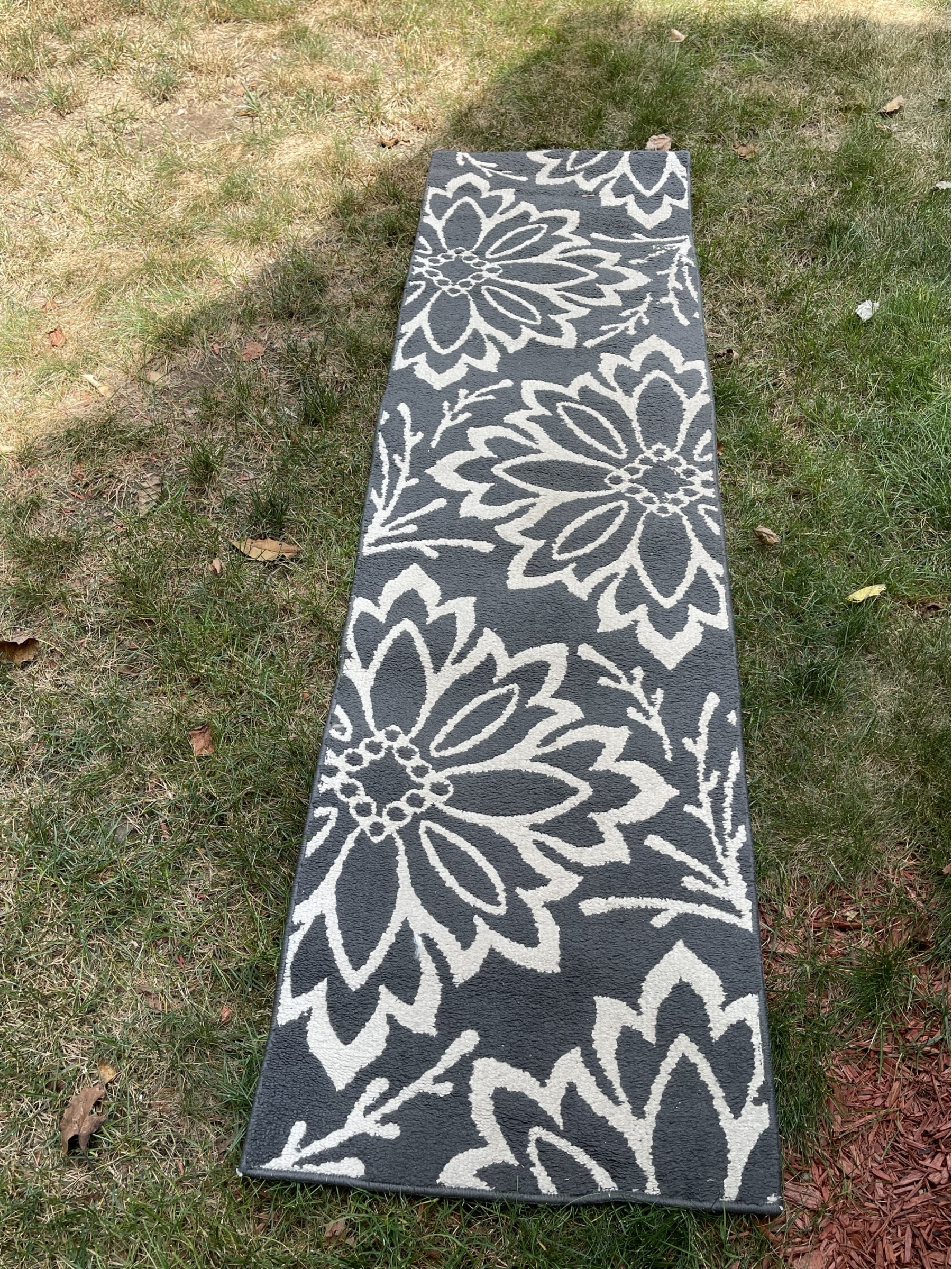 This grey runner rug has some wear to it but still looks good. It measures 84x22 inches.