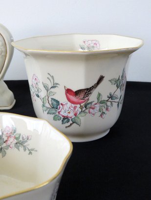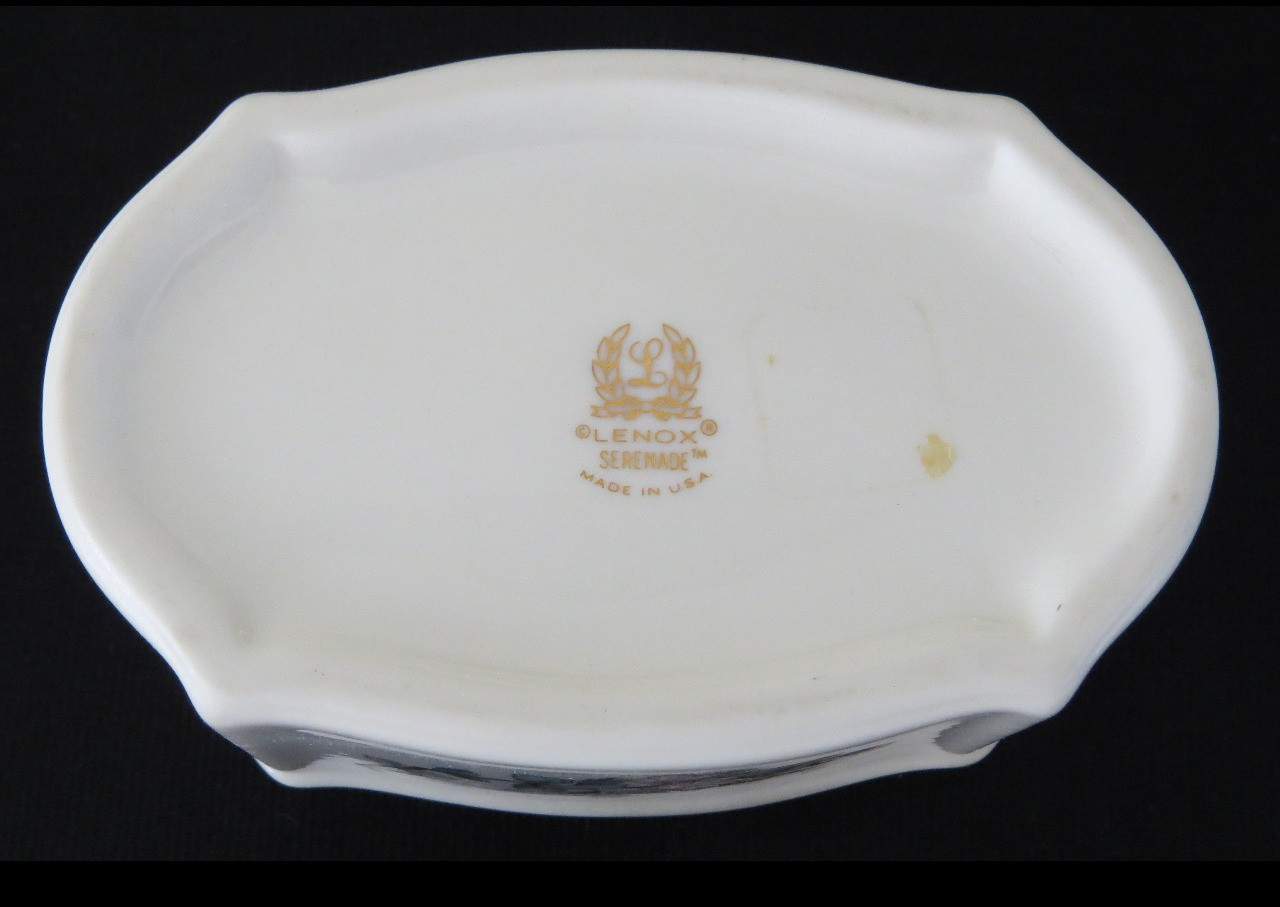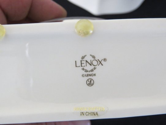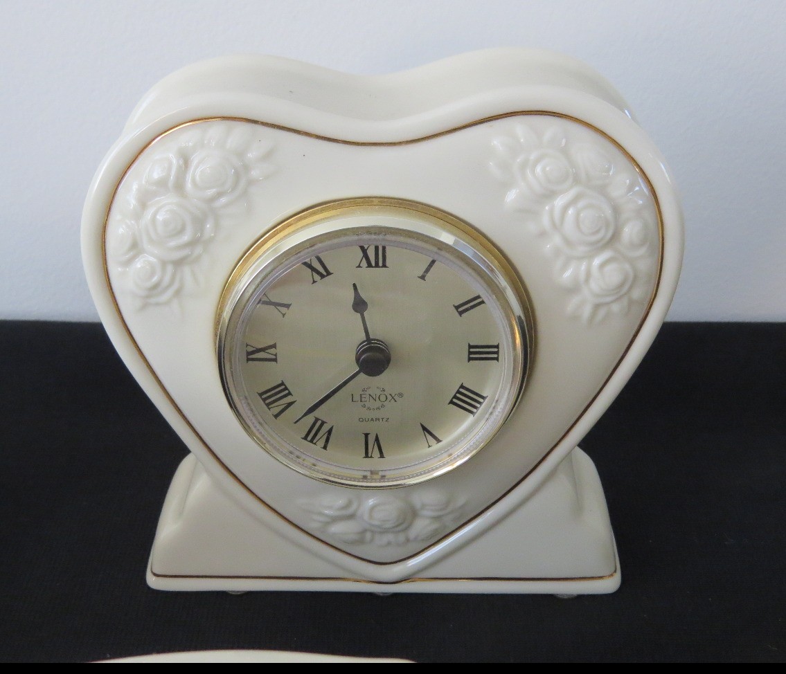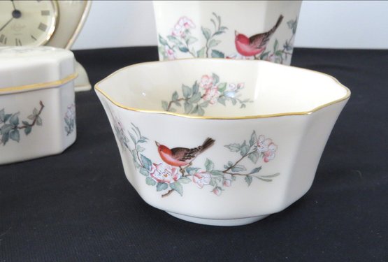 Five piece lot of Lenox china including clock (needs a battery), covered keepsake/trinket box, various bowls all in good shape.