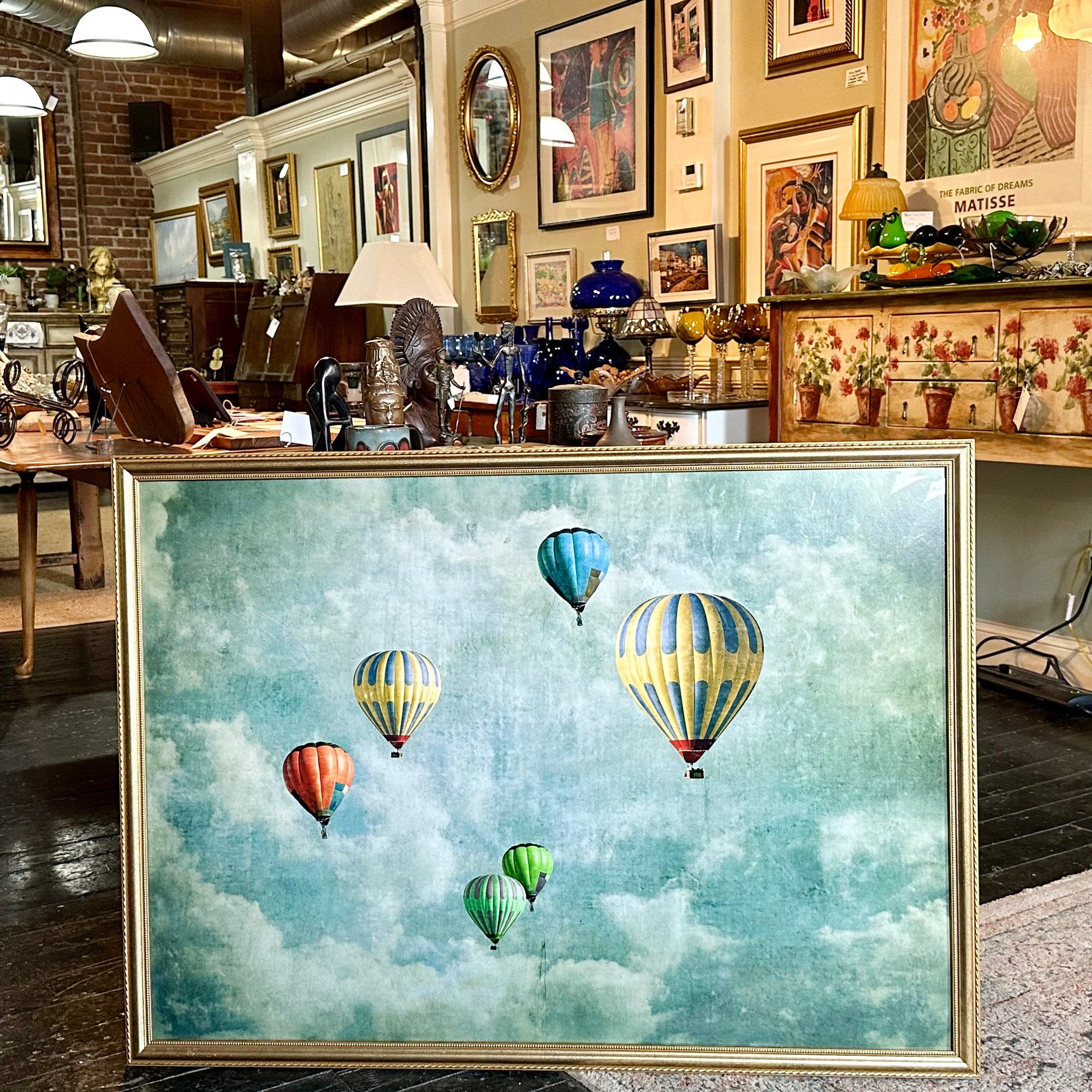 A large hot air balloon framed print that makes a statement! The photos don’t quite portray the impressive size of this piece. Tried to show some perspective in the photos.