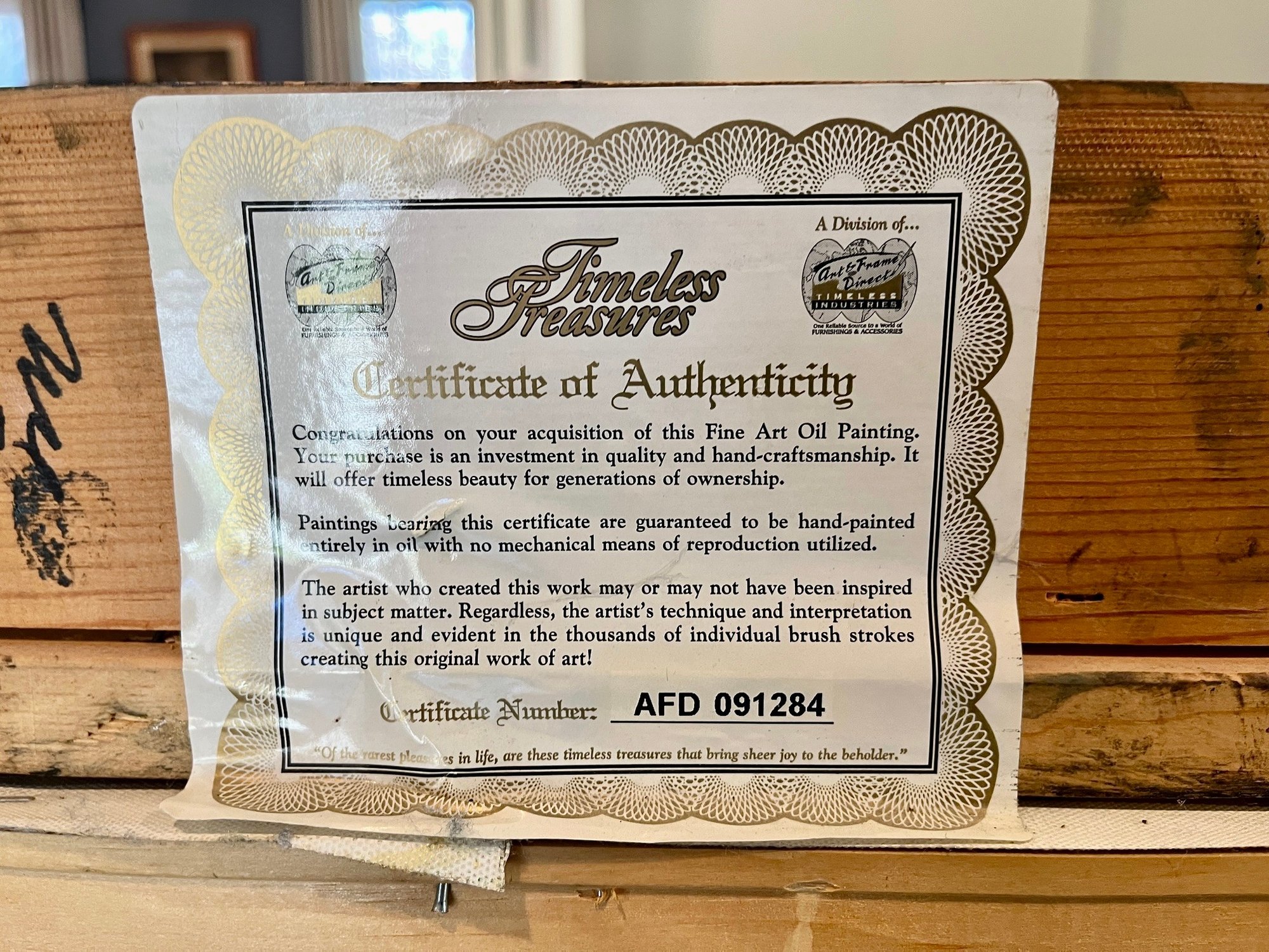 Frame is an ornate carved gold leave look, but not actually wood. One dent - bottom edge, styrofoam showing through.