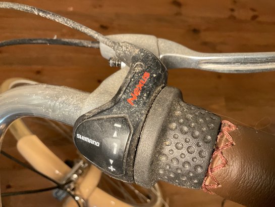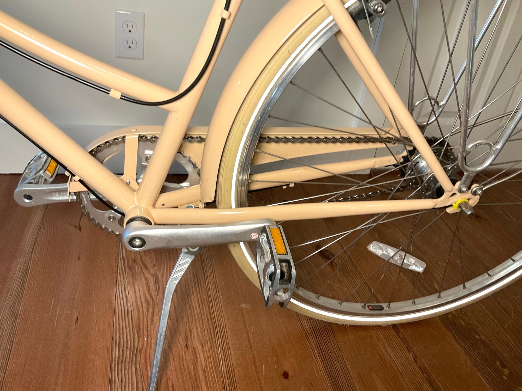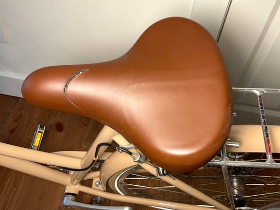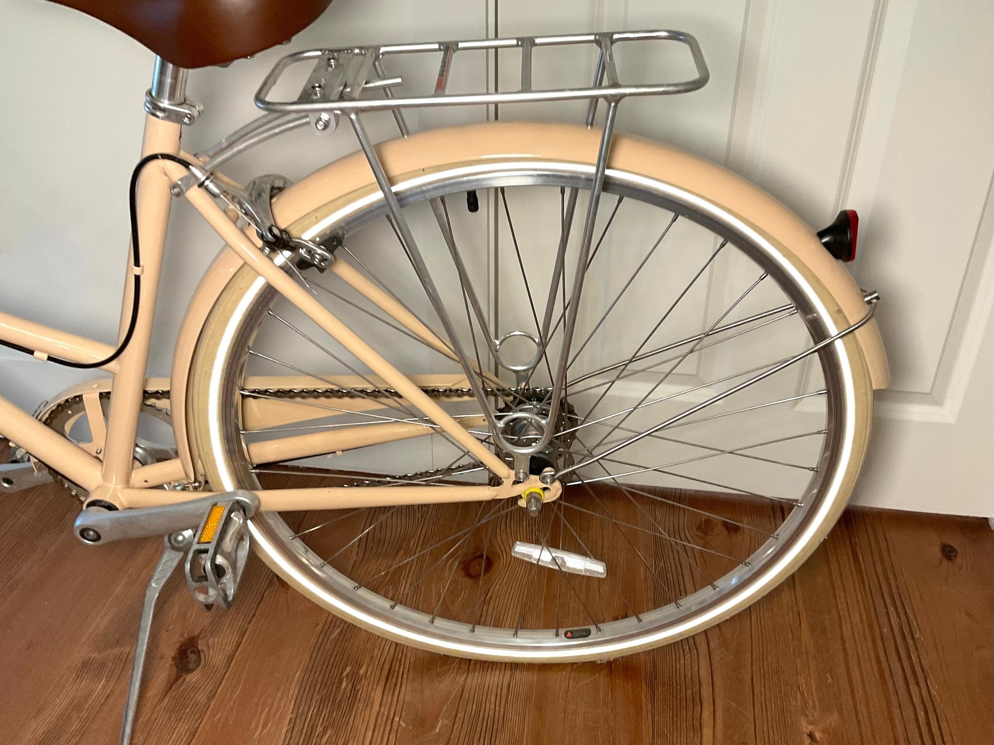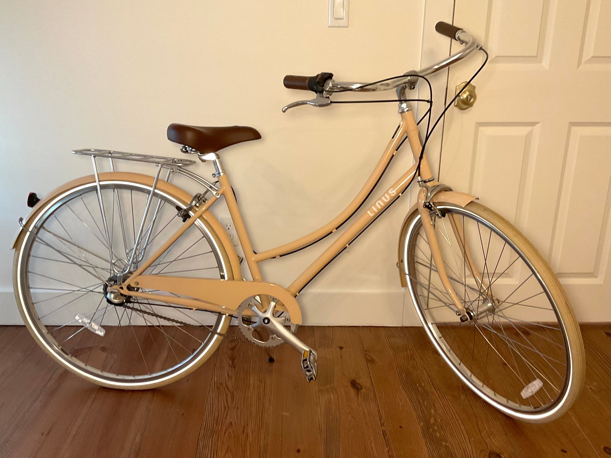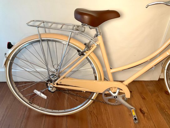 A European retro Linus Dutchi 3i City Bike featuring a gender neutral step through frame, Shimano Nexus 3-speed gears, leatherette comfort seat, rear rack, chain guard and fenders. Color - Blush. Adult. 26” wheel.