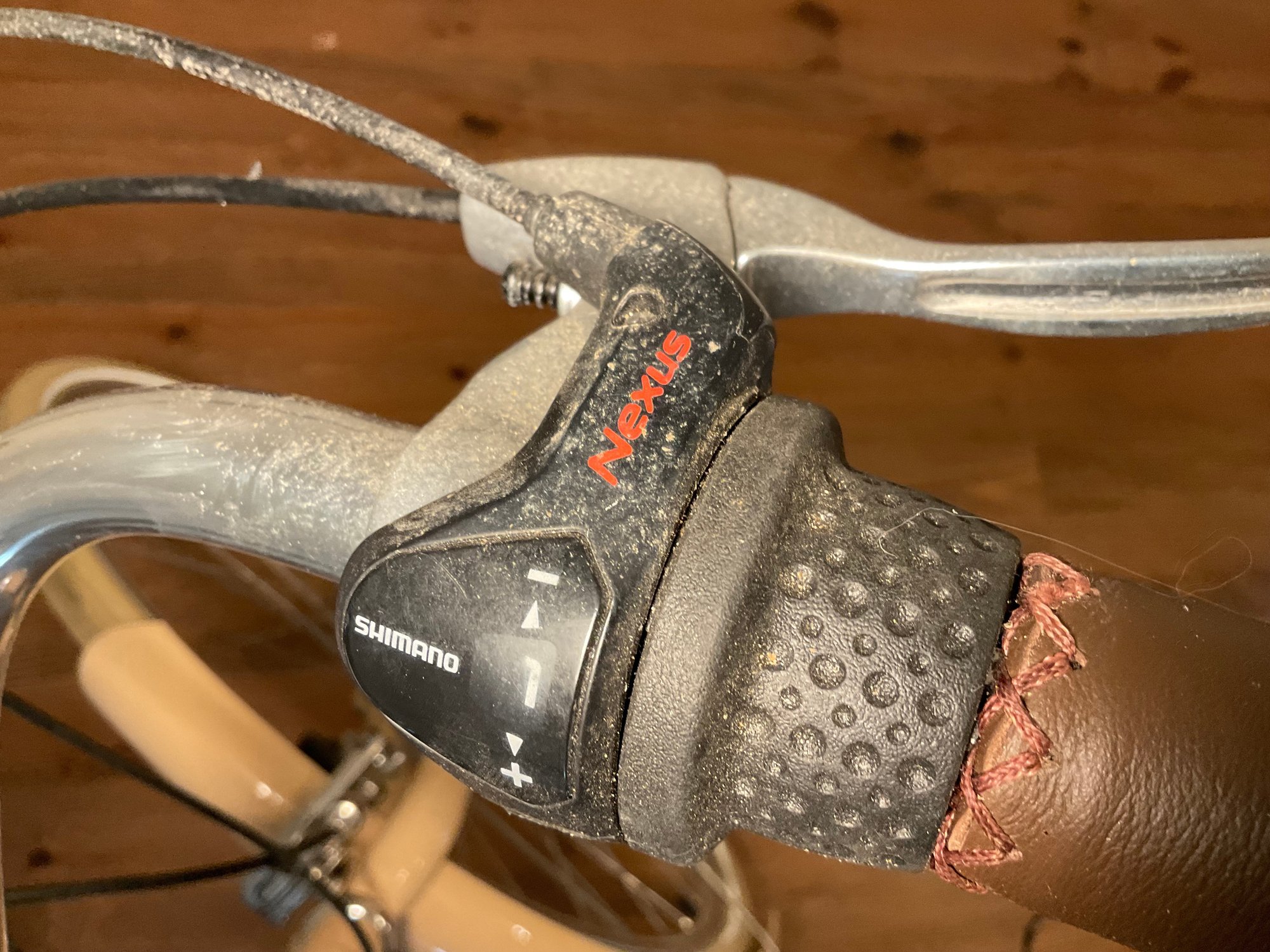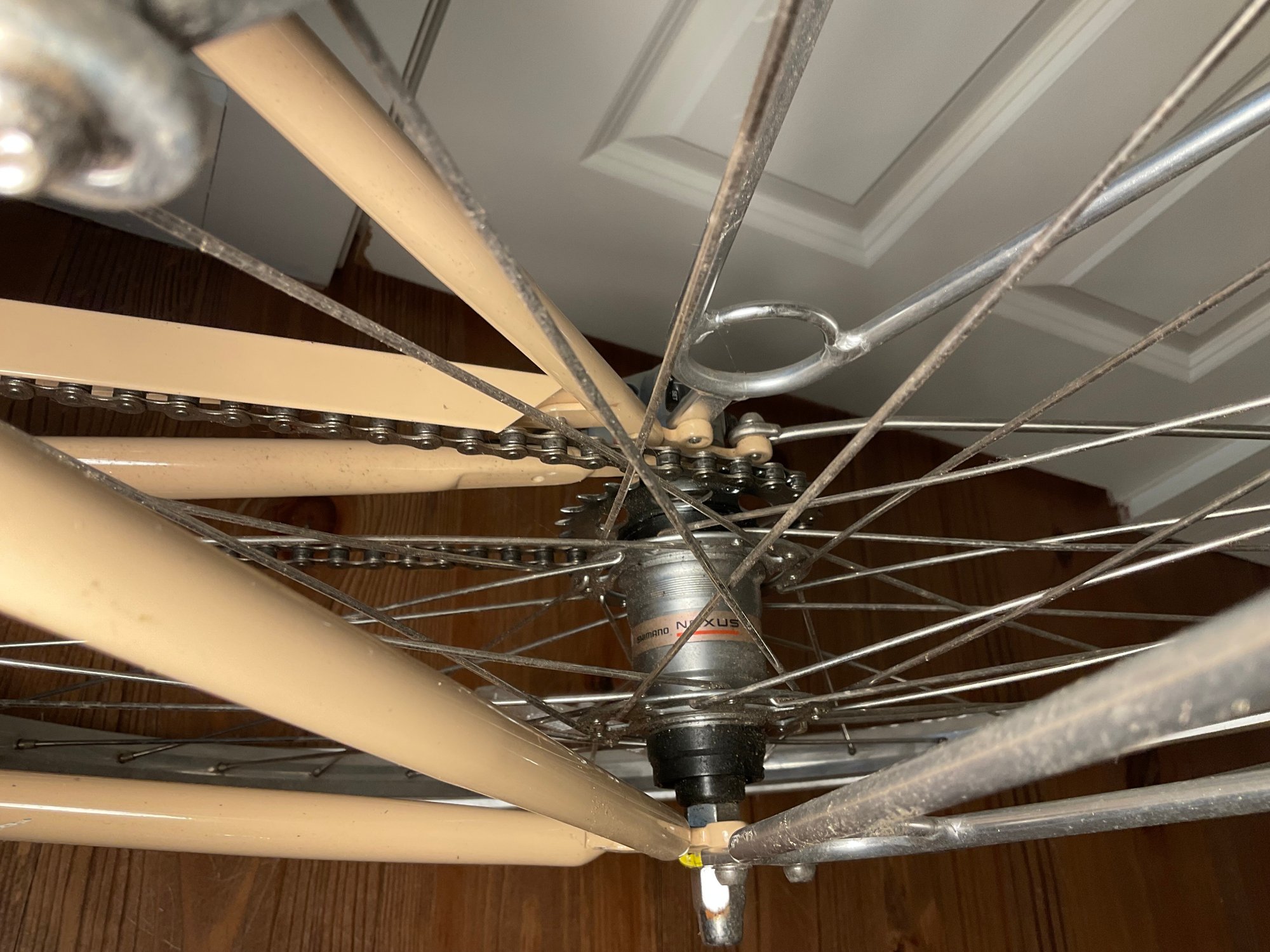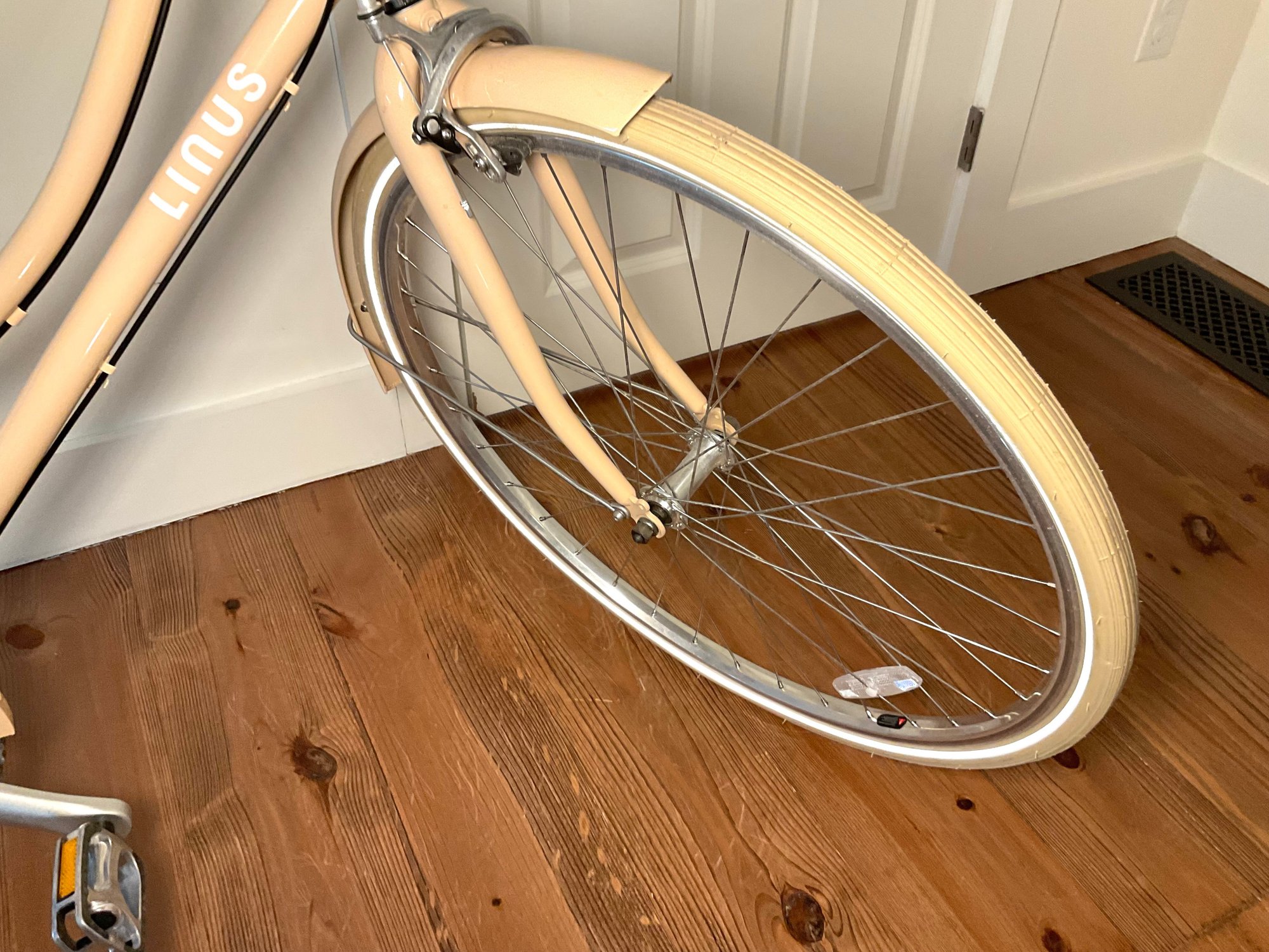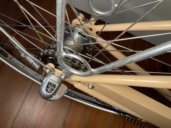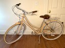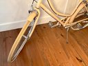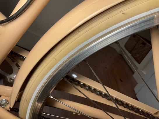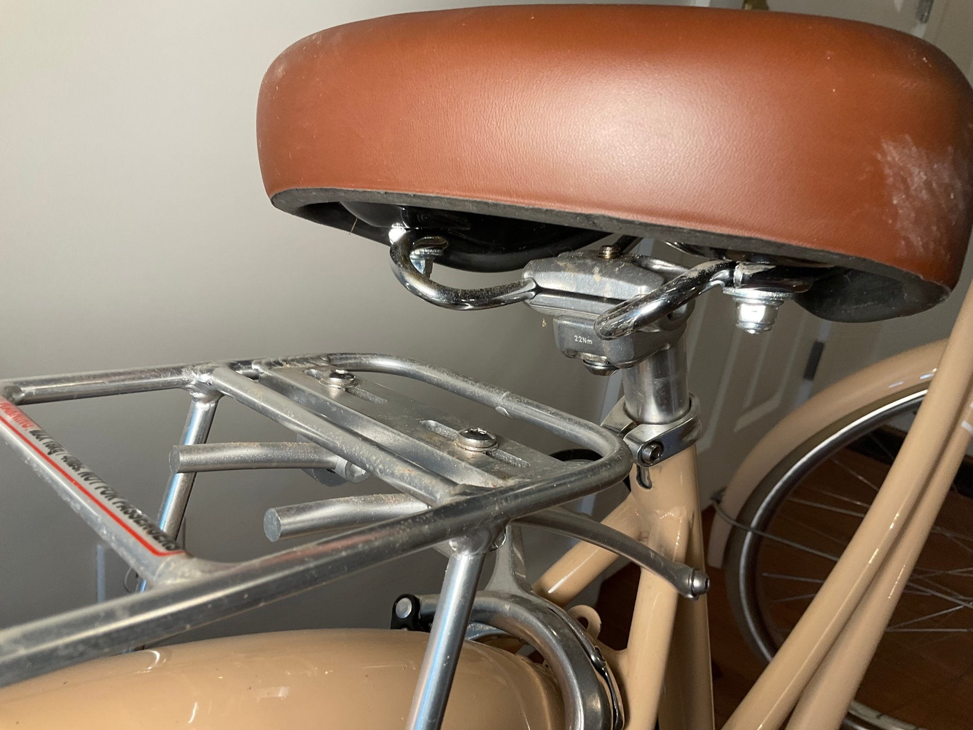 A European retro Linus Dutchi 3i City Bike featuring a gender neutral step through frame, Shimano Nexus 3-speed gears, leatherette comfort seat, rear rack, chain guard and fenders. Color - Blush. Adult. 26” wheel.