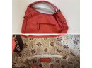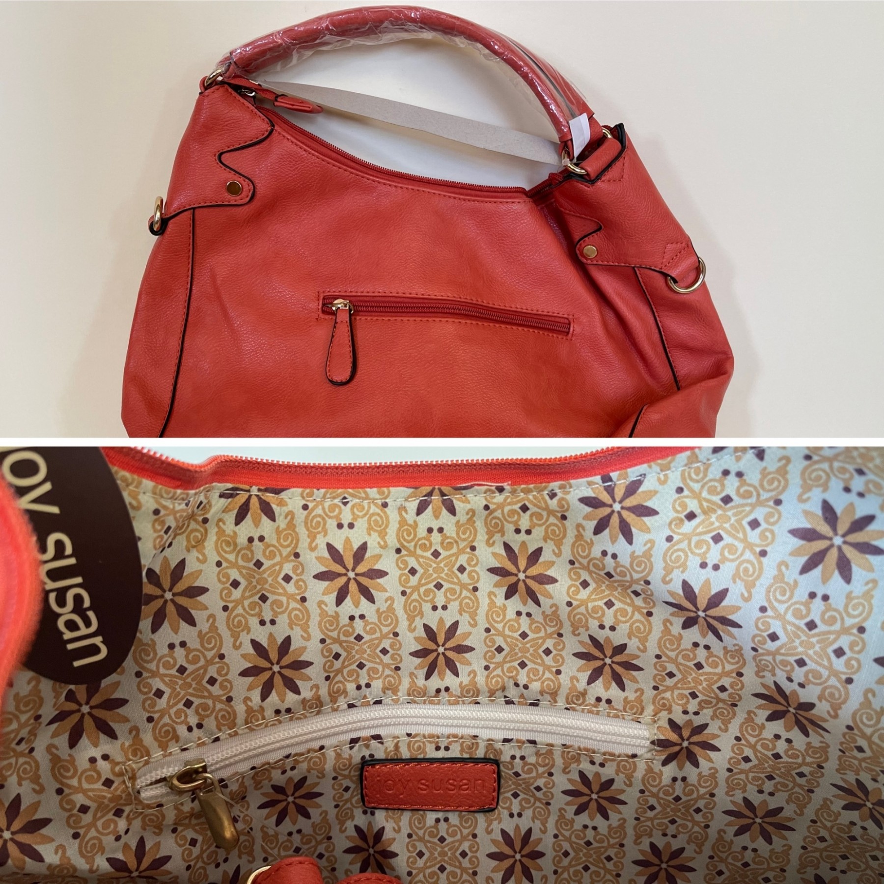 A fantastic never used Joy Susan purse with a coral hue, and a vintage style liner with floral print. Love it! It has additional longer strap to make it into a cross body style and a zipper compartment inside with some pockets as well. It measures 16x12 inches.