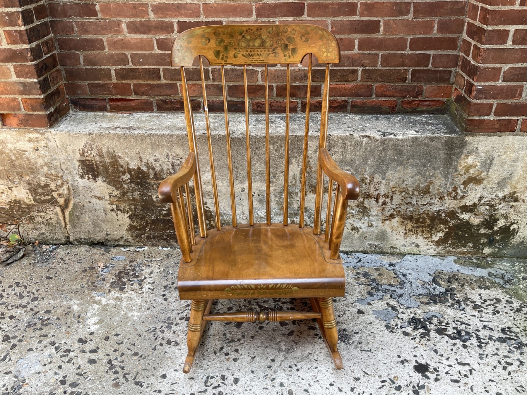 Such a beautiful Nicholas & Stone rocker! It’s sturdy and in good condition for its age. Normal wear from use and one spot that appears to be white paint on a spindle. It measures 42 inches tall, 22 inches wide and 18 inches deep on the seat.