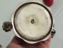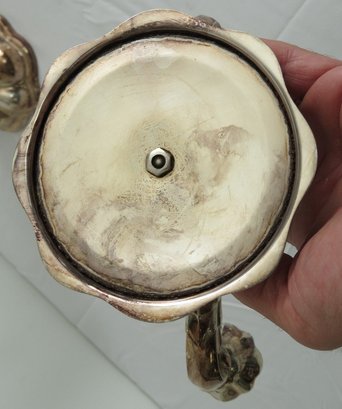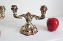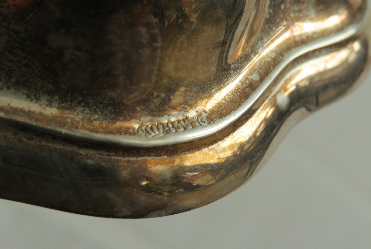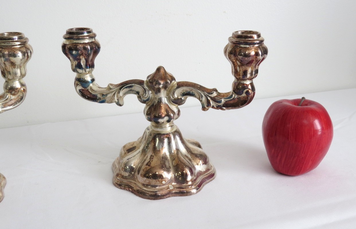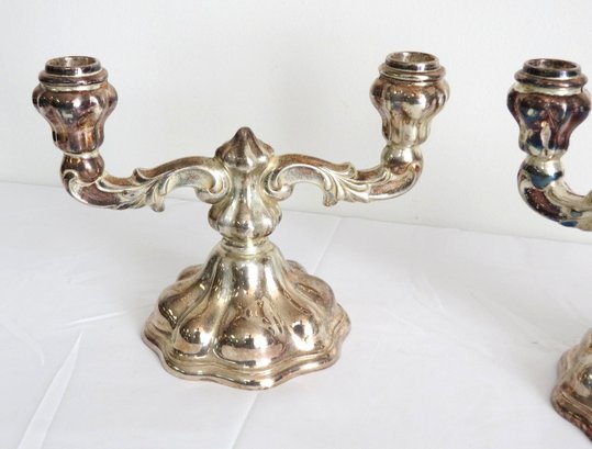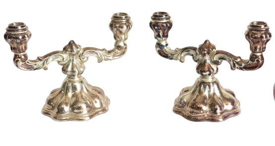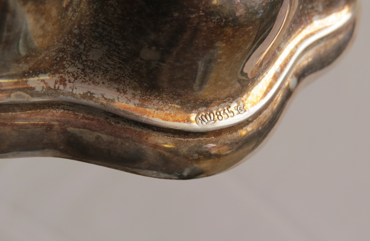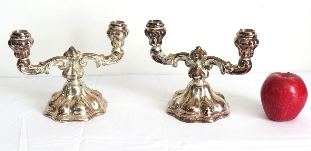 A pair of mid-century 835 silver marked candlesticks, likely Germany/Bavaria. Each is 8.5" wide, 6.5" height. Bases appear to be weighted plates with .835 silver bodies. Some tarnishing.