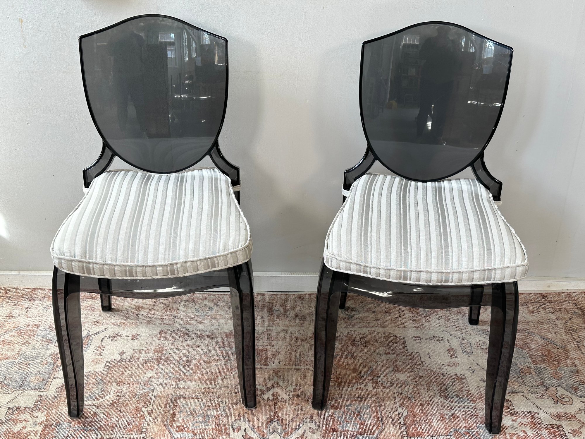 A Pair Of Acrylic Ghost Chairs With Custom Striped Cushions