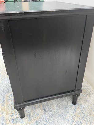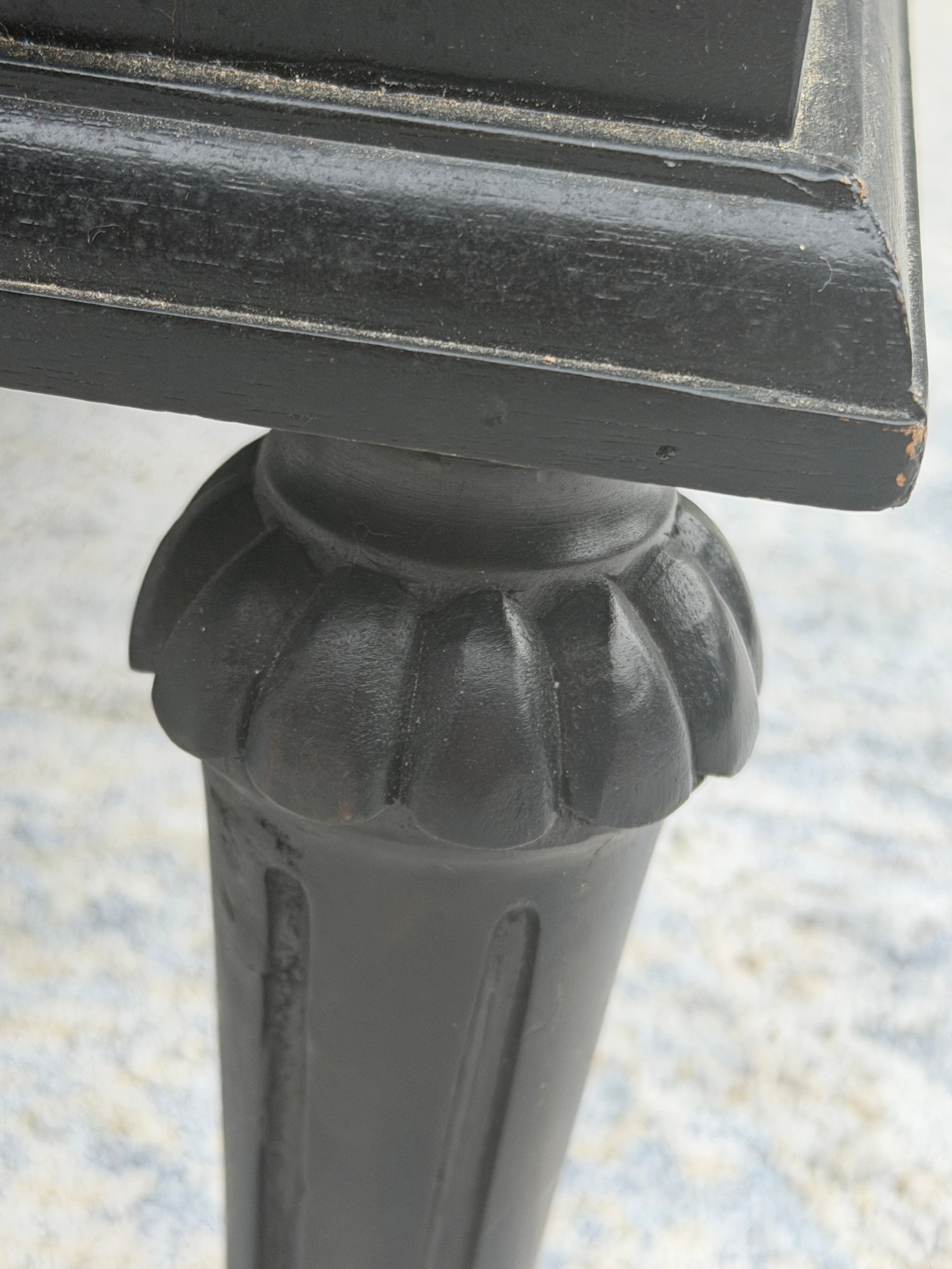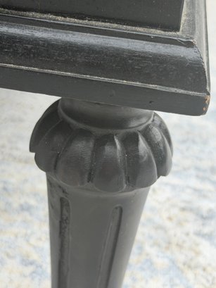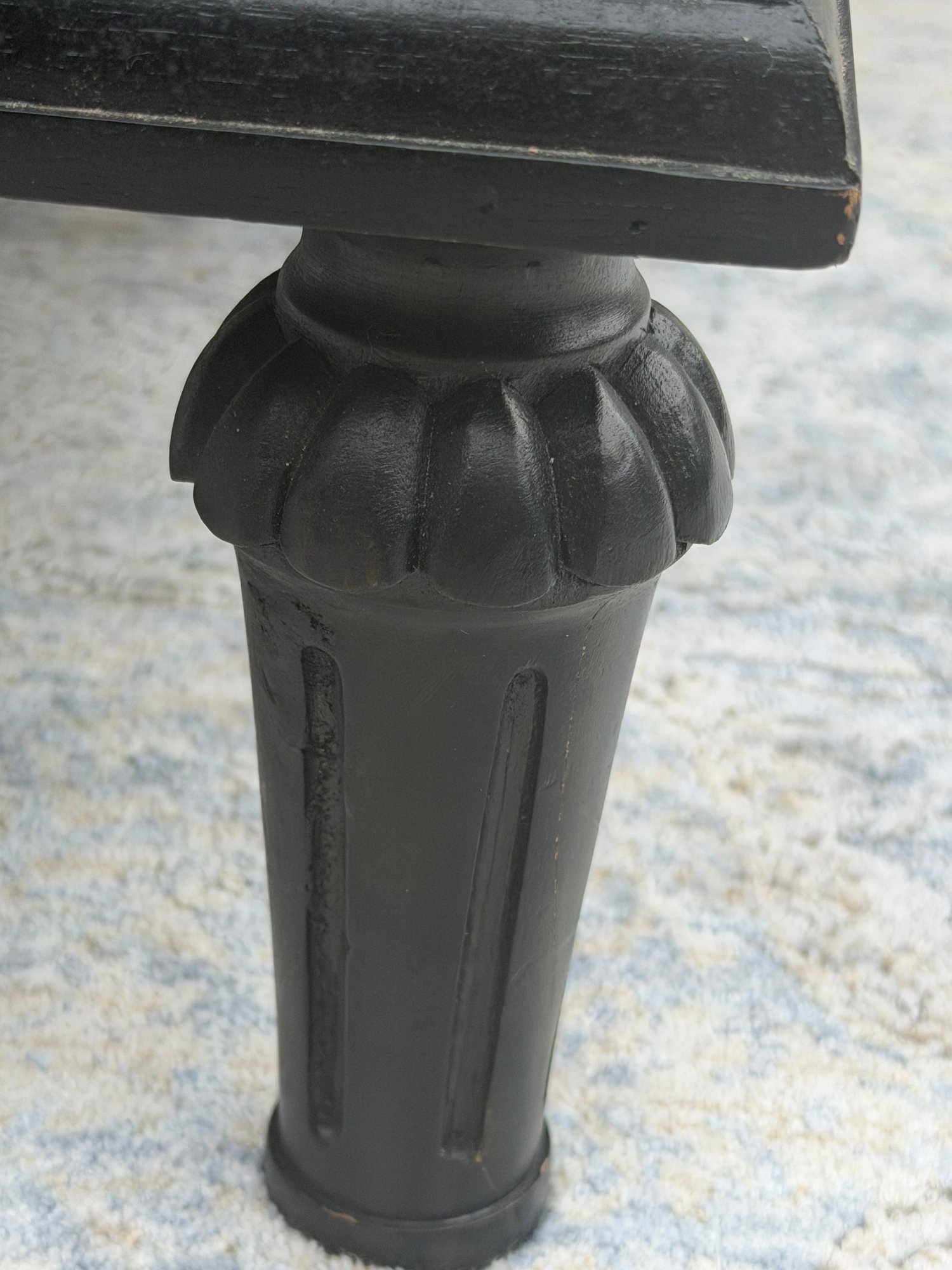 Crafted of solid hardwood, each piece is carefully distressed using a hand-applied multistep process to achieve the look of a weathered antique. The tapered, slightly turned legs are fluted, a reference to Classic columns.