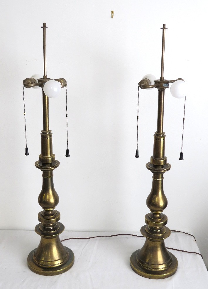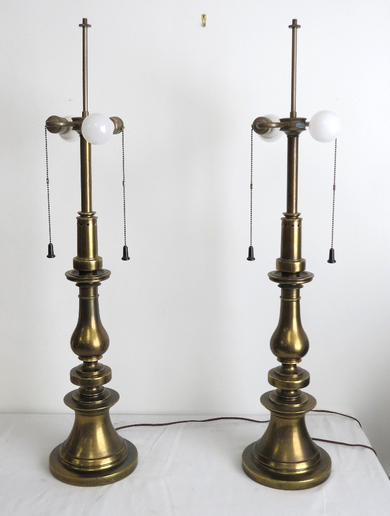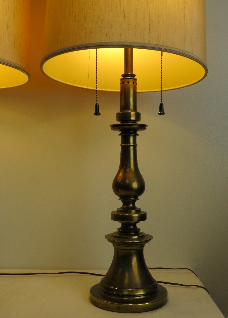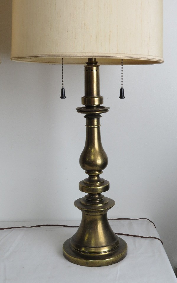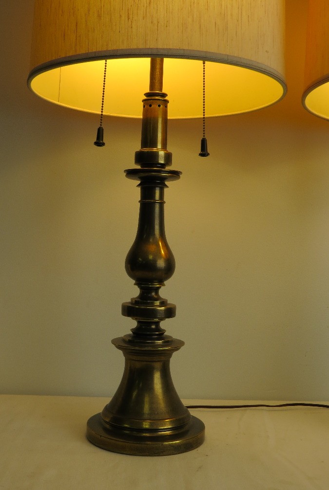A mid-century pair of Stiffel double socket pull chain lamps with original shades, overall height of 37.5".