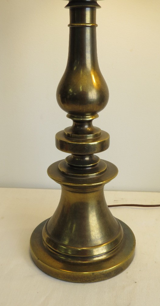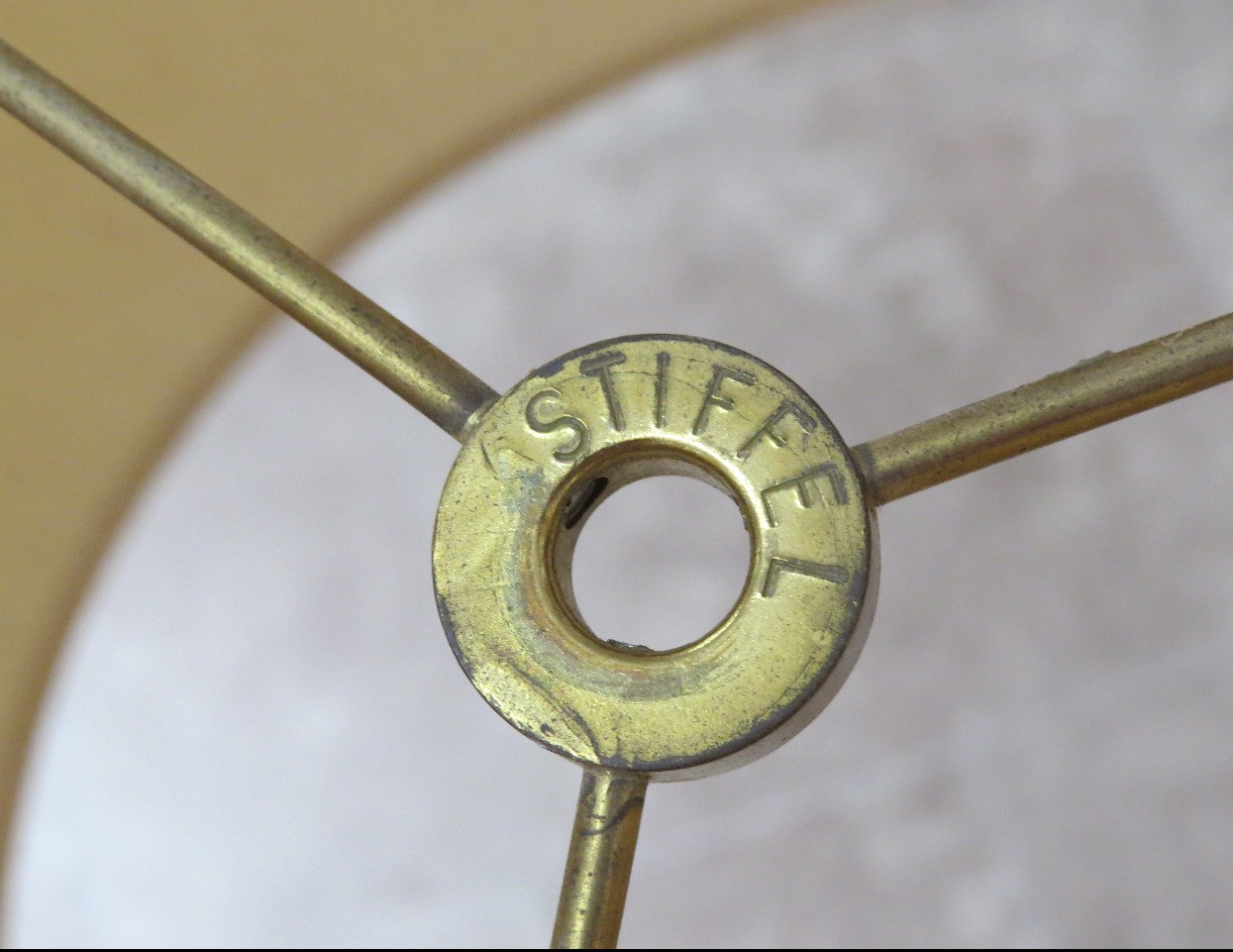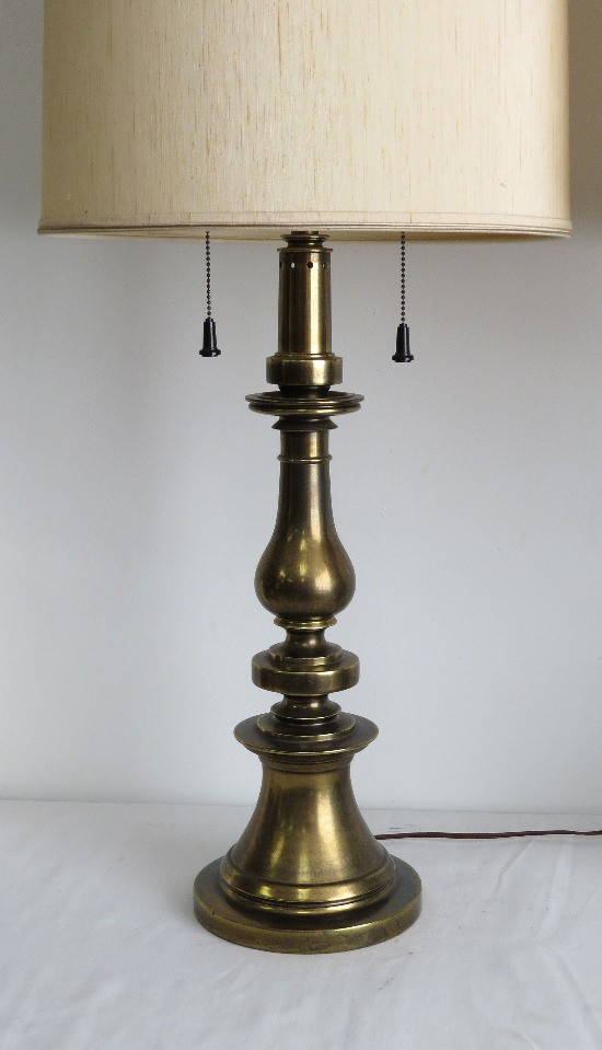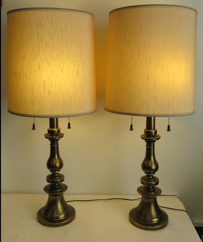A mid-century pair of Stiffel double socket pull chain lamps with original shades, overall height of 37.5".