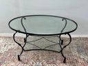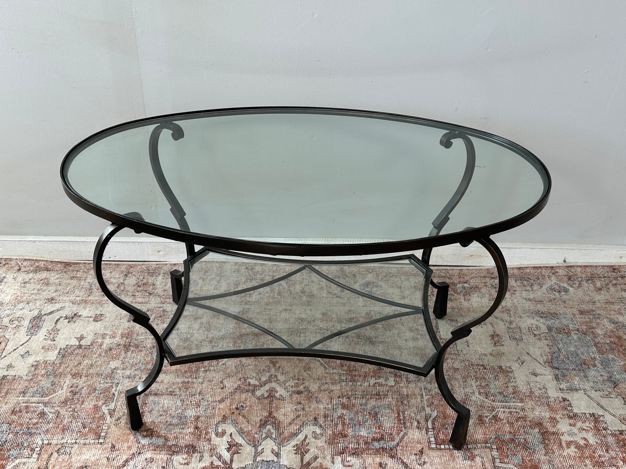 A Metal & Glass Oval Coffee Table purchased at Pier 1. It has some good weight to it and is quality made. A few scratches to glass but overall looks good.