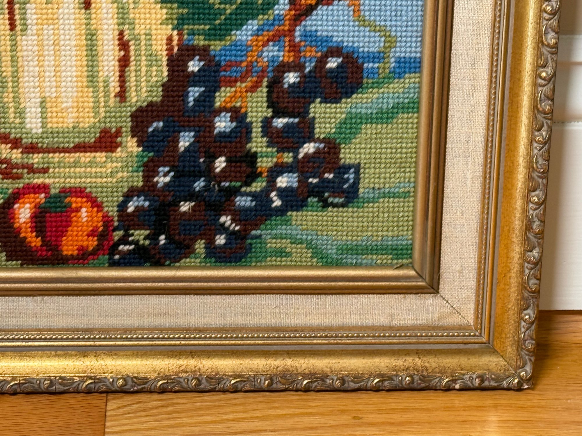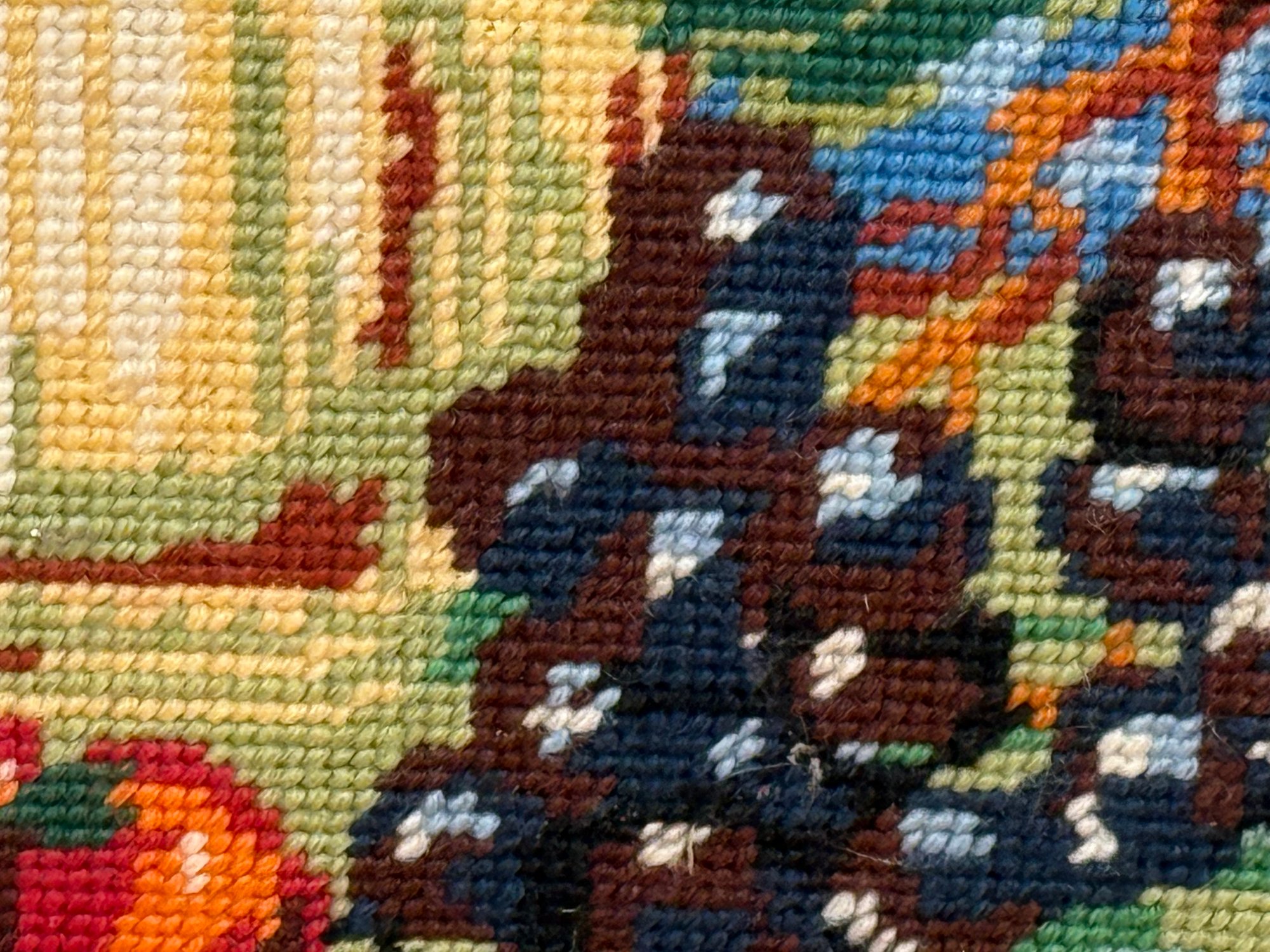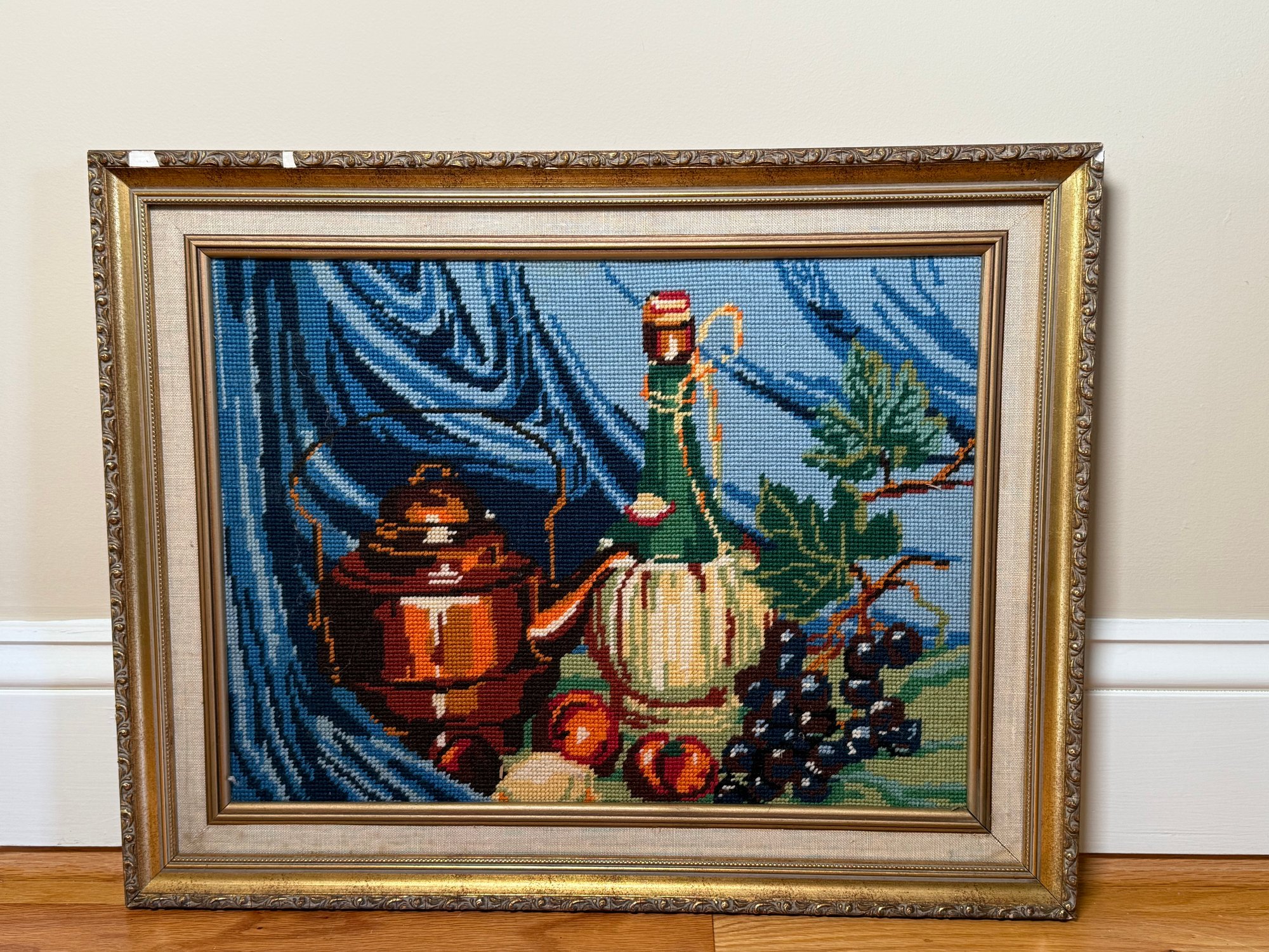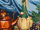 This beautiful needlepoint features a copper kettle, wine and fruit display still life.