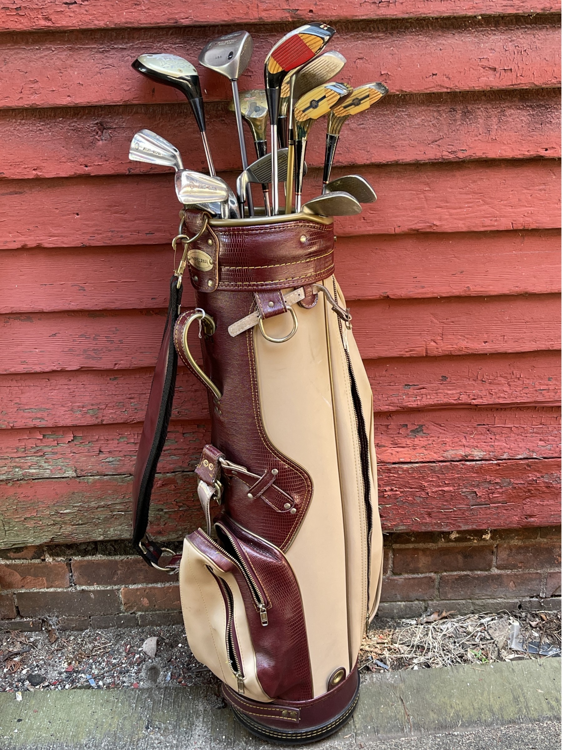 Check out this Professional (name of Brand) Golf bag, super vintage style and in good condition for its age. A variety of clubs, see photos.