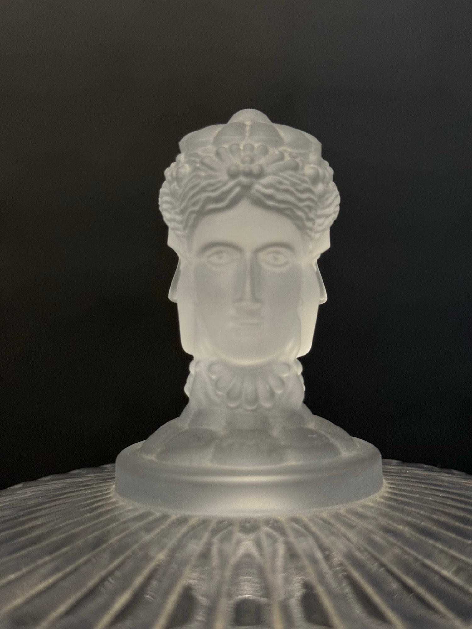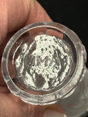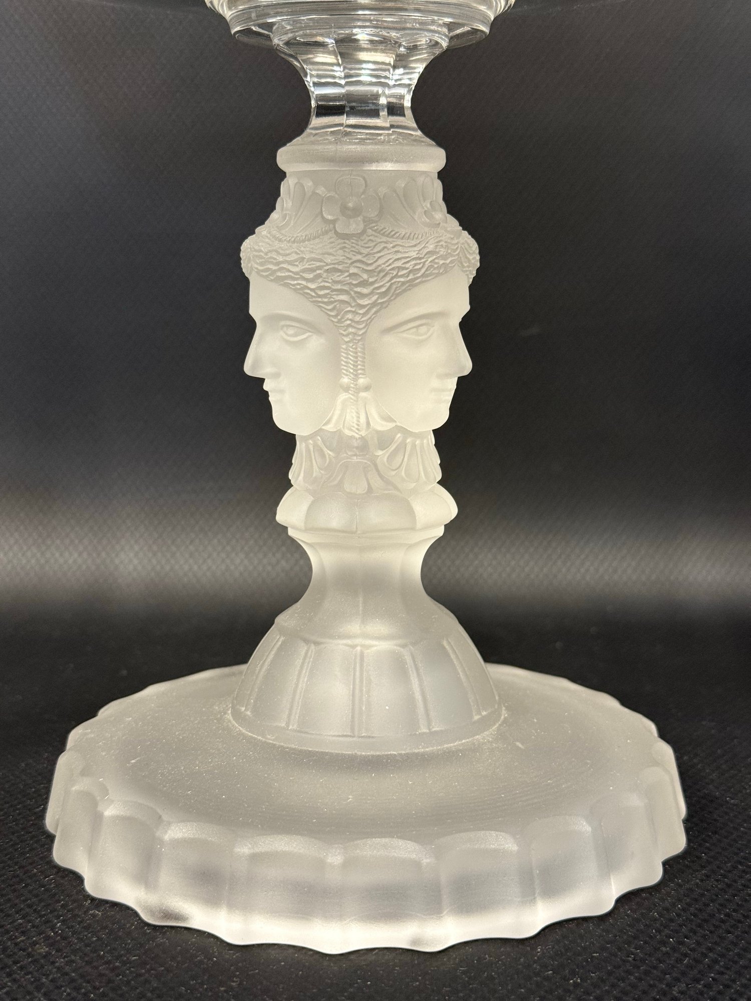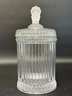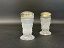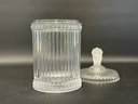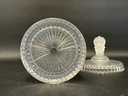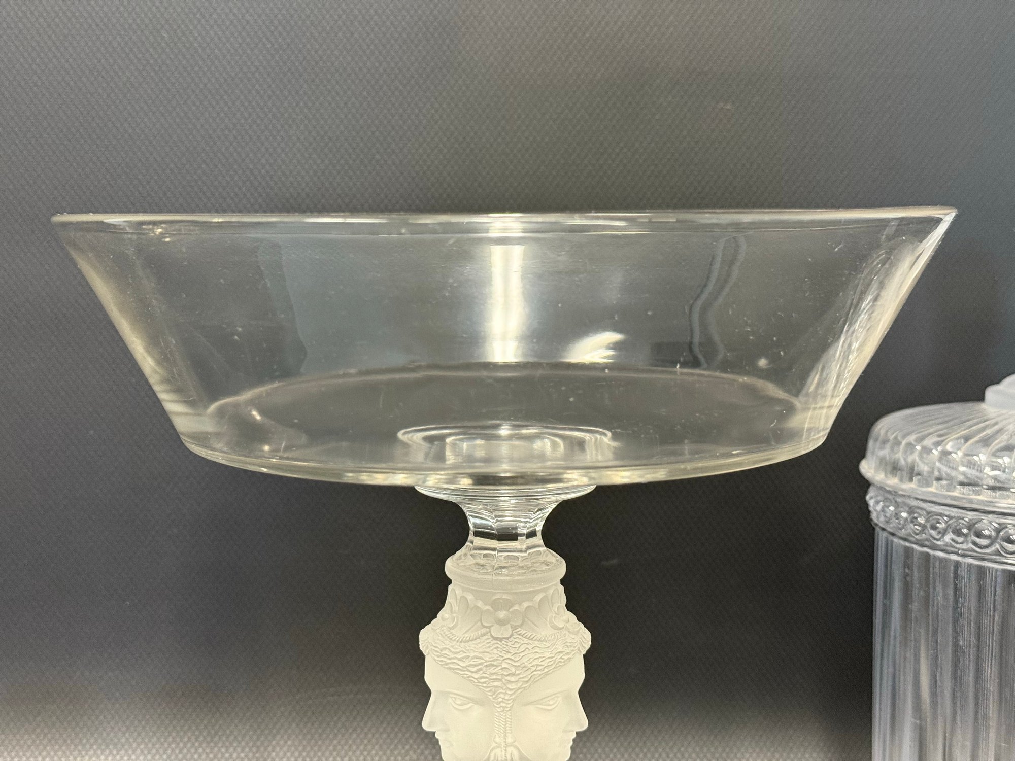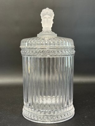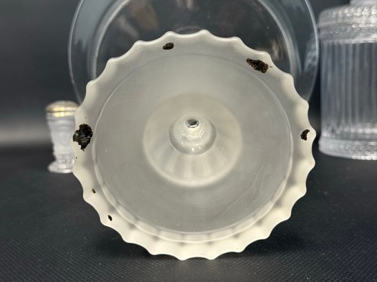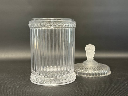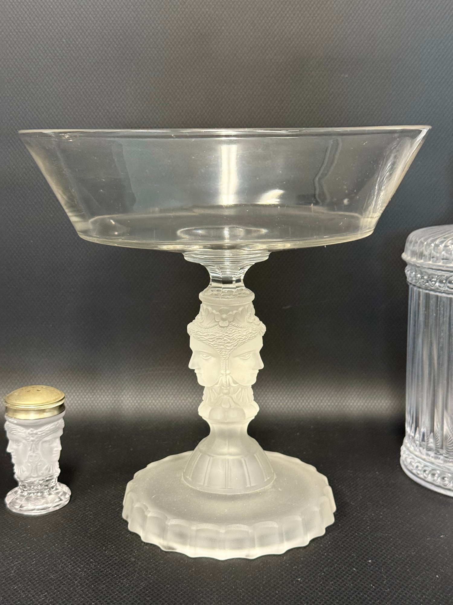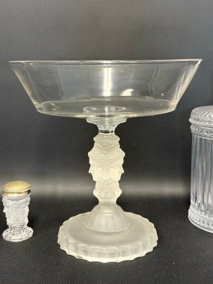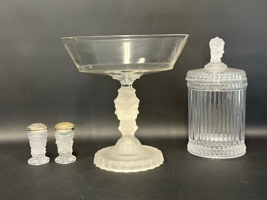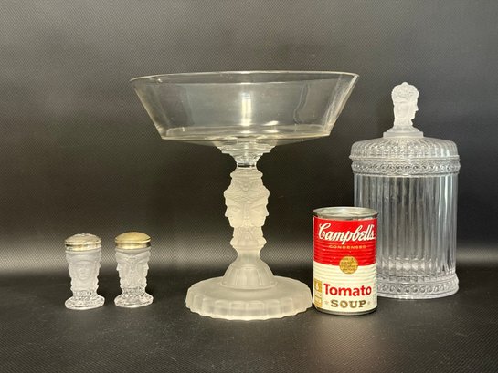 A selection of vintage and reproduction pressed and frosted glass, including a Duncan Miller "Three Faces" compote, and two reproductions by the Metropolitan Museum of Art: salt and pepper shakers and a lidded jar. All items are in very good condition. Please see pics. Compote, approx. 8-9" tall. All others, unmeasured; see pics for scale.