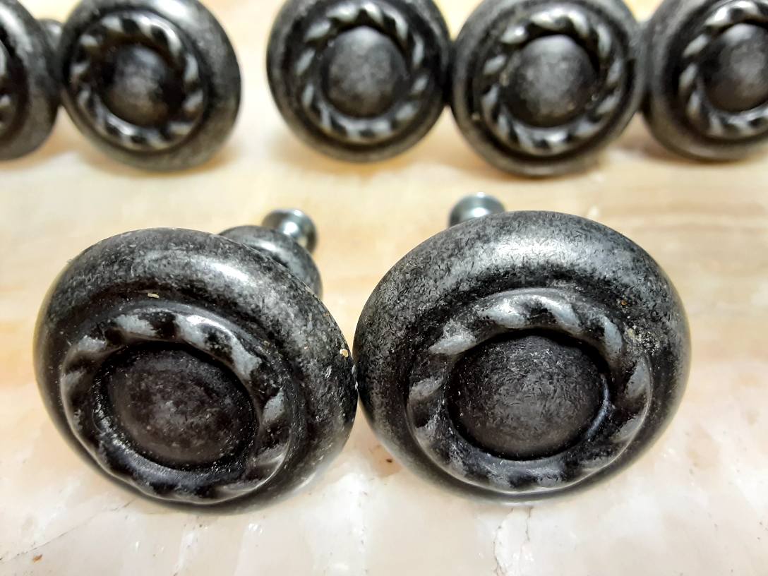 They have an antiqued silver finish and raised rope edge detail around a center raised button