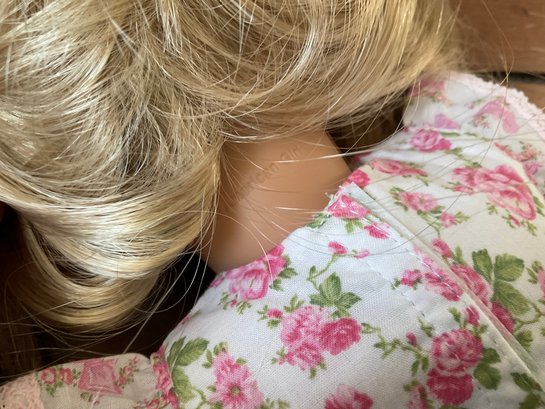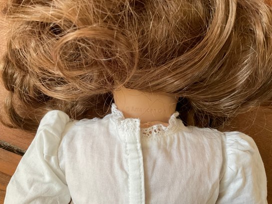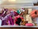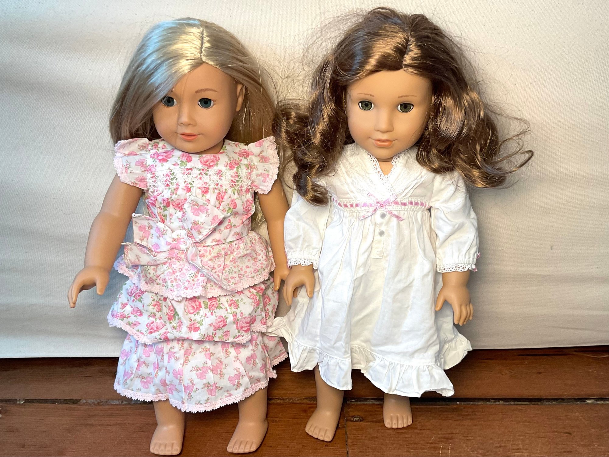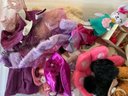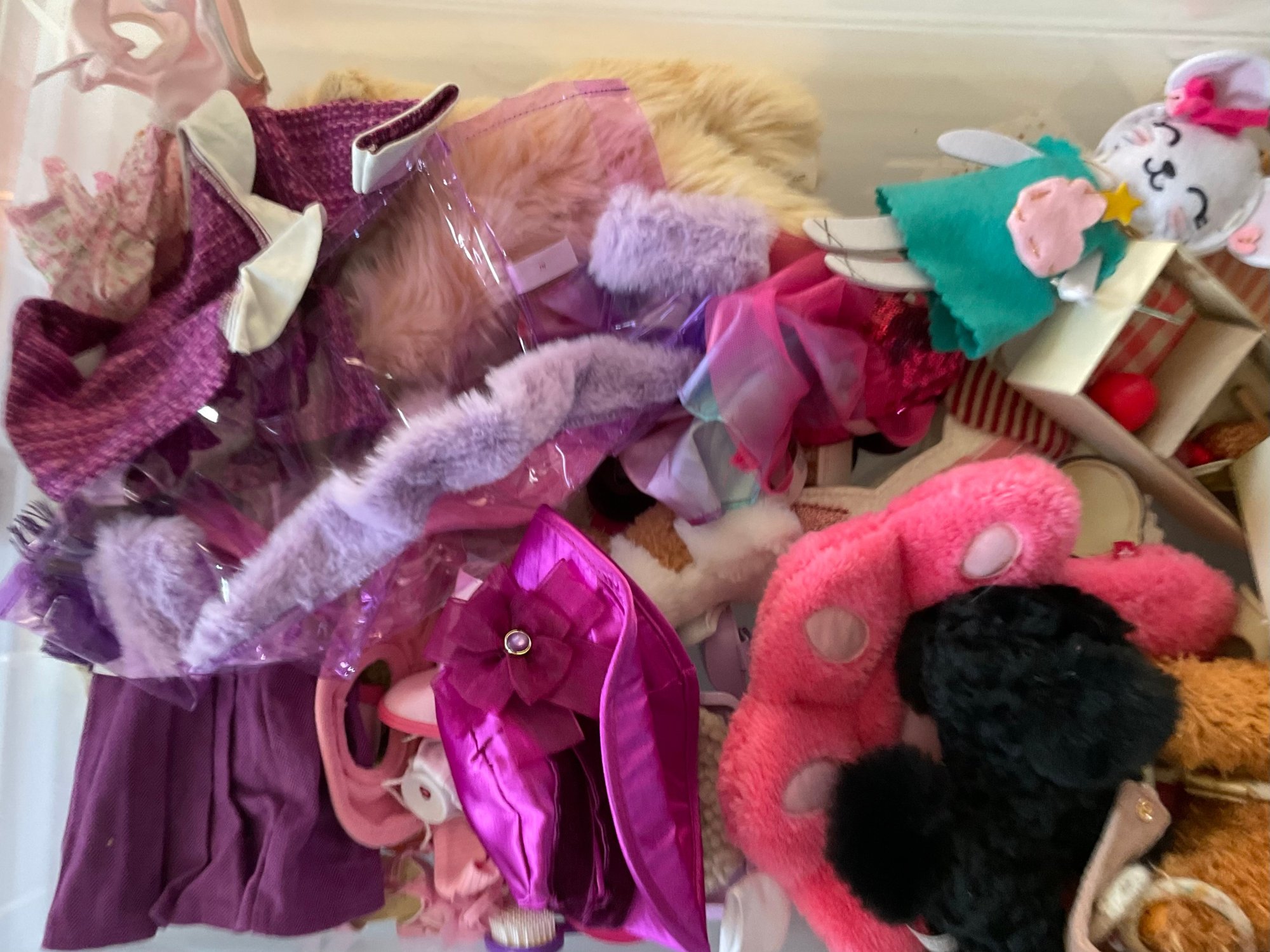 The blond doll, likely historic character Rebecca Rubin, is adorned in the Garden Party dress. The brunettte is likely a “Truly Me” model, and is dressed for bed. Both labeled “American Girl” on the nape of their necks. The bin contains clothing, accessories, and an assortment of other non-AG toys.