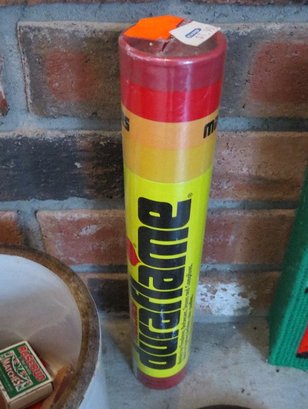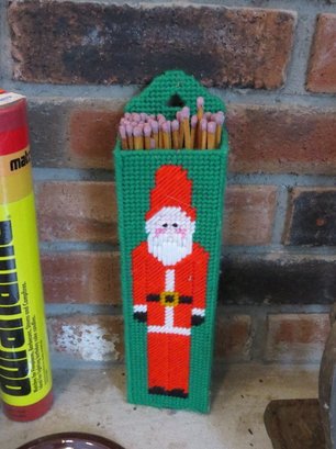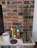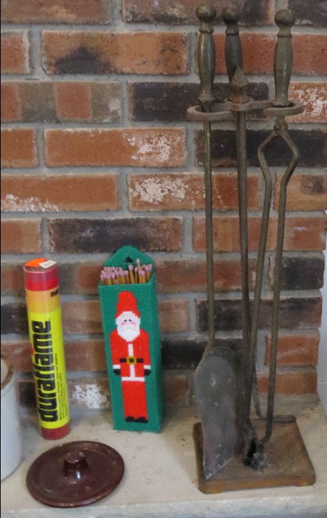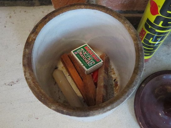 Art's & crafts style hammered fireplace set along with starter matches, a small crock with more matches & candles, etc.