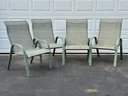 A set of four stackable outdoor sling chairs in green with metal frames and mesh seats in good used condition with minor finish loss. The chairs were garage stored; would benefit from a scrub prior to use. Please see pics. Approx. 39" tall, 26" wide arm-to-arm, 27" deep.