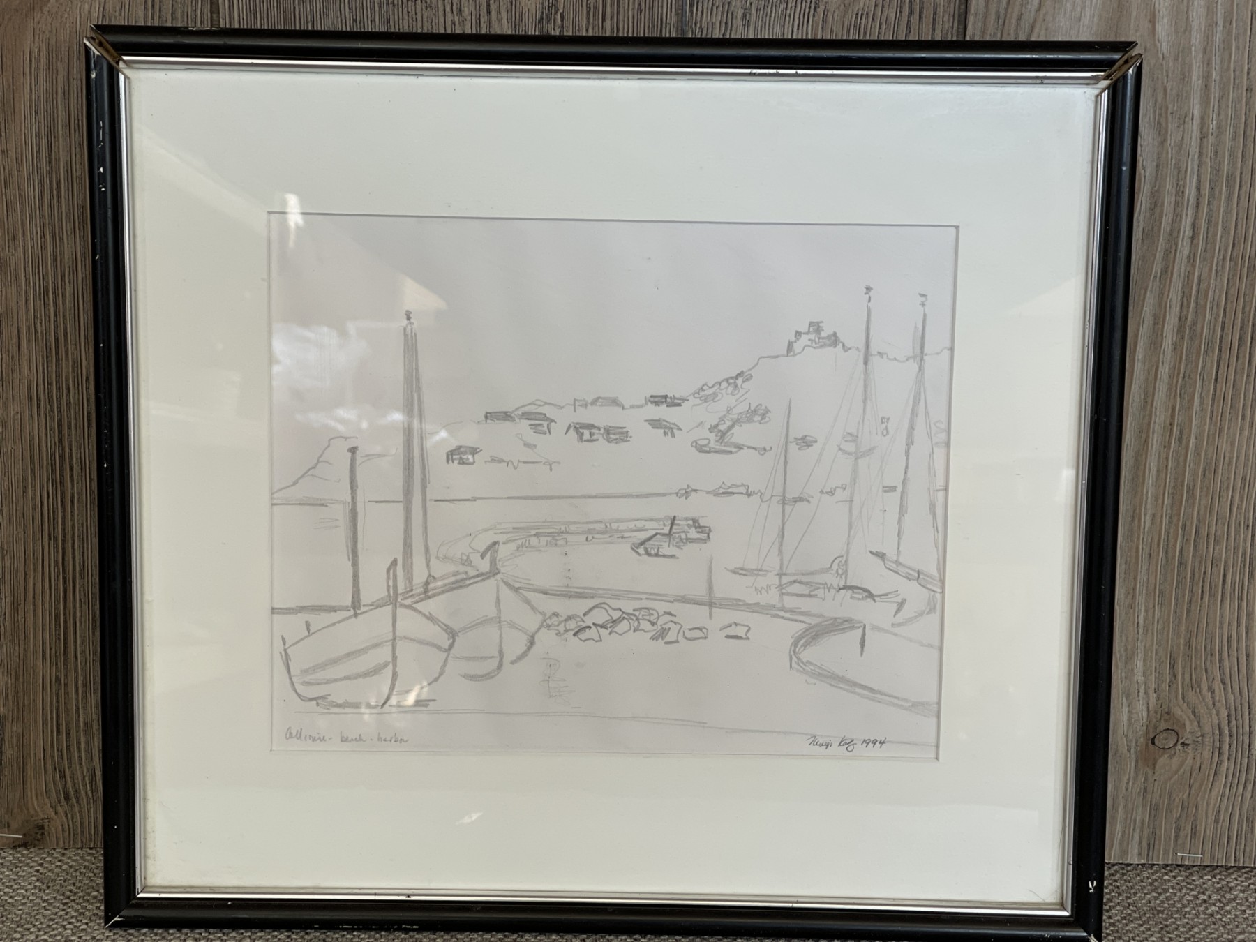 A signed drawing from 1994 of a harbor. Can’t make out signature. Frame needs to be replaced. It was framed by Accent on the Art Company on Madison Avenue NYC.