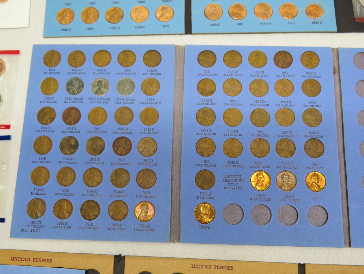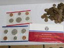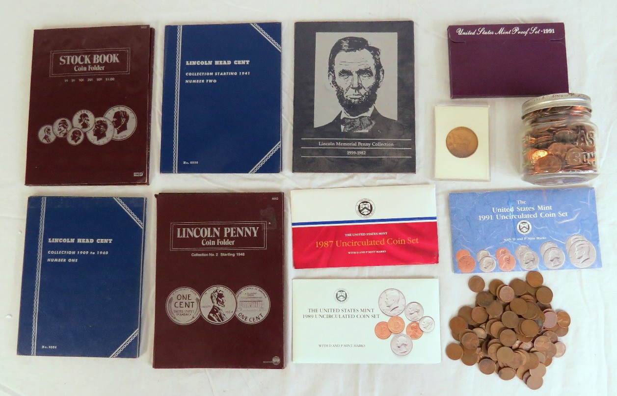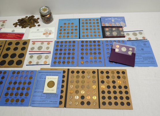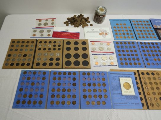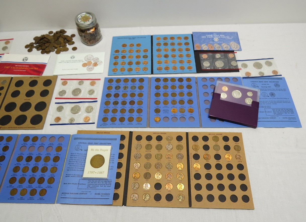 A small coin collection including Whitman binders of US Wheat Cents, a few Indians, type coins, US Mint Sets from 1987, 1989 & 1991, a US Proof Set 1991, a pile of loose wheaties, another small jar of memorial cents that look to be all copper, mostly 1960's-70's era, commemorative coin, etc.