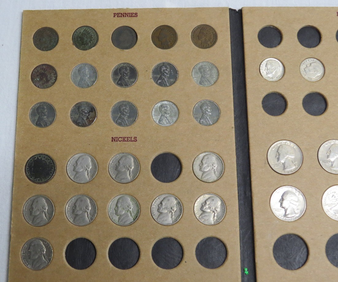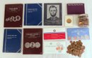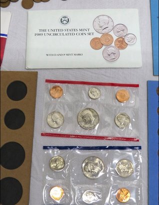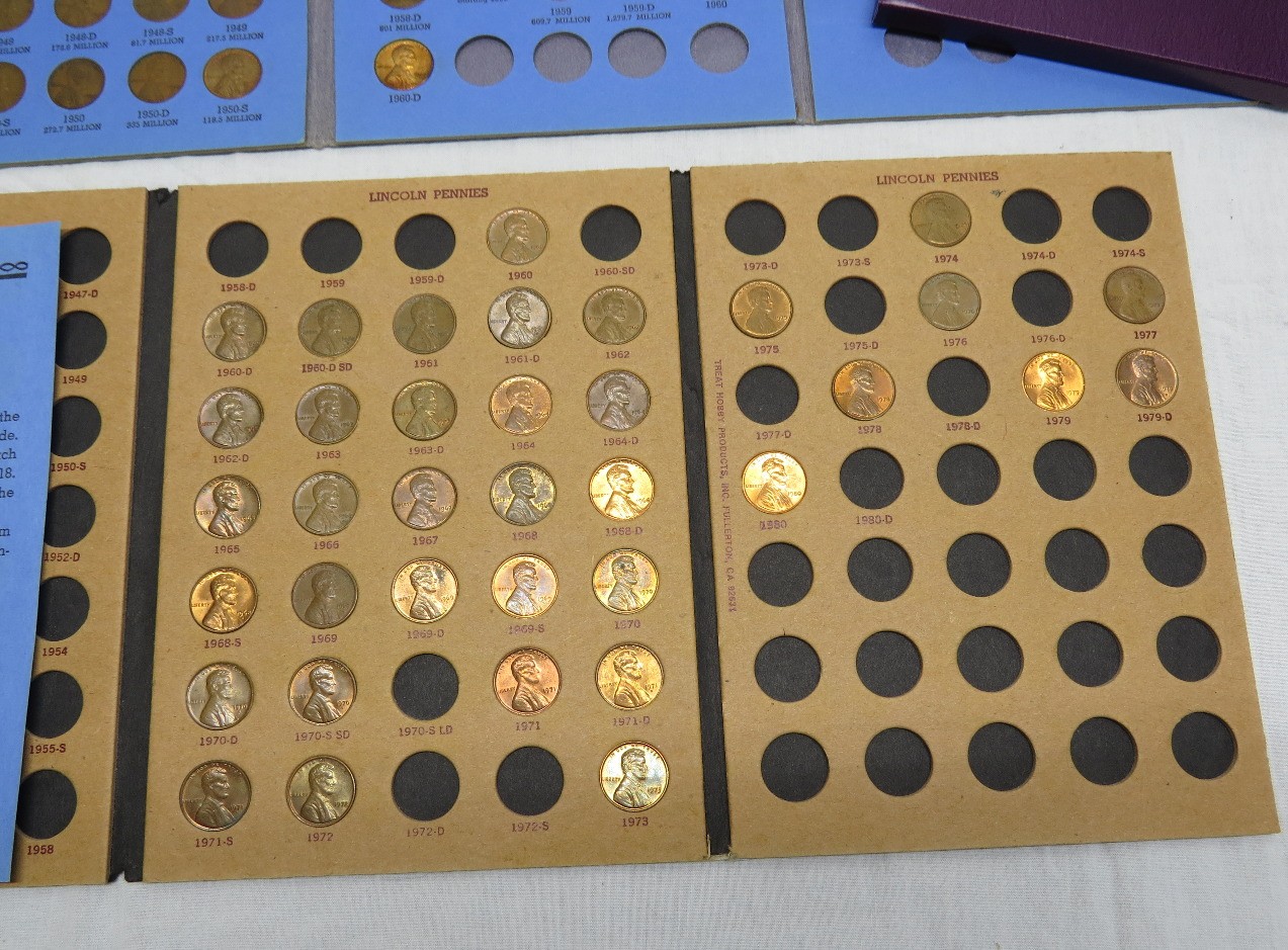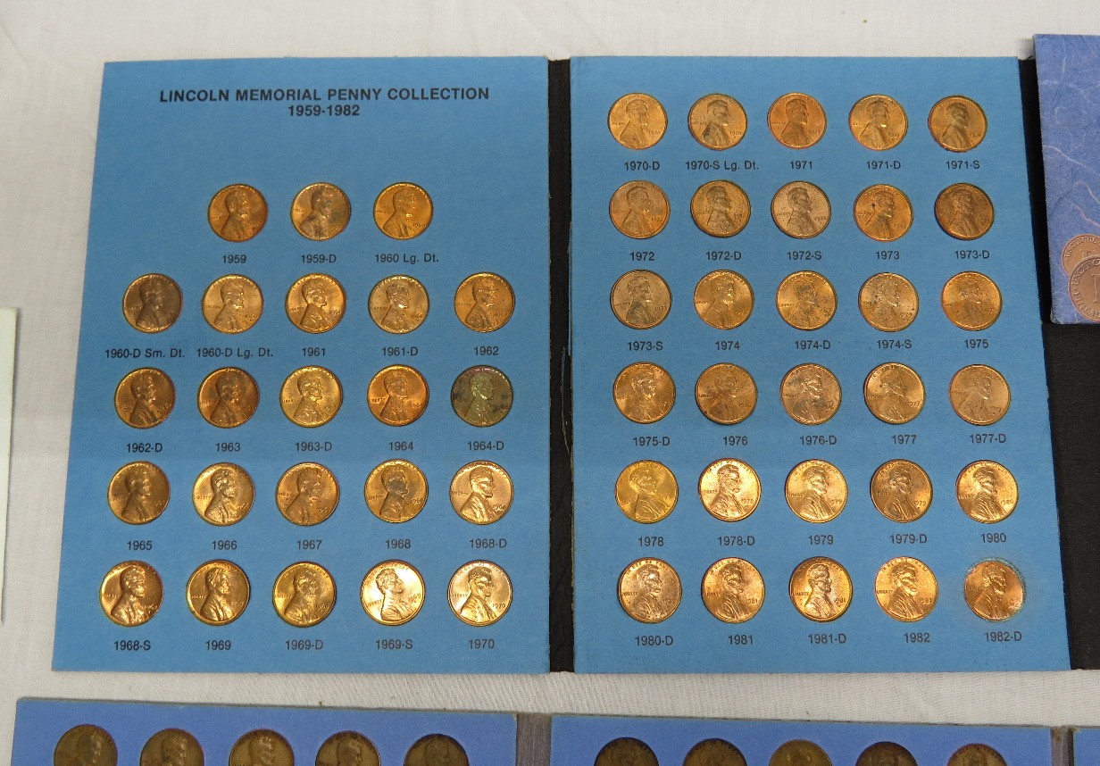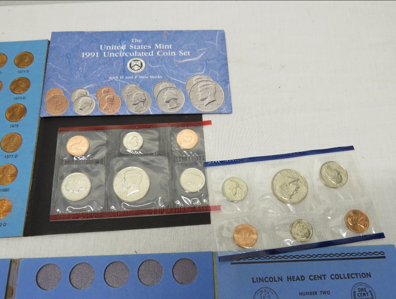 A small coin collection including Whitman binders of US Wheat Cents, a few Indians, type coins, US Mint Sets from 1987, 1989 & 1991, a US Proof Set 1991, a pile of loose wheaties, another small jar of memorial cents that look to be all copper, mostly 1960's-70's era, commemorative coin, etc.