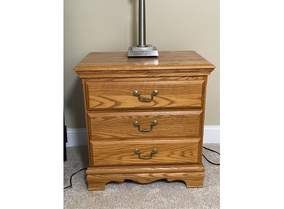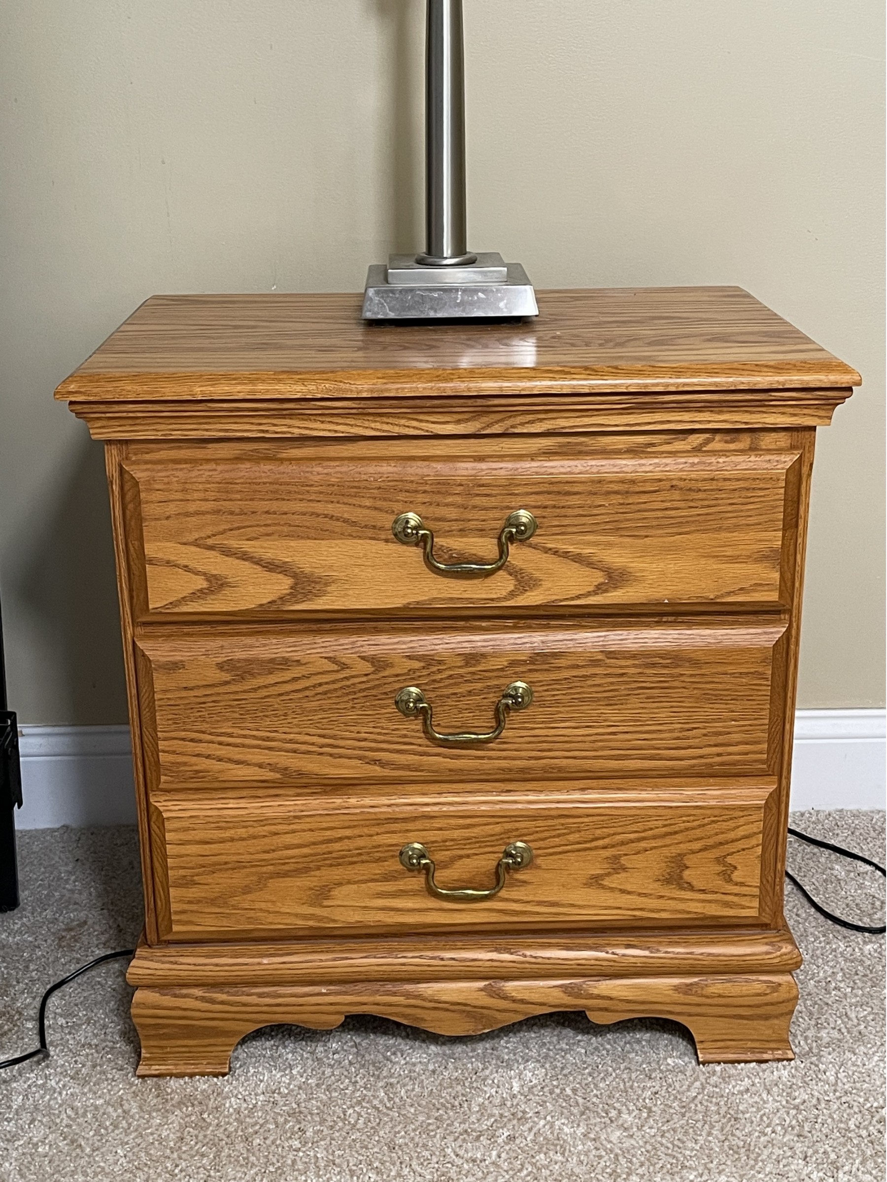 A solid oak end table with really nice grain to it. It measures 16 inches deep, 25 inches tall and 24 inches wide. In overall good condition with normal wear. Winning bidder: this item will be on ground level for easy transport. There is a matching end table in prior lot. There is also a matching armoire and long dresser in separate lots.