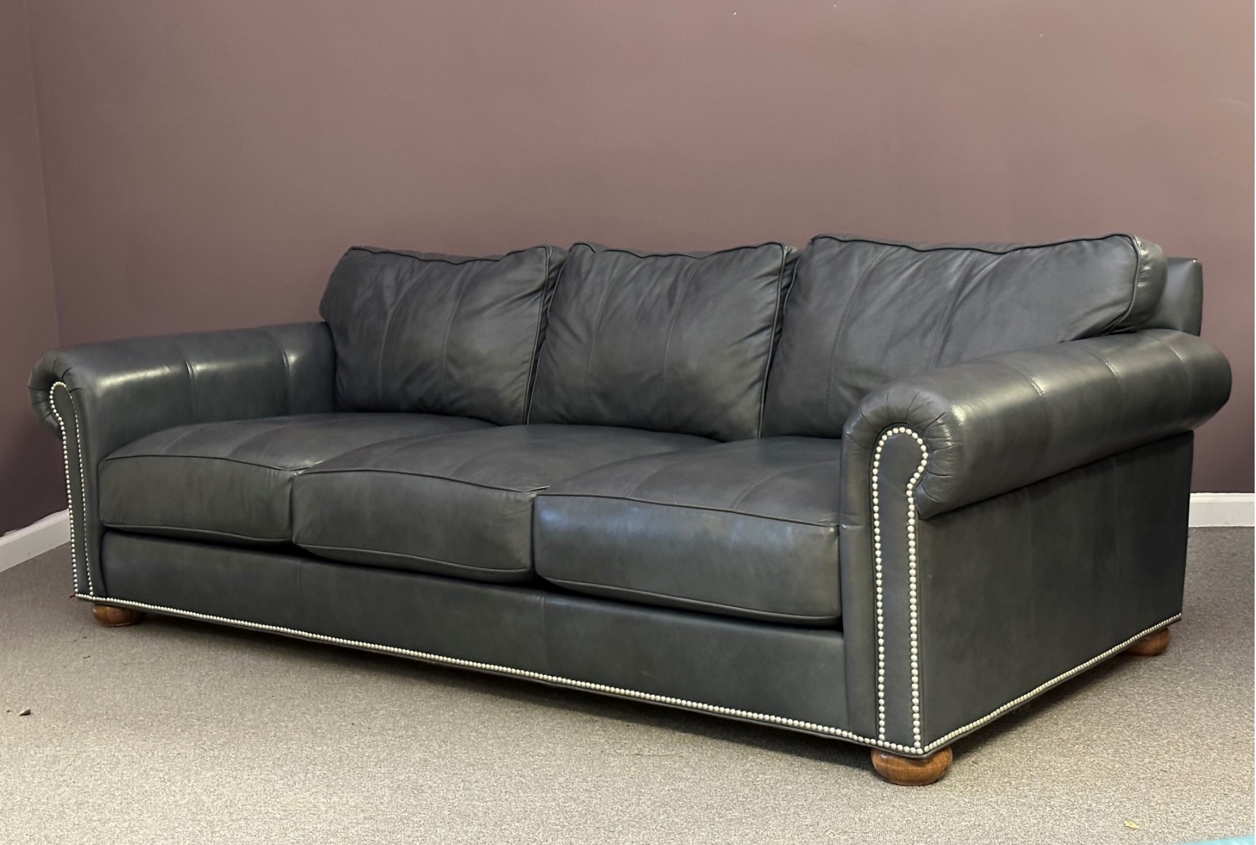 A stylish, transitional three-seat leather sofa by Ethan Allen featuring rolled arms, nailhead trim, loose cushions, classic bun feet. It's a beautiful, comfortable piece in very good condition. The leather is a blue-gray tone. Note: There is one spot of wear to the top of the welting on the backrest which is shown in the pictures. There is a very small seam tear where one of the pillows attaches to the back. Please see pics. Approx. 30" tall, 95" long, 43" deep. Winning Bidder: The is a large, heavy piece. Please be sure to bring help and an appropriately-sized vehicle to move, pack and load.