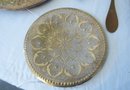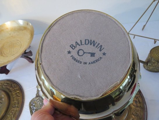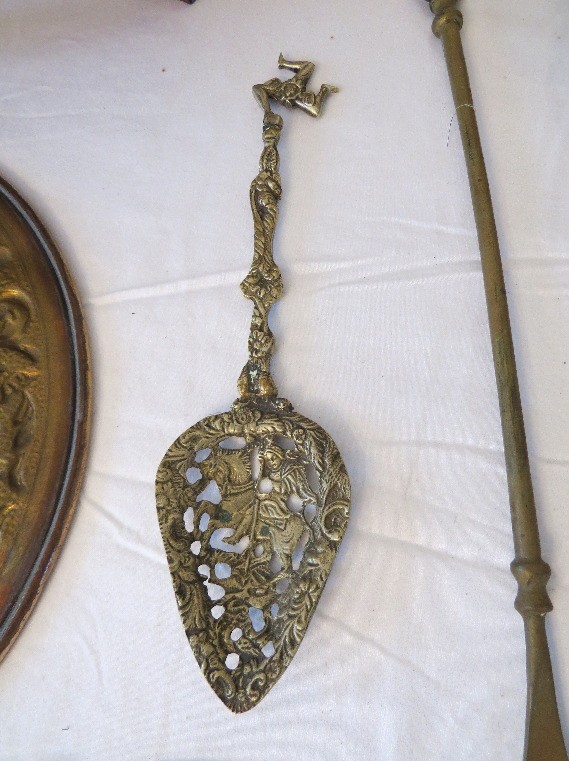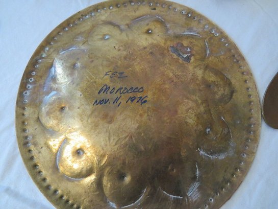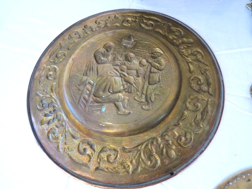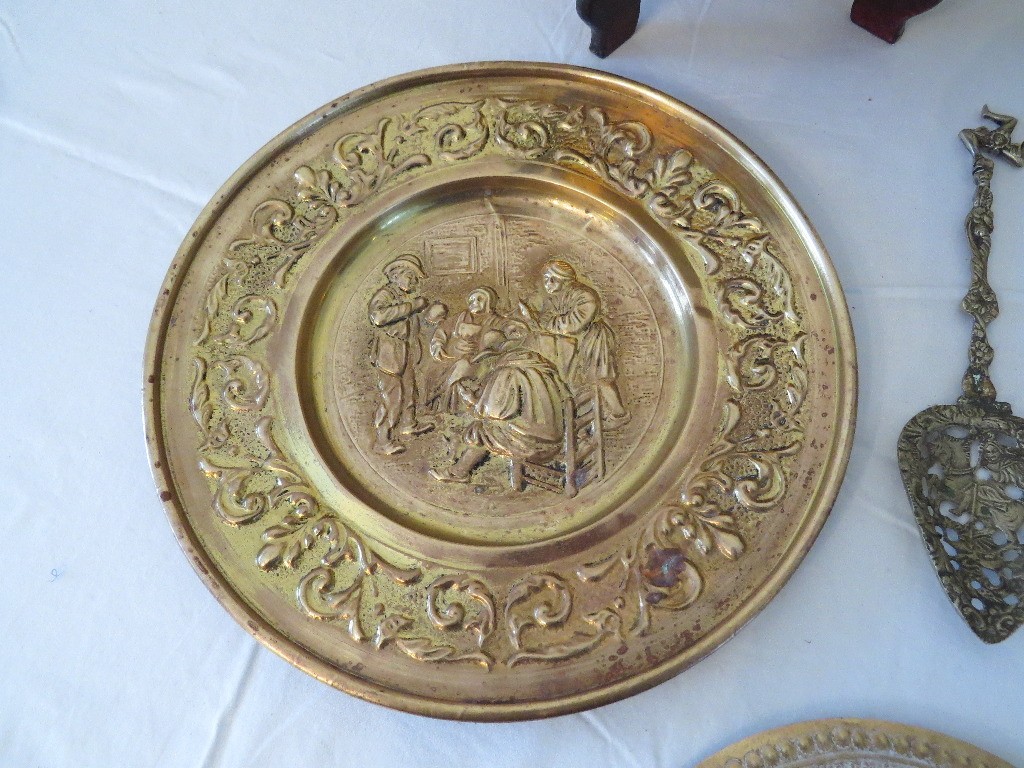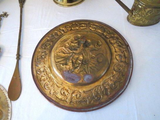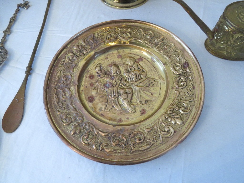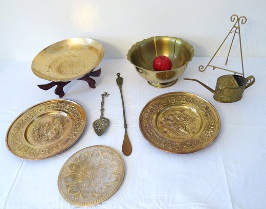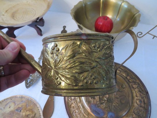 Decorative brass table lot including repousse brass wall plates from Holland, purchase c.1955 plus Indian Brass bowl on stand, watering can & other accessories.
