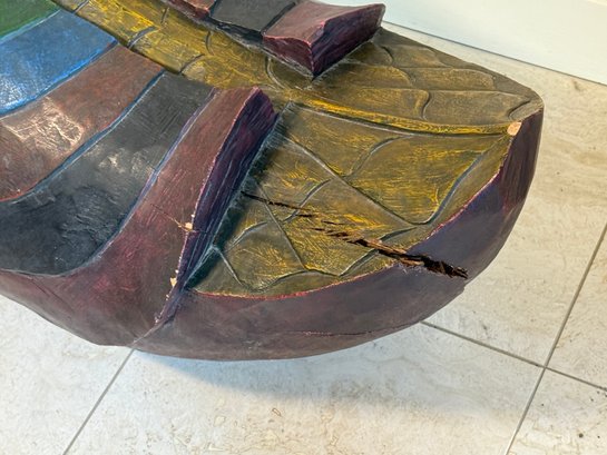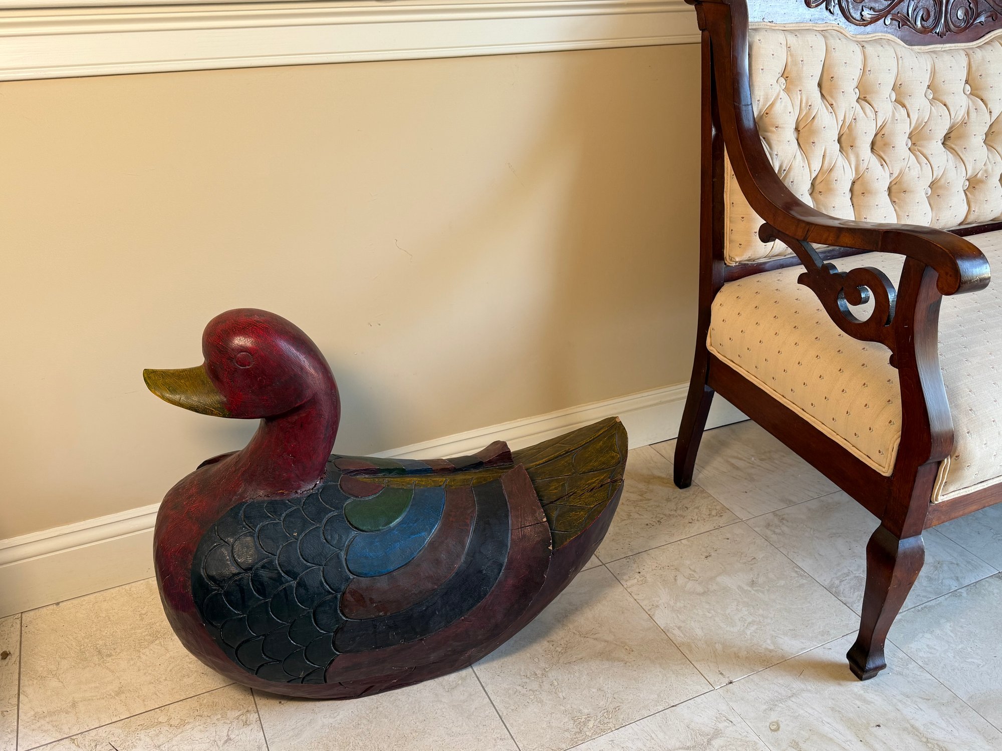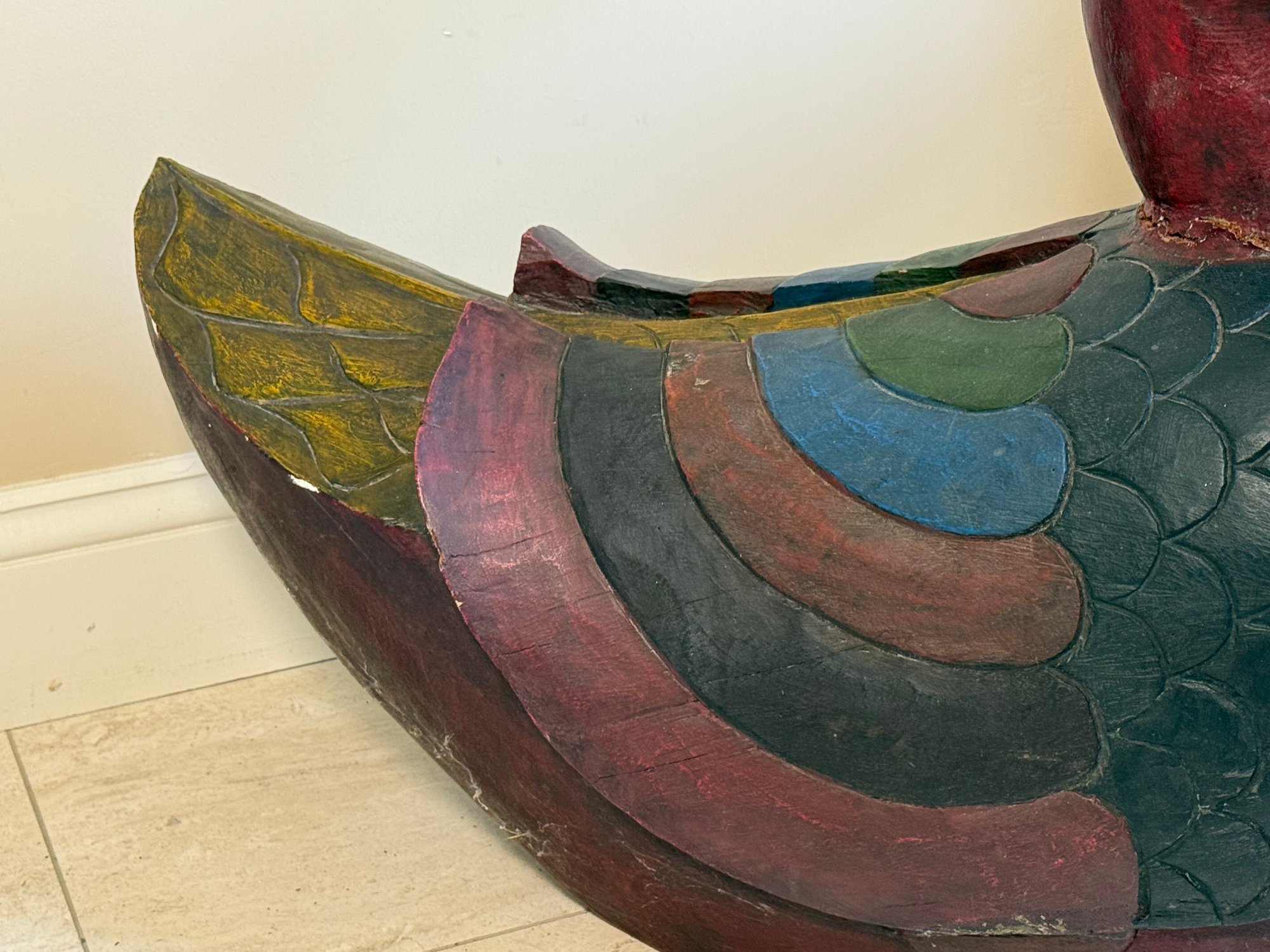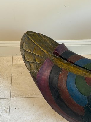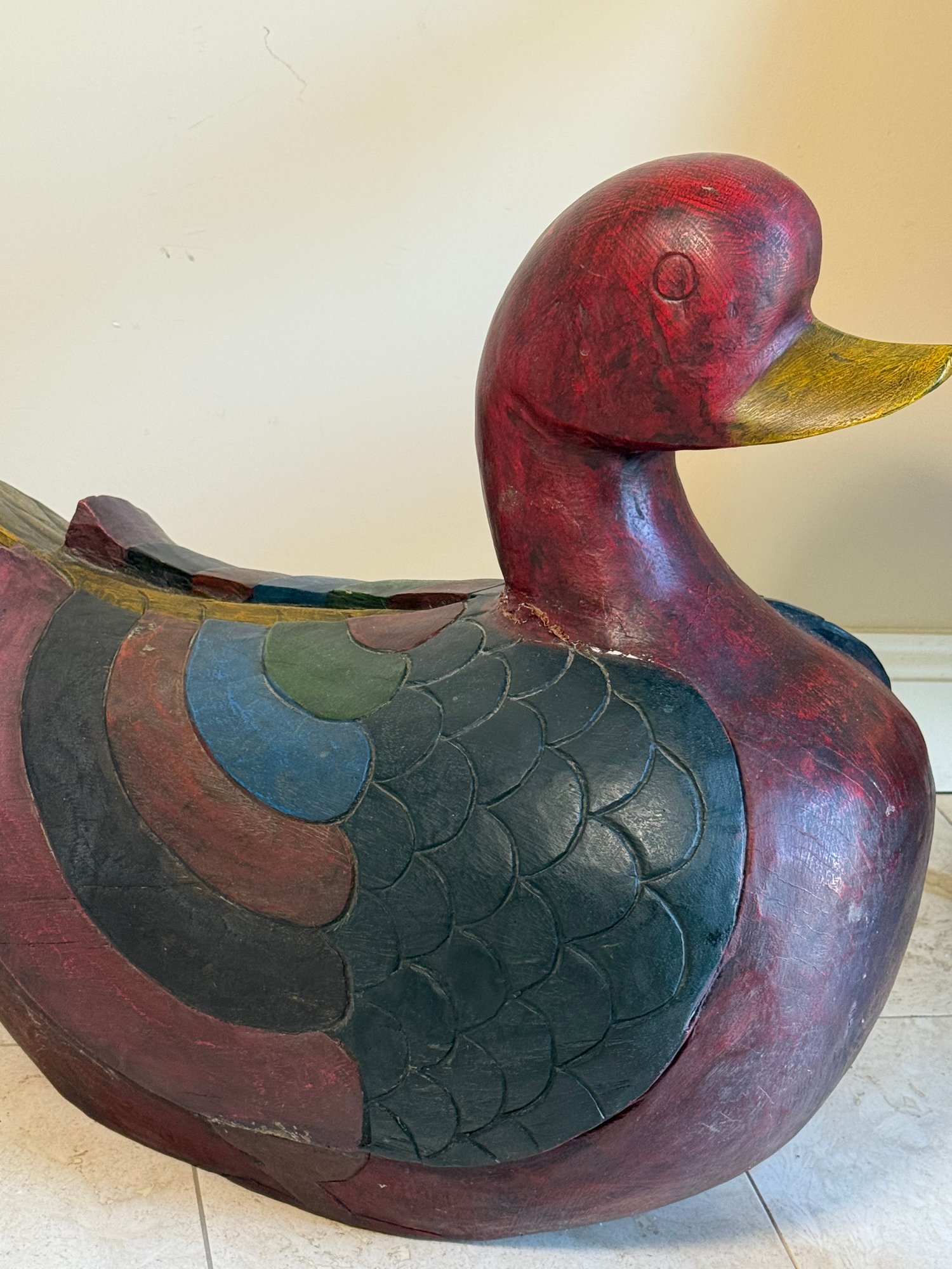 This fabulous carved wooden duck statue makes a statement! It had incredible detail and its heavy weighted and quality made. As you can see, it has normal vintage wear such as cracks (in fact) and paint fade.
