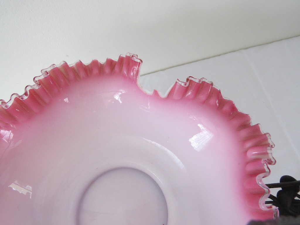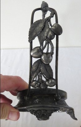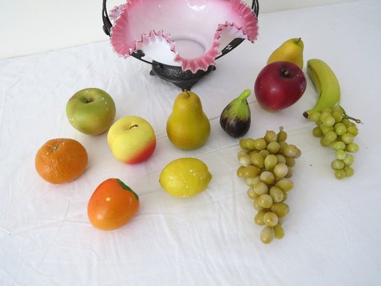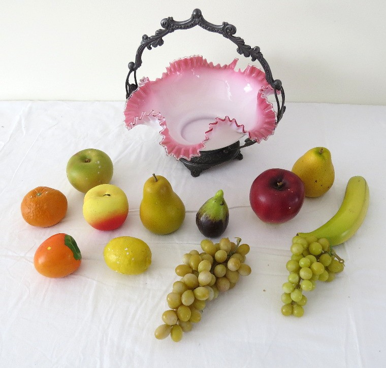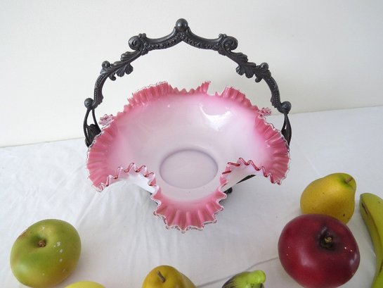 A Victorian era Brides basket in pretty pink colors, with assorted plastic and wooden fruit. There is a decent ship out of the bowl, which the fruit conceals well. Figural spelter frame features wild cherries.
