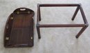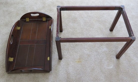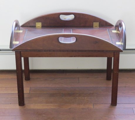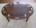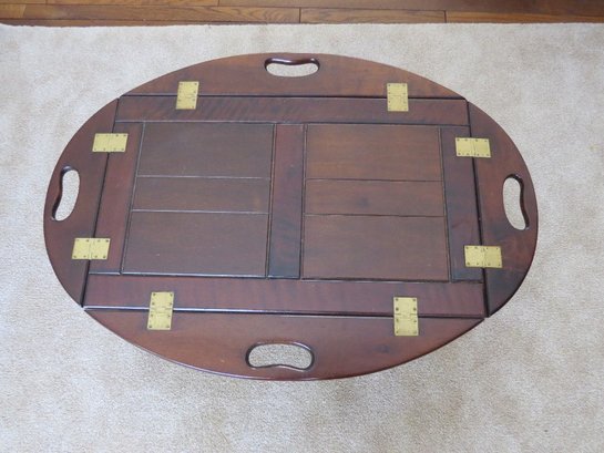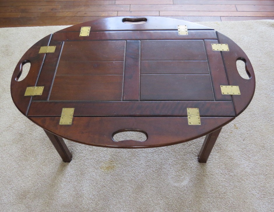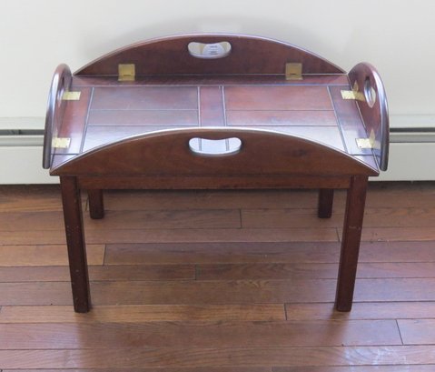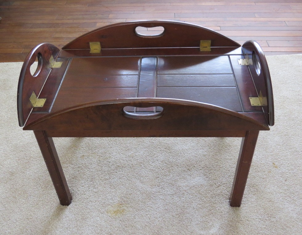 Vintage wooden butlers table with brass hinges, measuring 35" x 25" by 16" height with leaves down, and 28" x 18" x 16" leaves up.