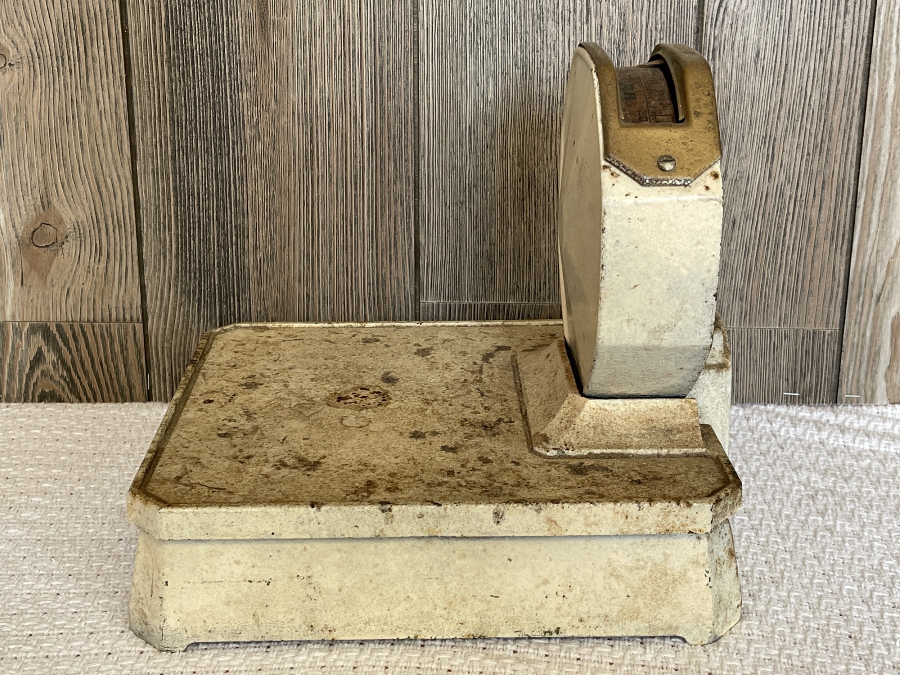 A vintage Detecto scale. Base is 10.5x9x2.5 inches. Top part is 6.5 inch diameter. It has wear to it as seen in photos. Adds to its charm!