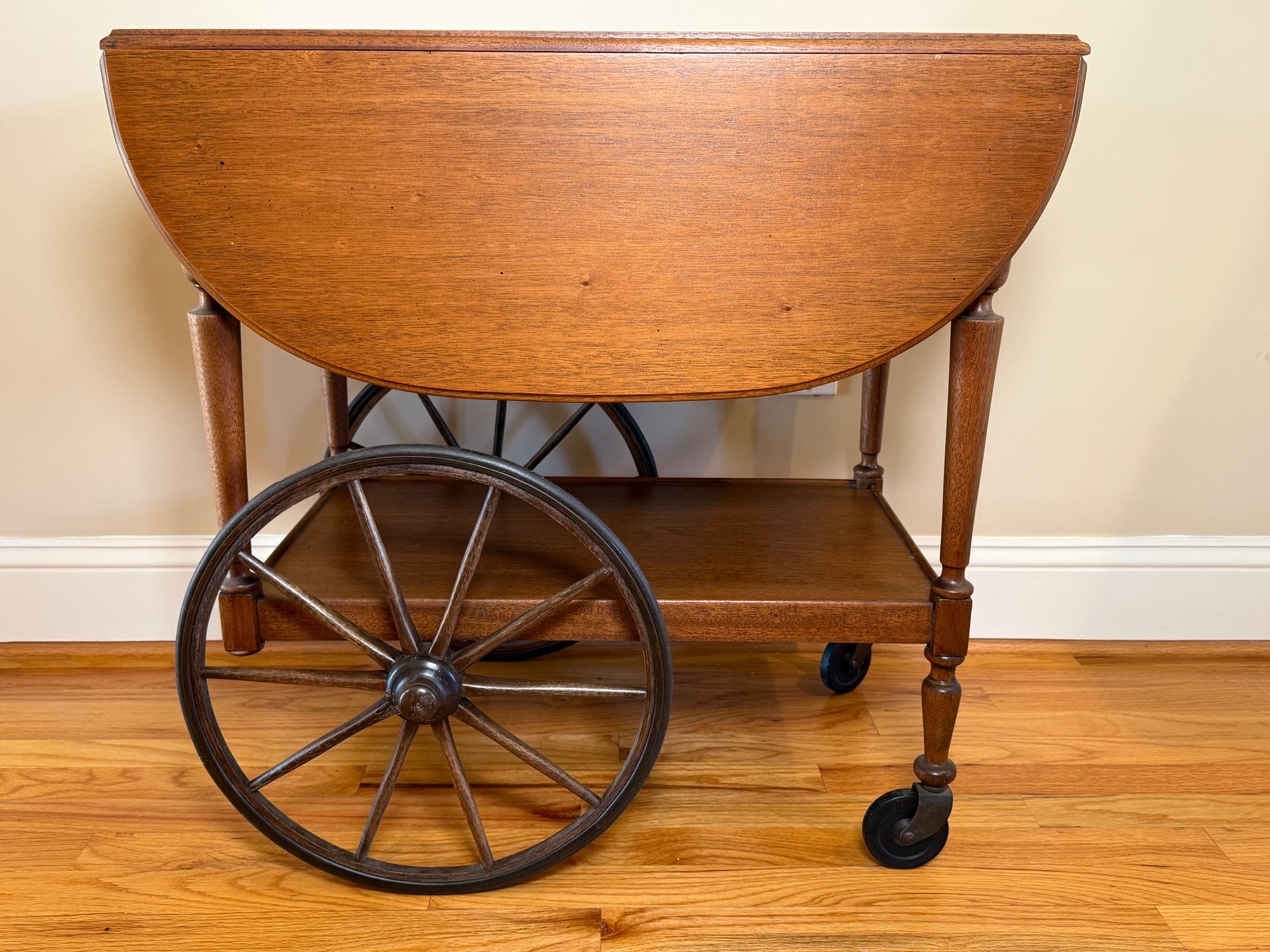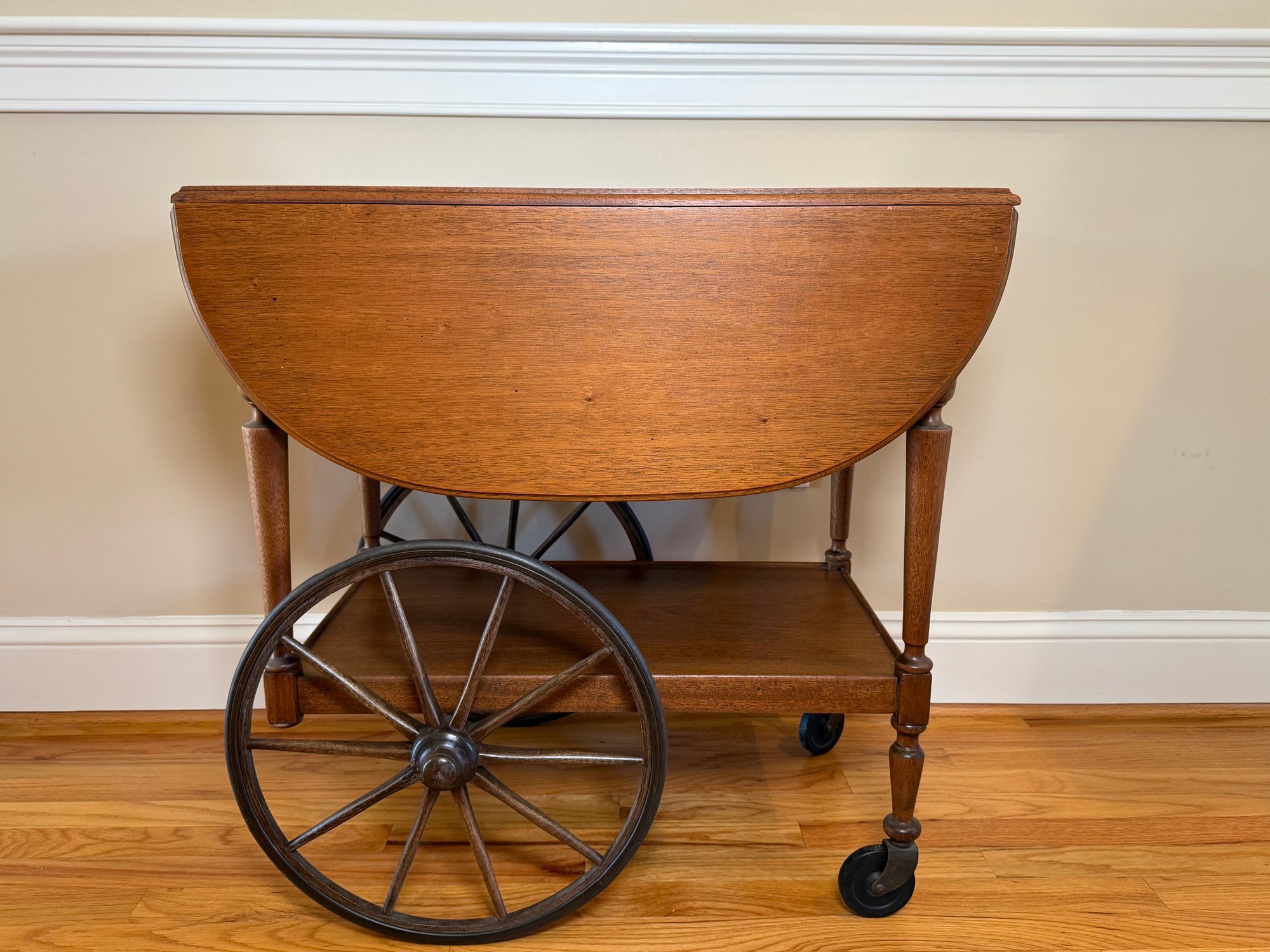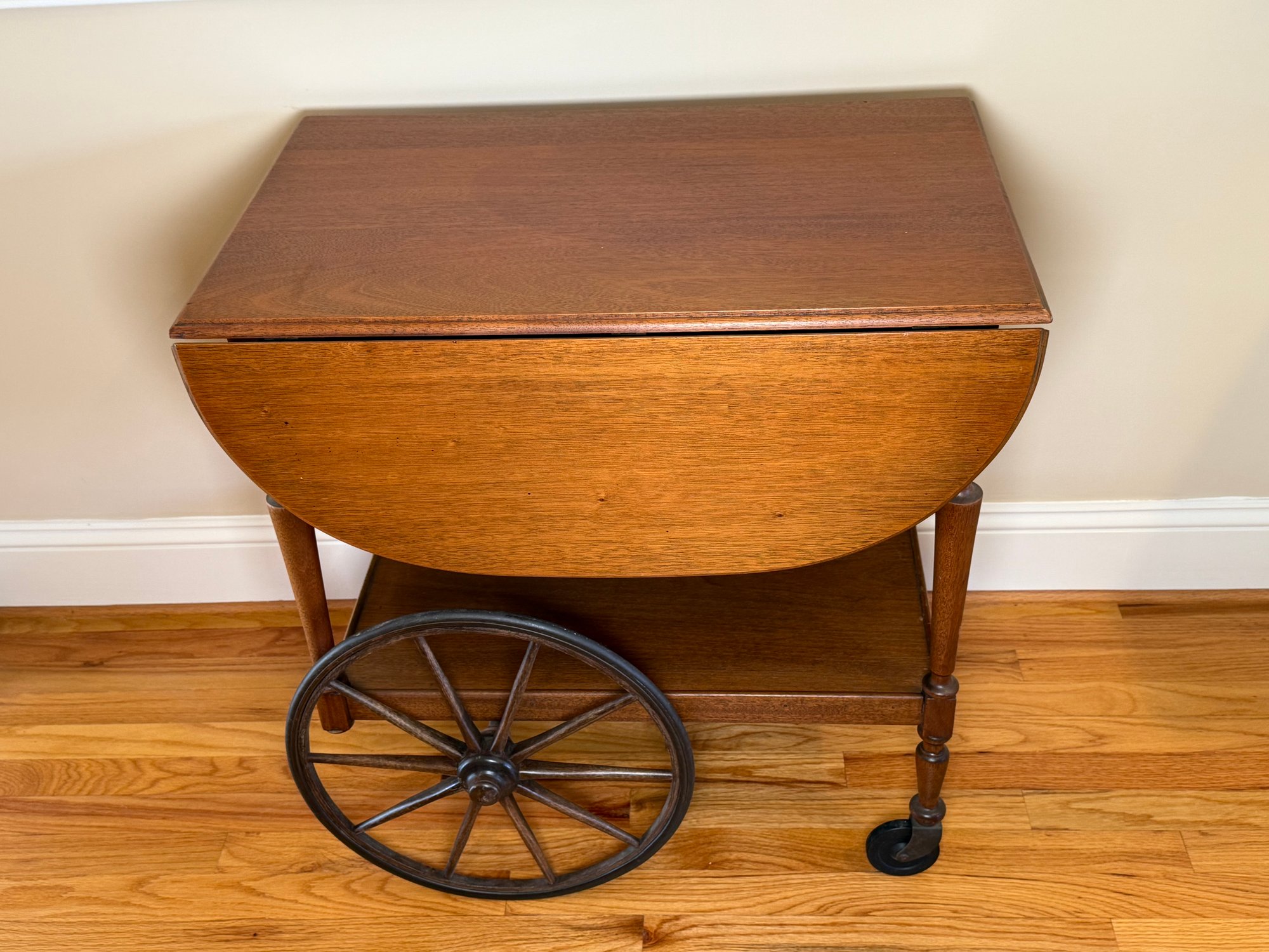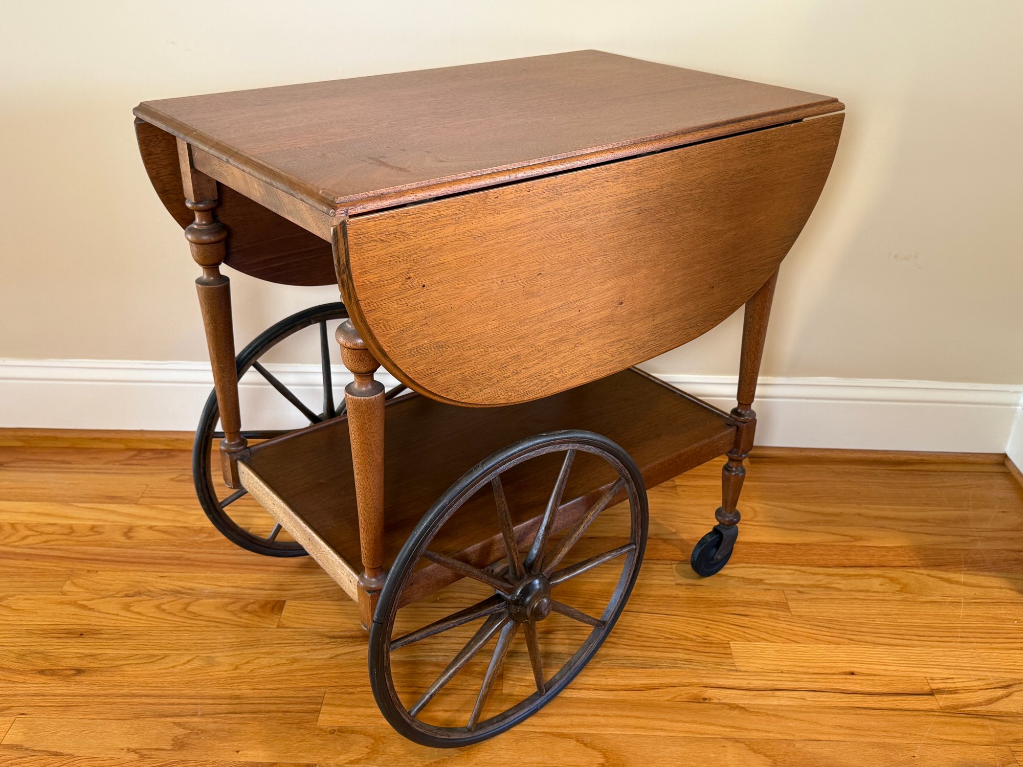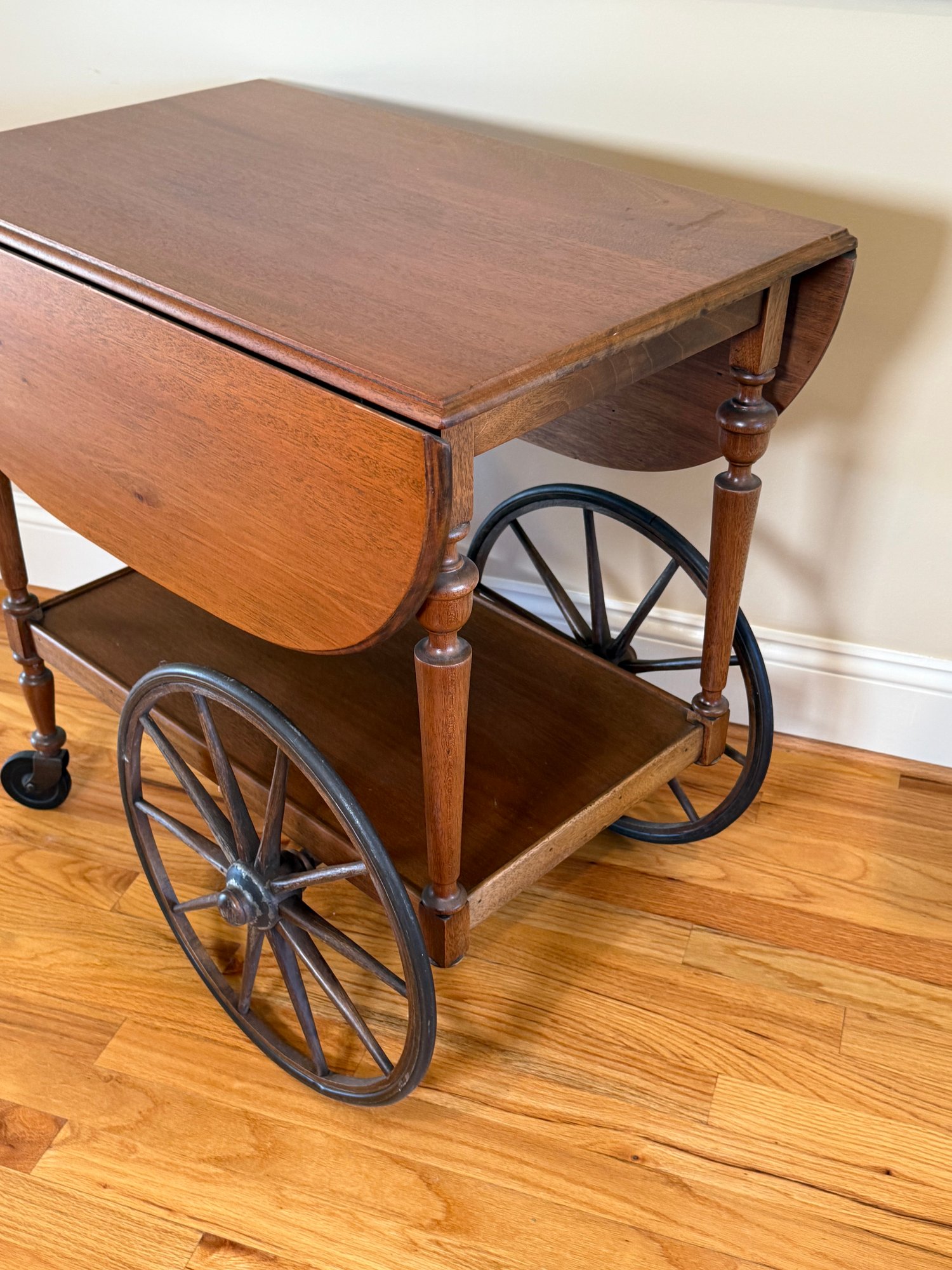 A beautiful vintage drop leaf tea/drink cart that sits on casters with two sides that fold down and then back up when you need more surface area.
