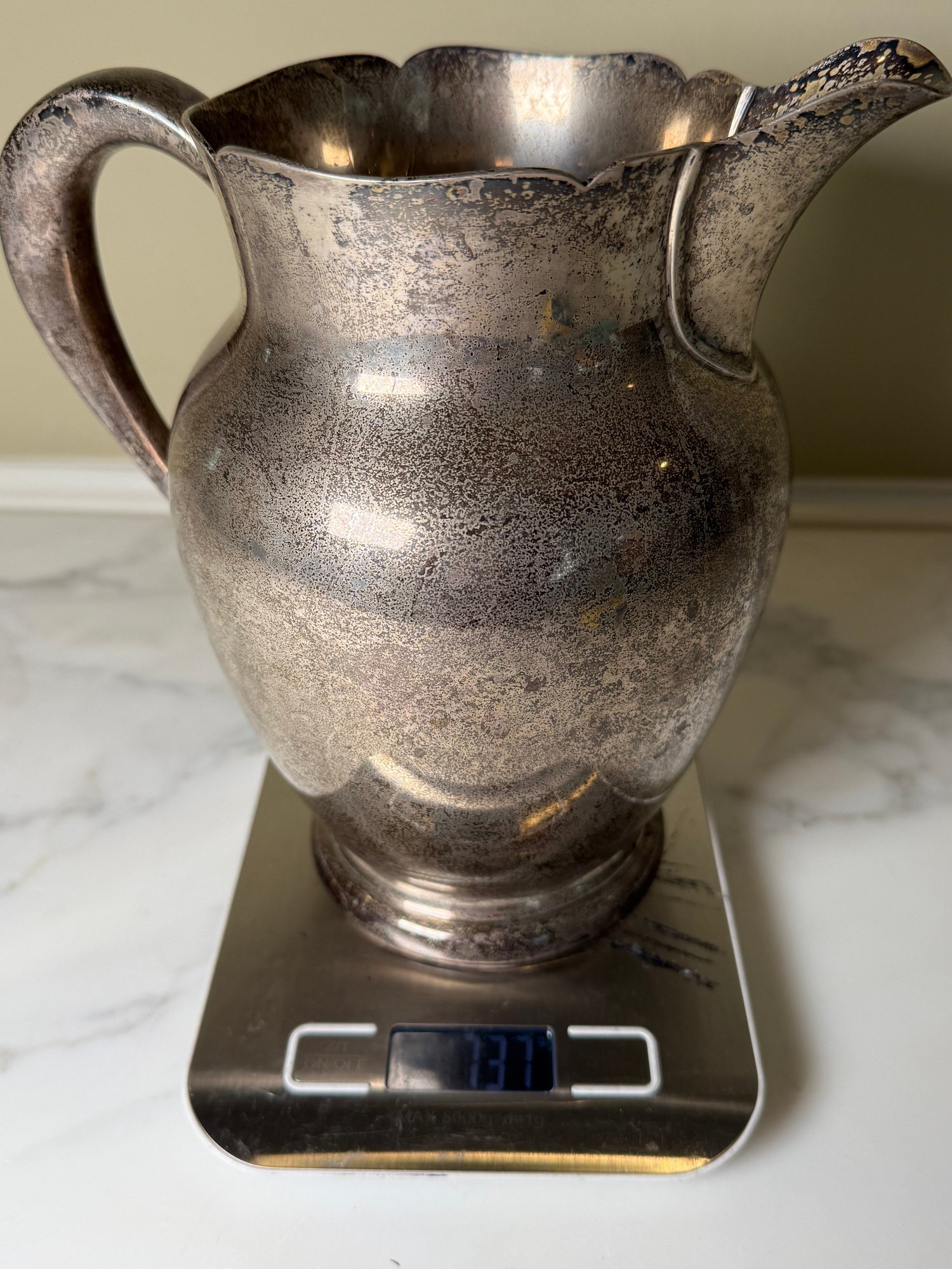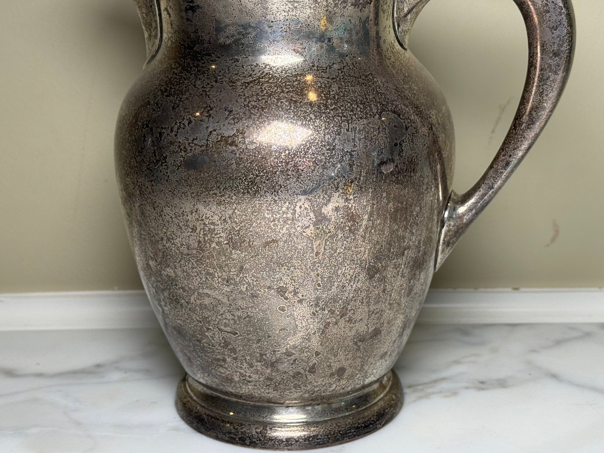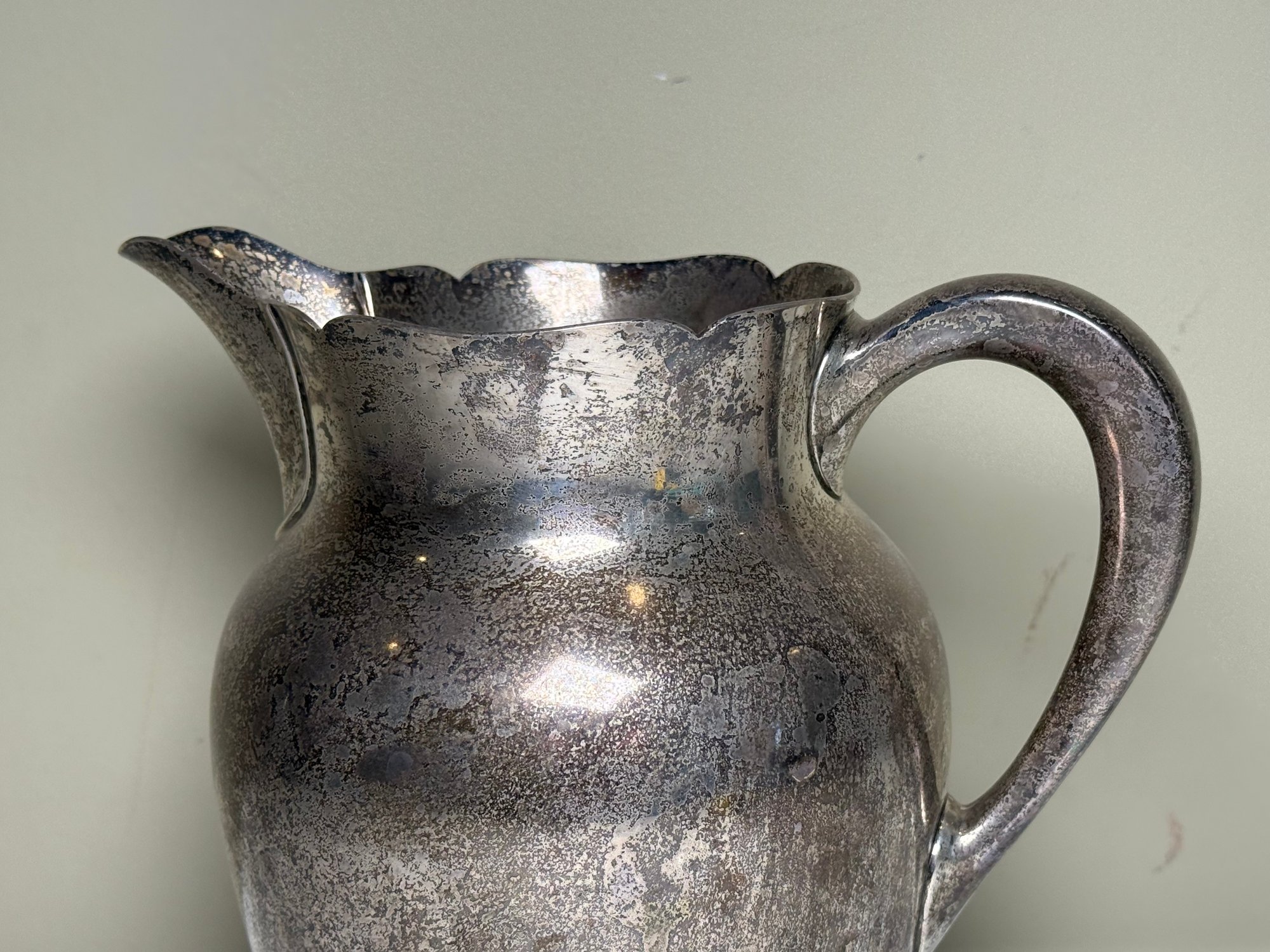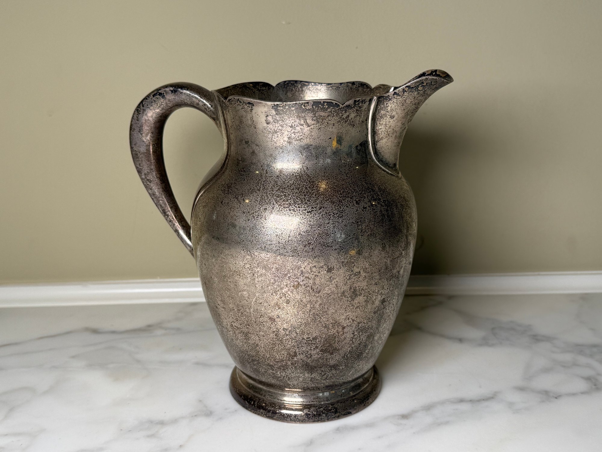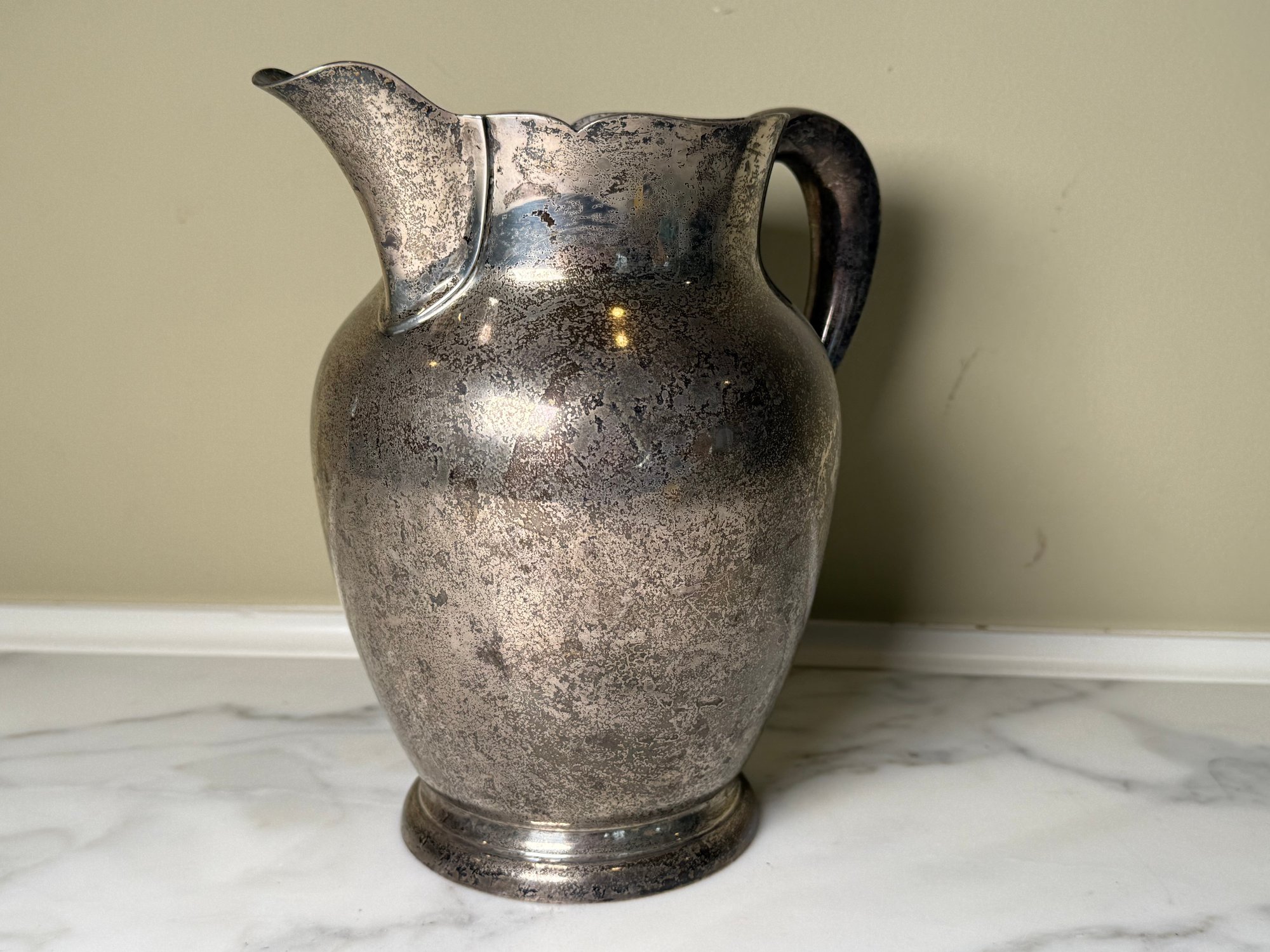 This beautiful pitcher was made by Kirk & Son. It needs a good polishing.
