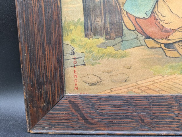 This framed artwork is a lithograph showing three Dutch Fishermen and was created by the Dutch artist Jean Charles Louis Landré (1875-1952). It depicts three Dutch fishermen and a child in traditional attire on a dock in Volendam and would have been painted in the early twentieth century.