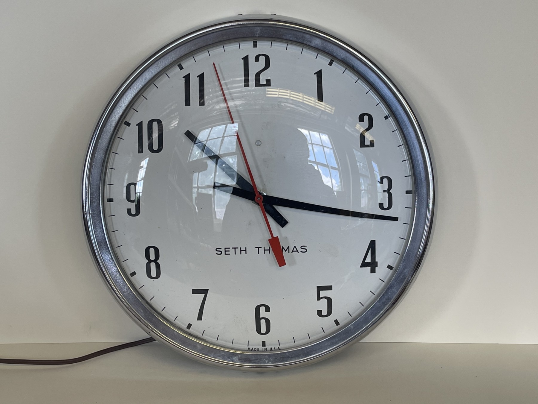 A Vintage Seth Thomas Clock Made by Talley Industries Company in Thomaston CT. Untested. It measures 14 inch diameter.