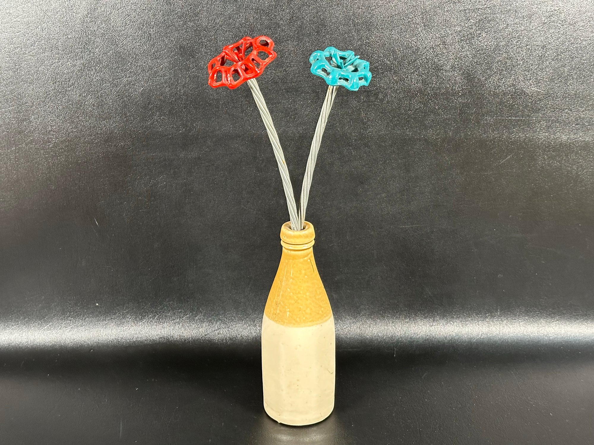A whimsical art piece featuring red and blue flowers with metal spigot handle blooms on heavy-gauge wire cable stems, set in a two-toned ceramic bottle vase. It's truly charming and it's in excellent ready-to-display condition. Please see pics. Approx. 16" tall