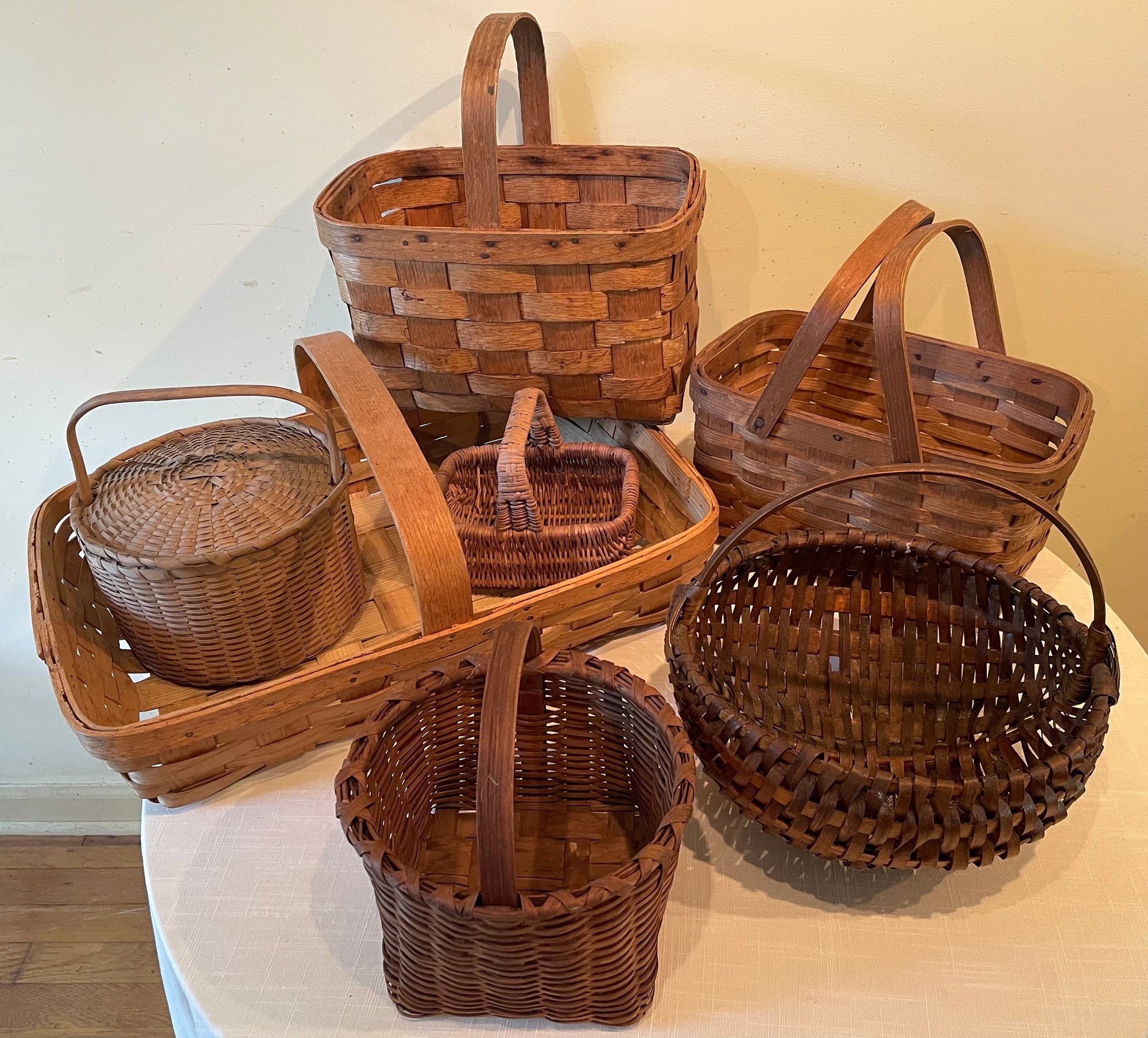 A great group of vintage baskets - love the round one with the top that slides up and down. They're all great and so useful to have around. The flat basket is 19" long and 12 1/2" wide. The smallest one is 6 1/2" long by 5 1/2" high.