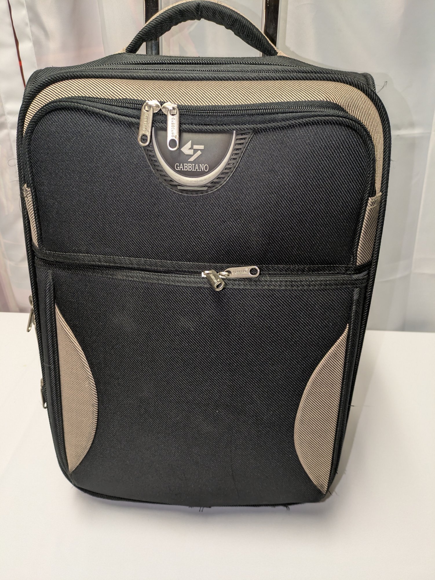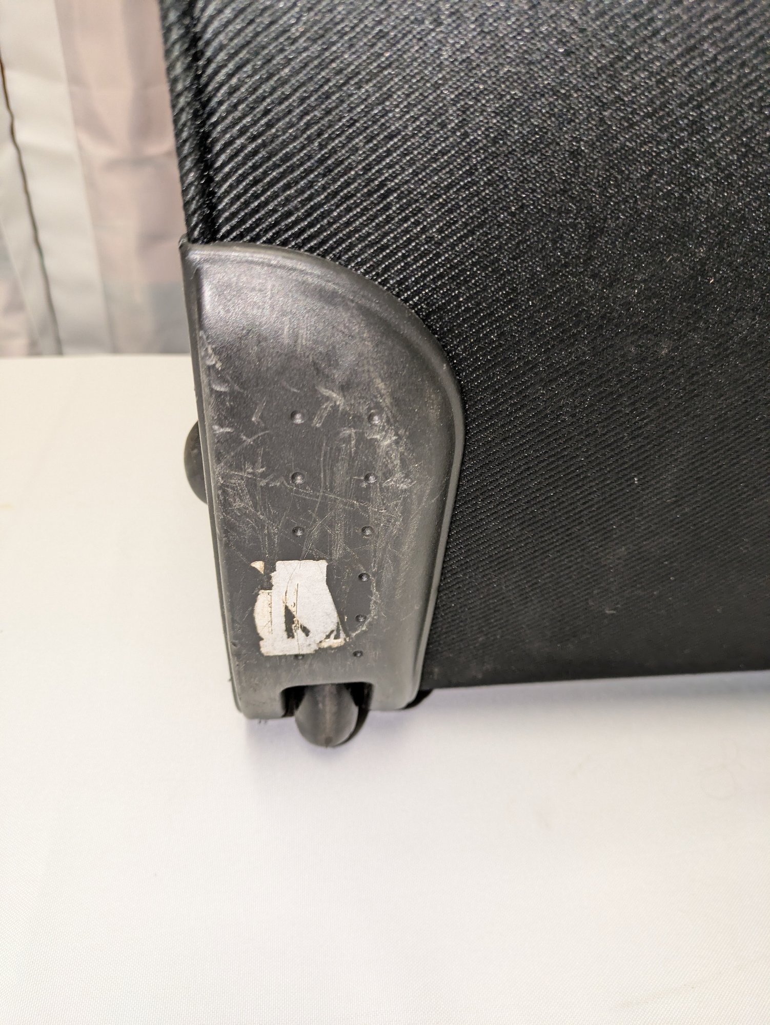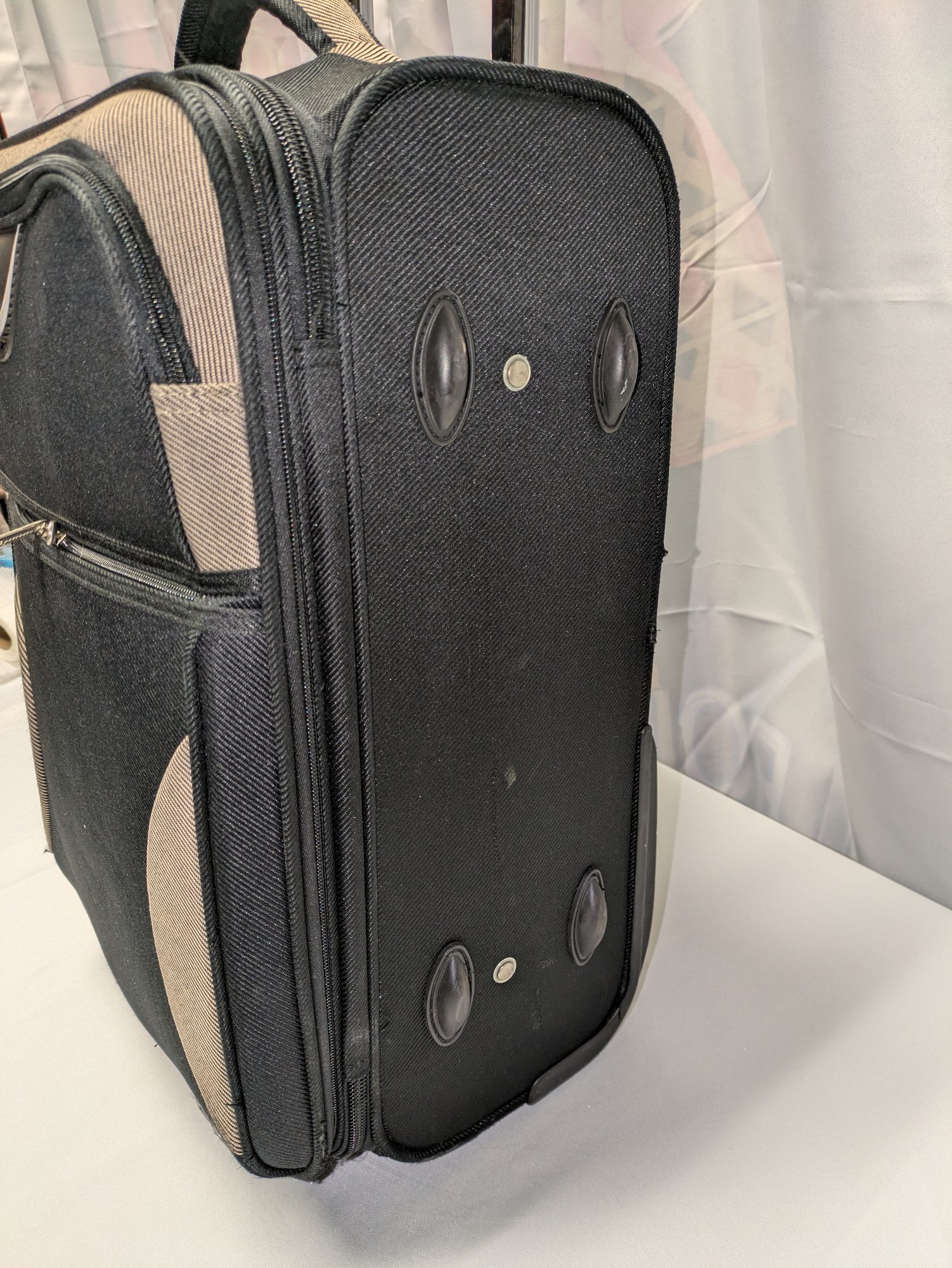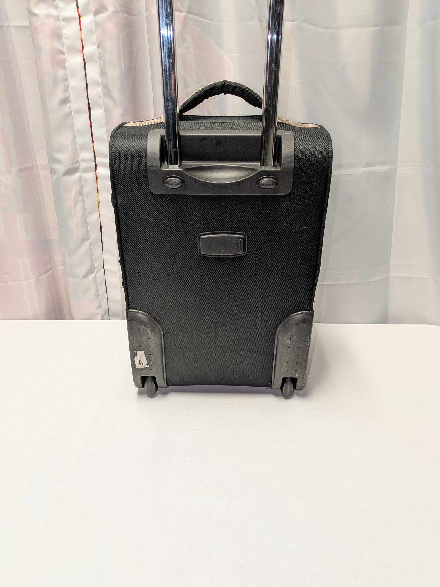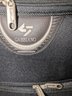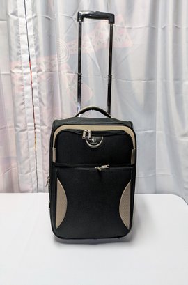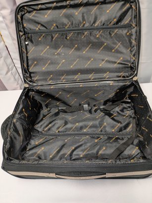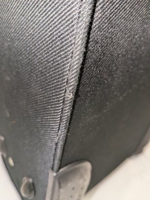 Features: Pull-up handle, 2 bag handles, 2 outside storage pockets, 2 wheels, 1 interior mesh storage pocket, and plenty of interior space for everything you need. There are some marks and tape residue (easily removable) on the bottom. Overall, Very Good Condition. Please see all photos as part of the description and condition. 39"H (with extended handle) 23.5" x 21" x 14.5"