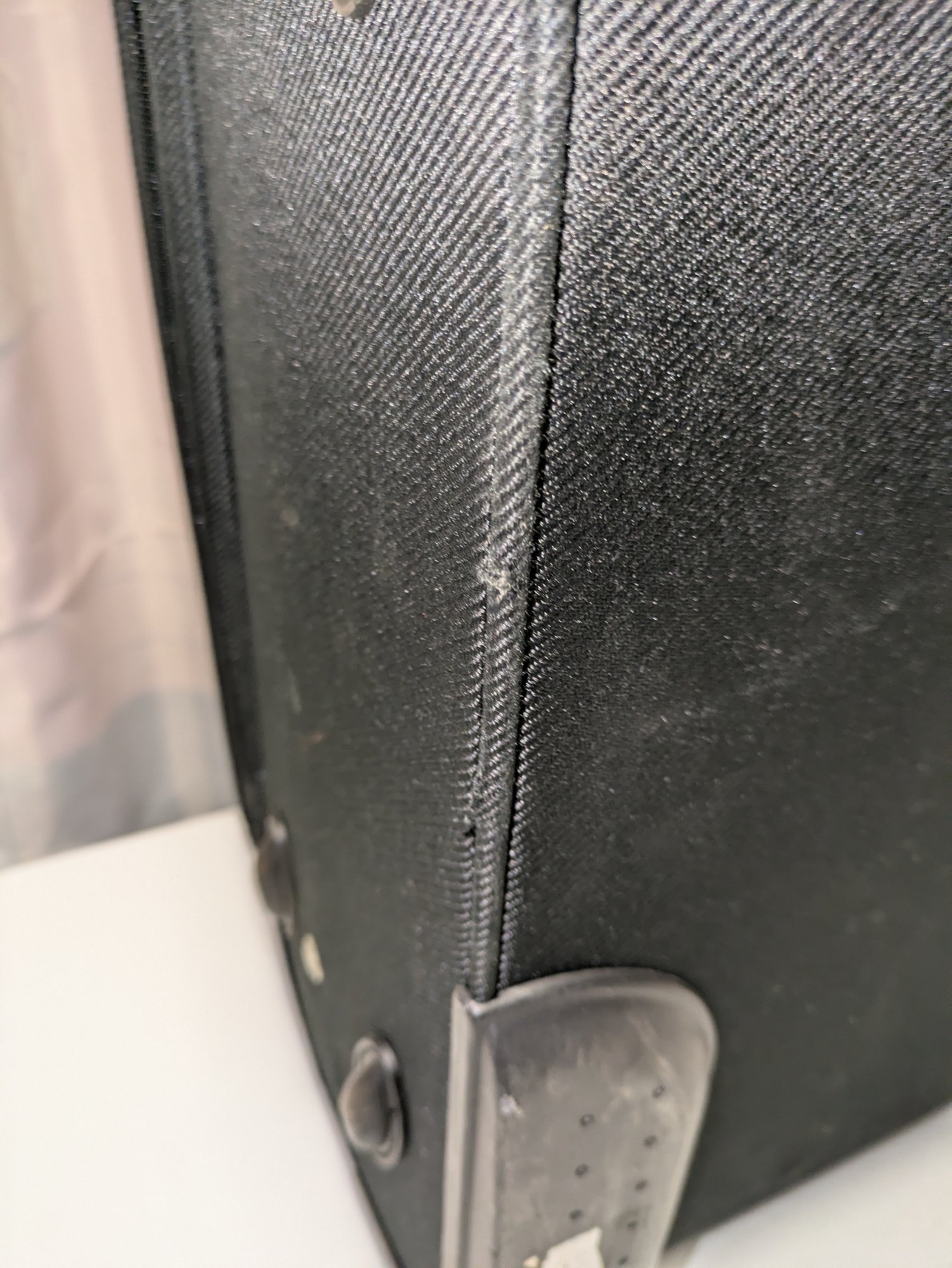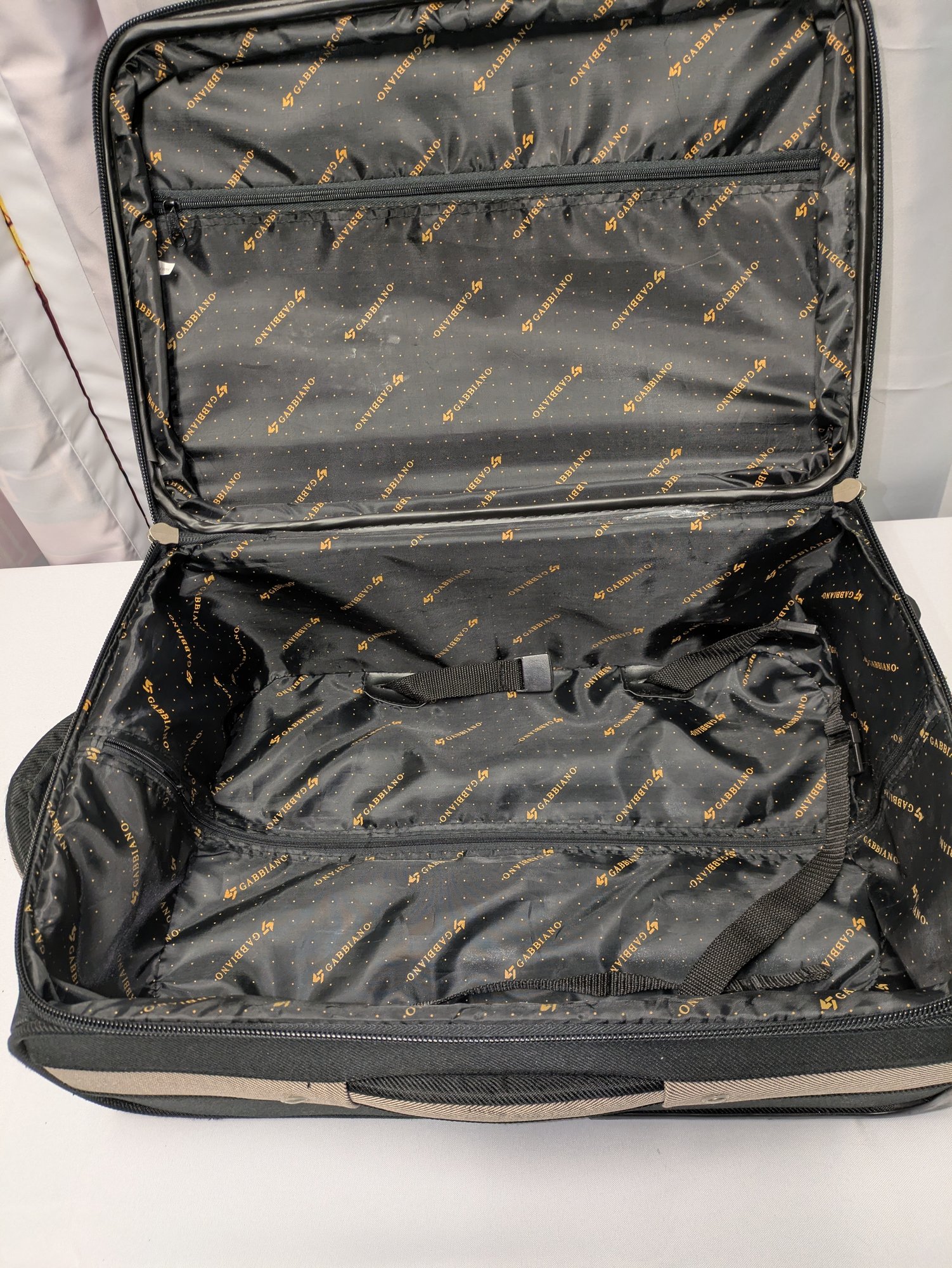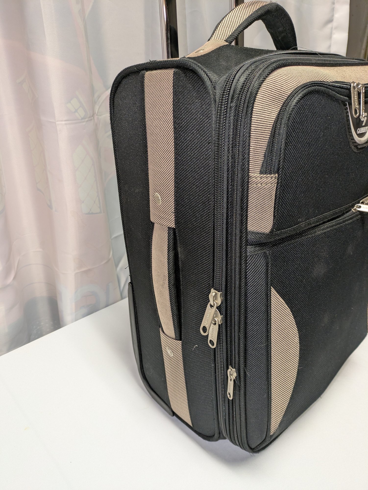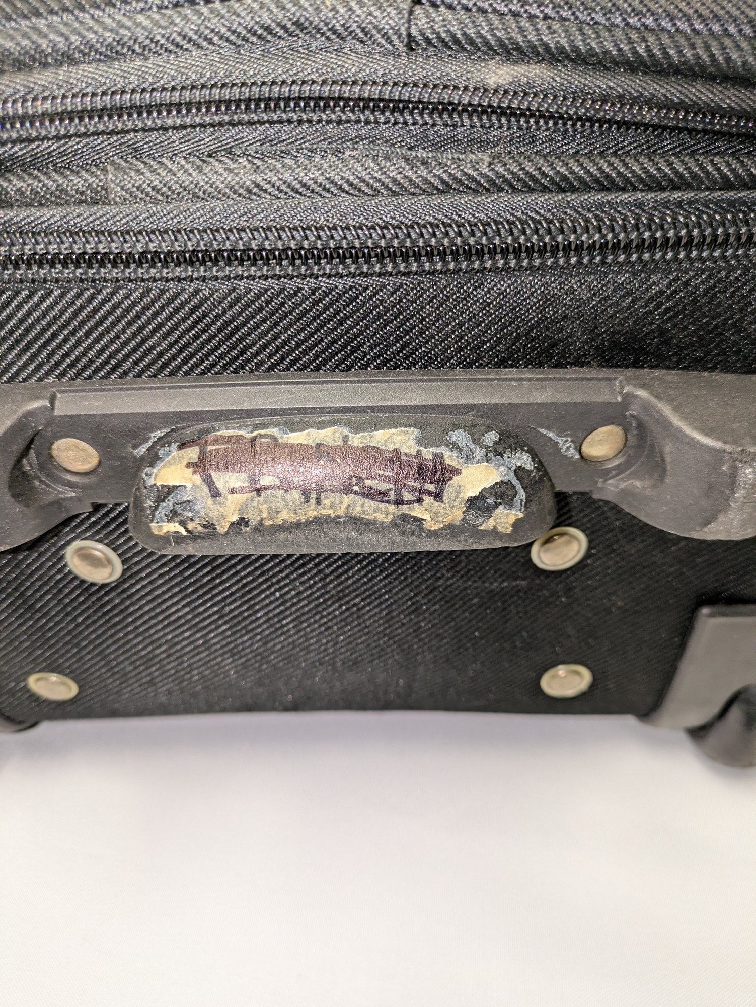 Features: Pull-up handle, 2 bag handles, 2 outside storage pockets, 2 wheels, 1 interior mesh storage pocket, and plenty of interior space for everything you need. There are some marks and tape residue (easily removable) on the bottom. Overall, Very Good Condition. Please see all photos as part of the description and condition. 39"H (with extended handle) 23.5" x 21" x 14.5"