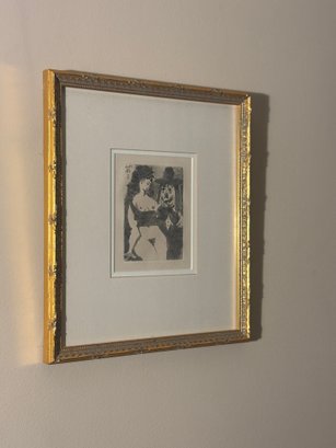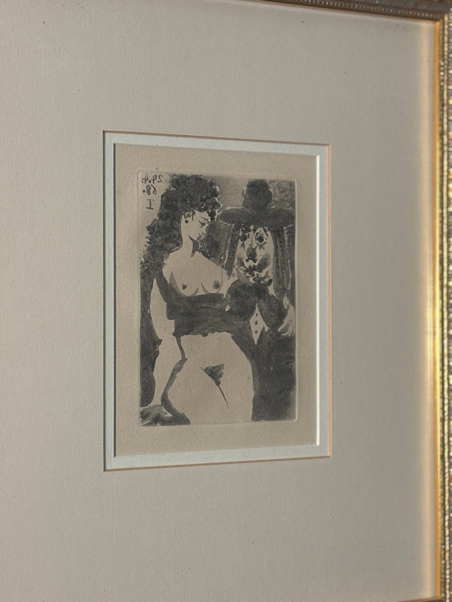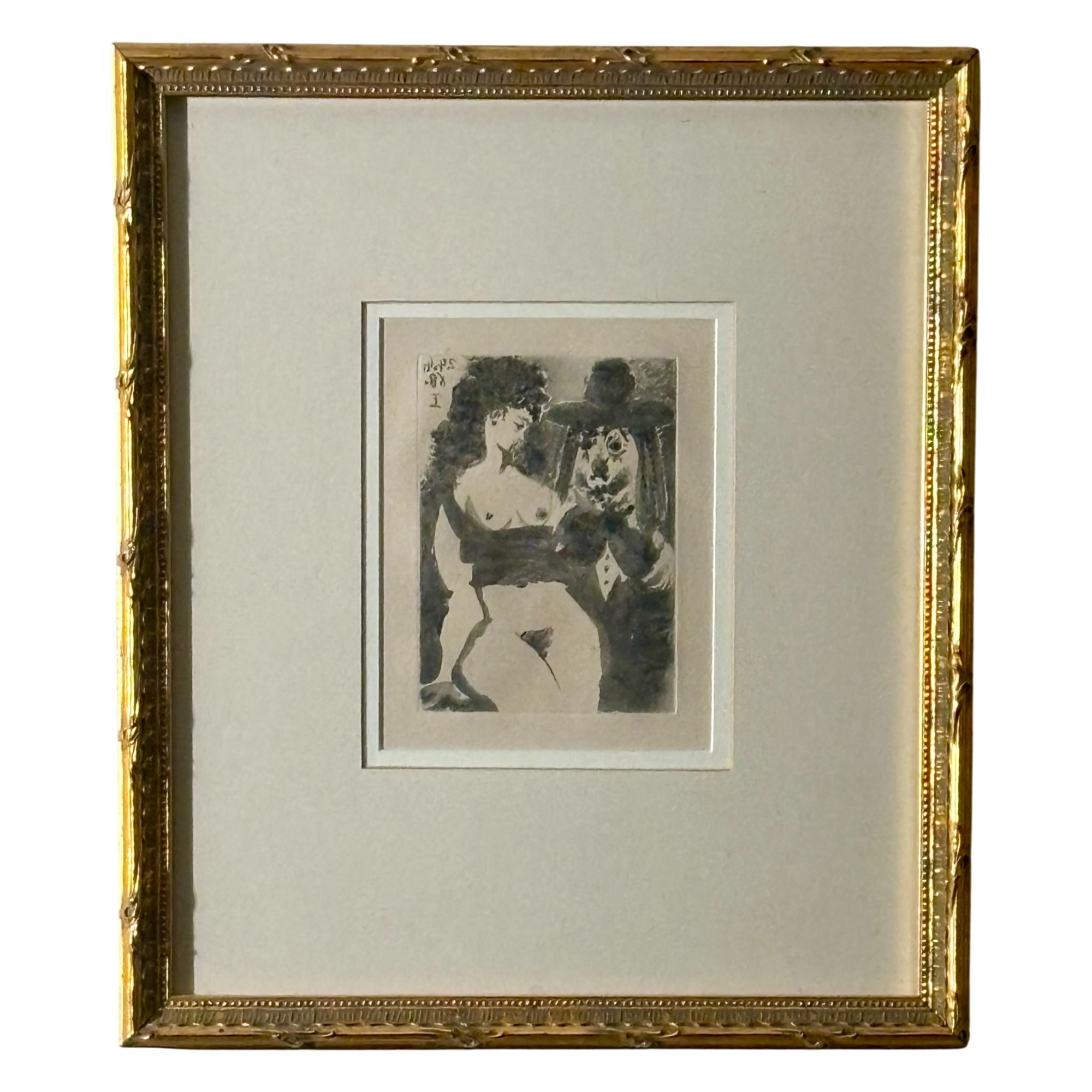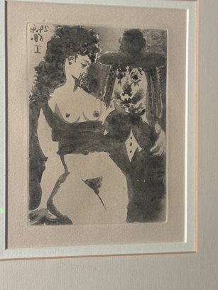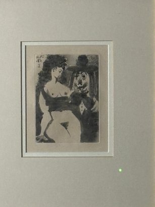 The work may be an early aquatint, a mid century print, lithograph, or reproduction after an original Picasso composition. No definitive determination has been made regarding medium, edition, or date. No certificate of authenticity accompanies the piece, and it is offered as attributed.
