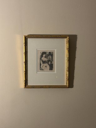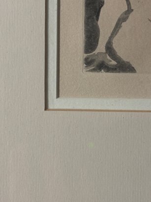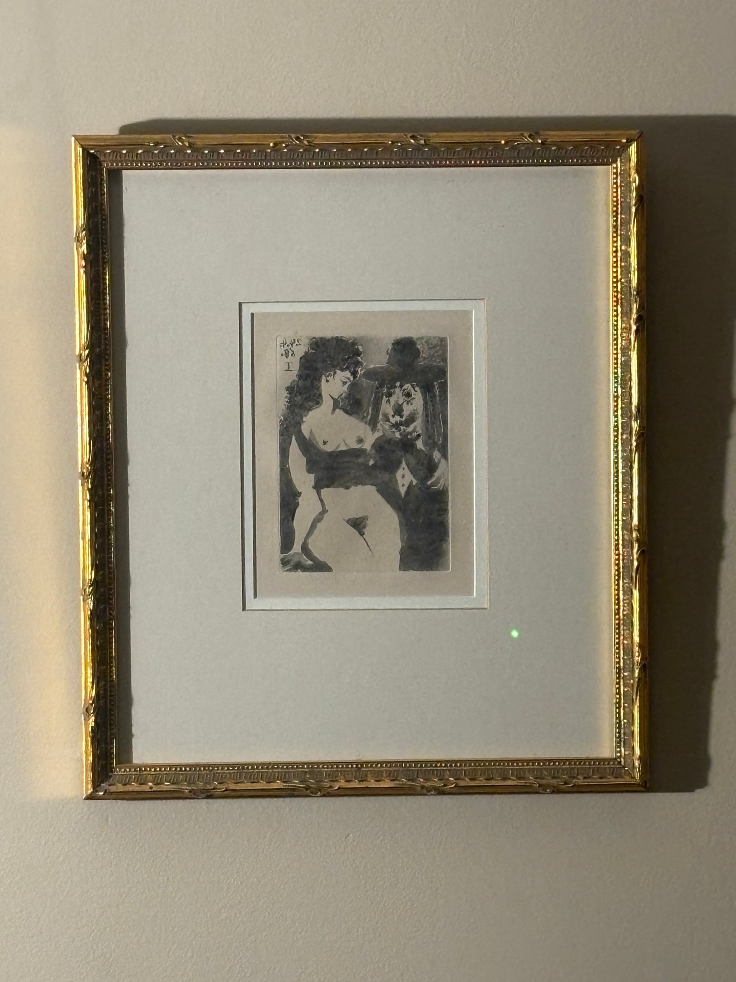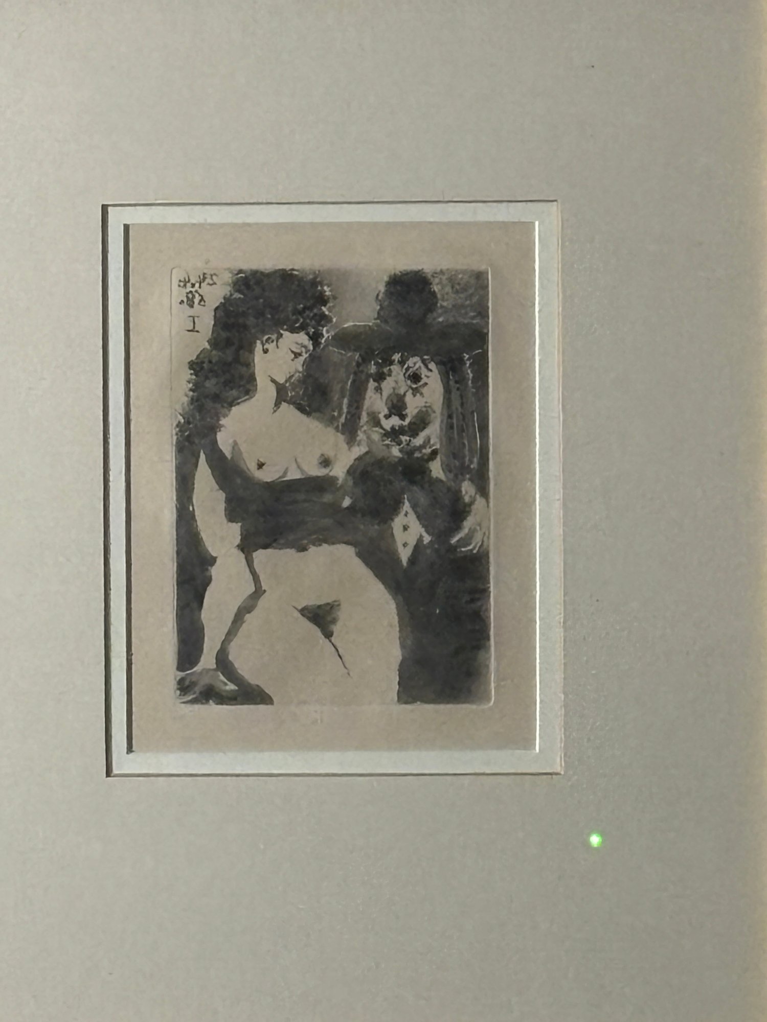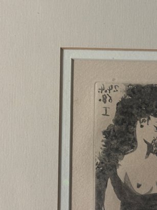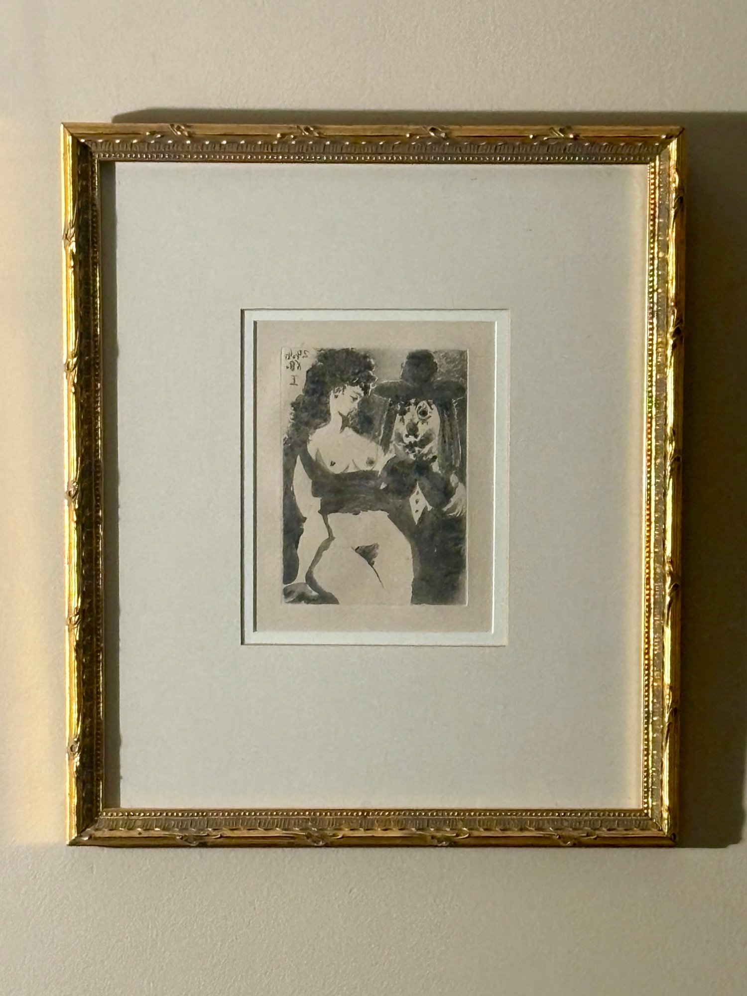 The work may be an early aquatint, a mid century print, lithograph, or reproduction after an original Picasso composition. No definitive determination has been made regarding medium, edition, or date. No certificate of authenticity accompanies the piece, and it is offered as attributed.