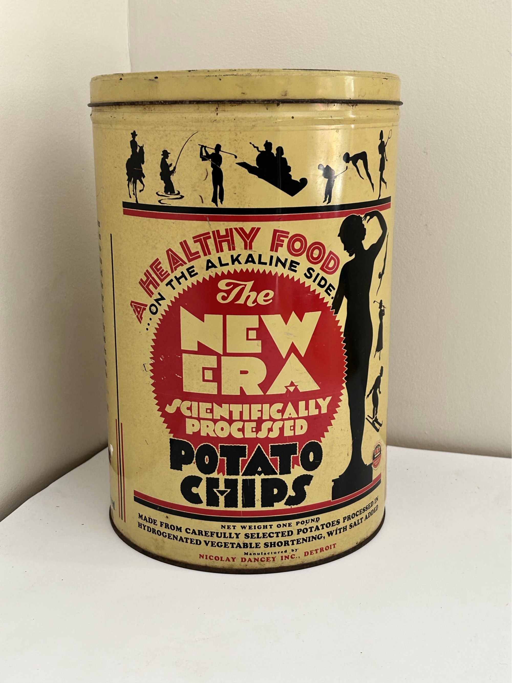 1930’s or 40’ with an art deco look. The New Era “ Scientifically Processed” Potato Chips !! Potato chips a health food ?