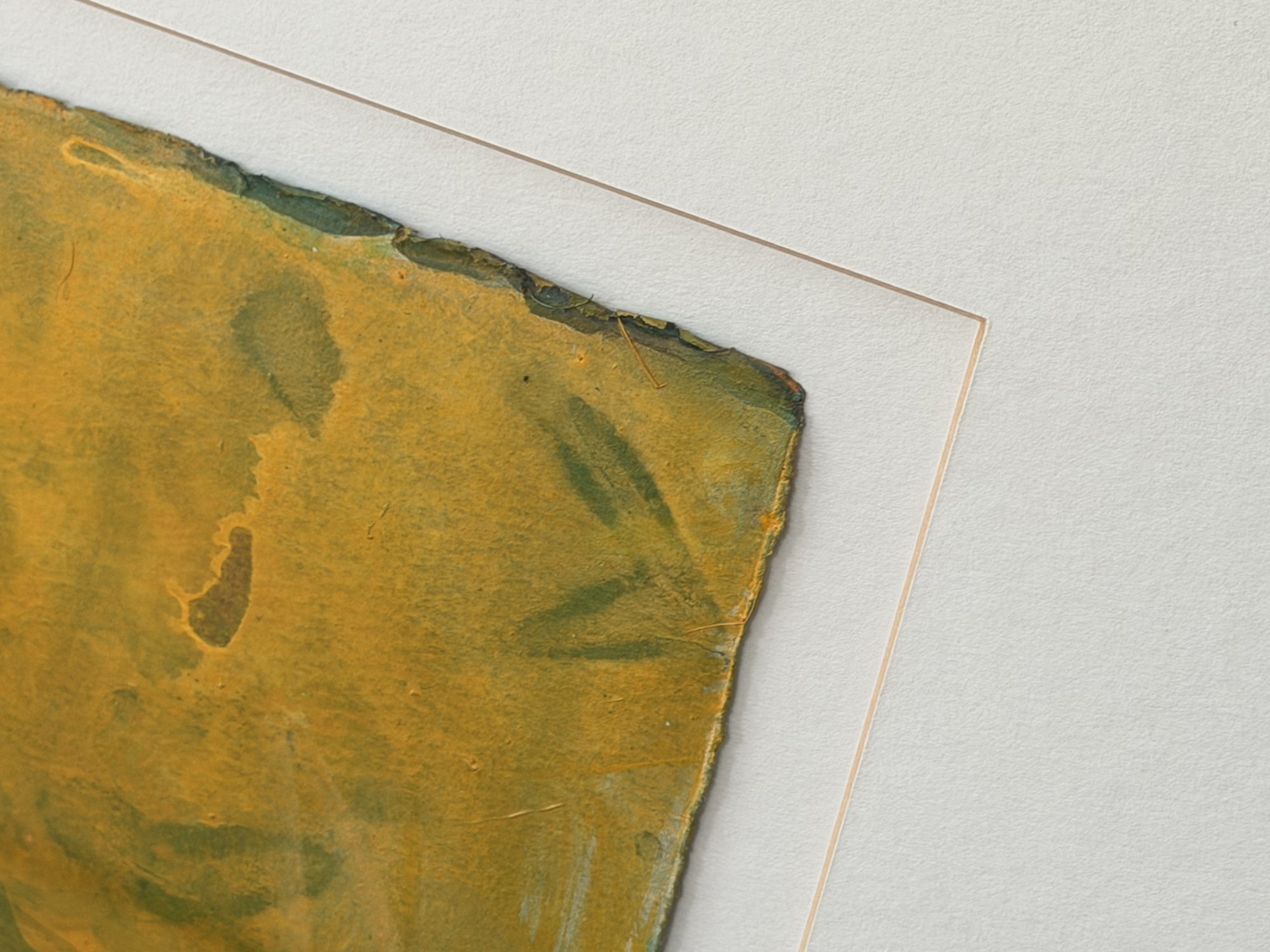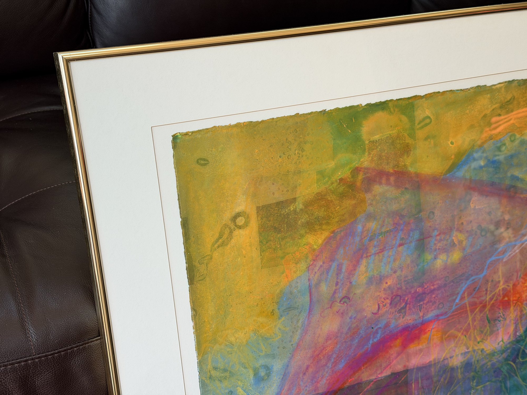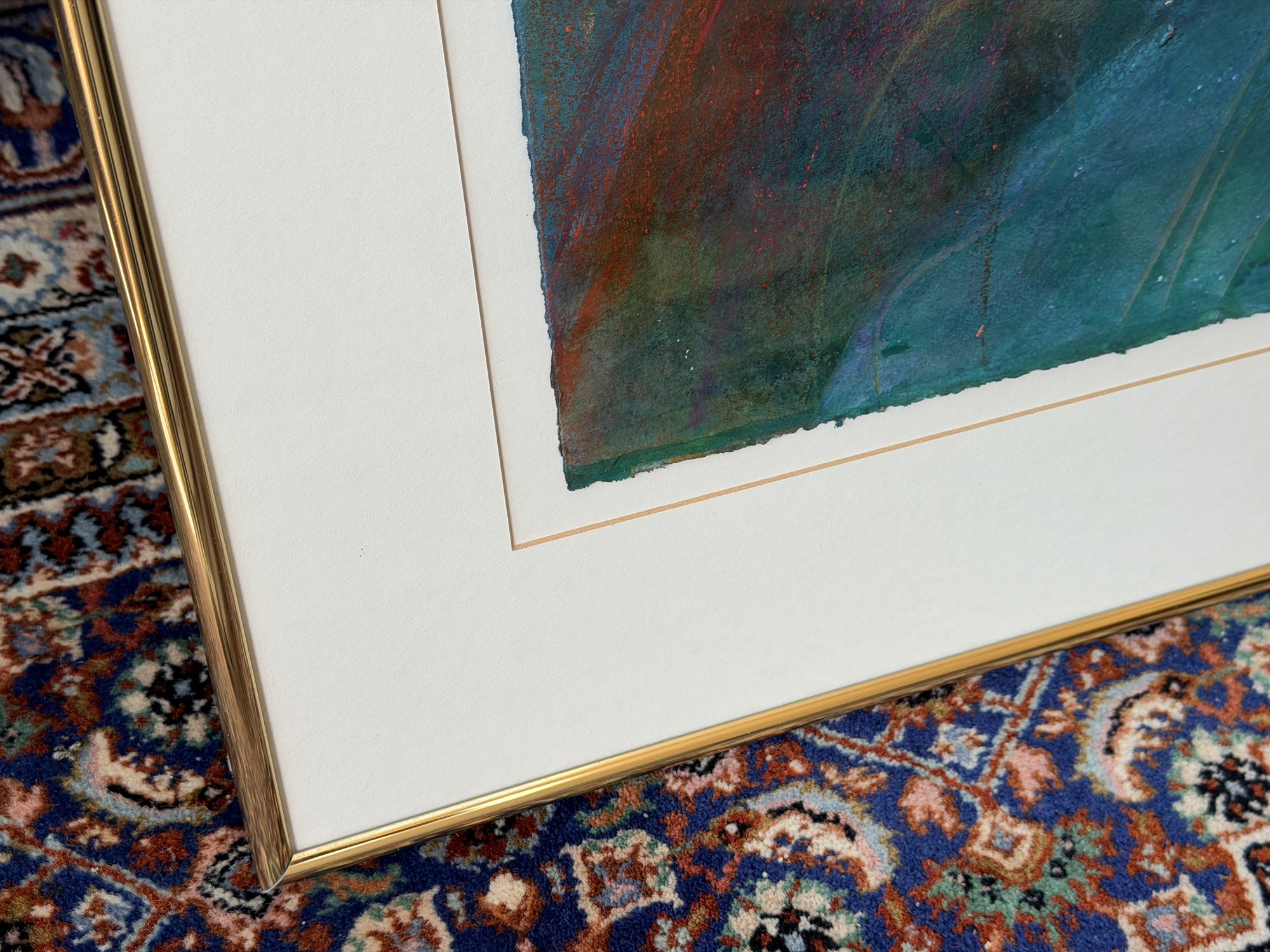 Overall good condition. The artwork shows minor signs of handling consistent with age, including slight waviness to the paper and natural irregularities along the deckled edges. Frame and mat present well with light surface wear as expected. No major damage noted.