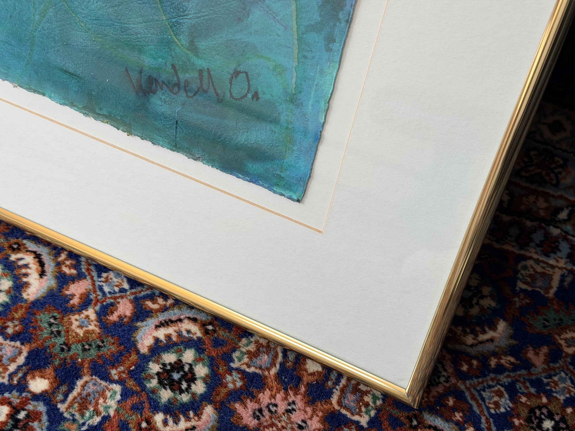 Executed on deckled-edge paper, the artwork retains its natural, irregular edges, which are visible through the presentation and add texture and visual interest. The piece is signed “Kendell O.” in the lower right corner. Professionally framed in a gold-tone frame with a white mat, the artwork appears to be float-mounted, allowing the full edges of the paper to be seen rather than concealed beneath the mat.