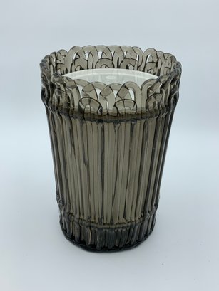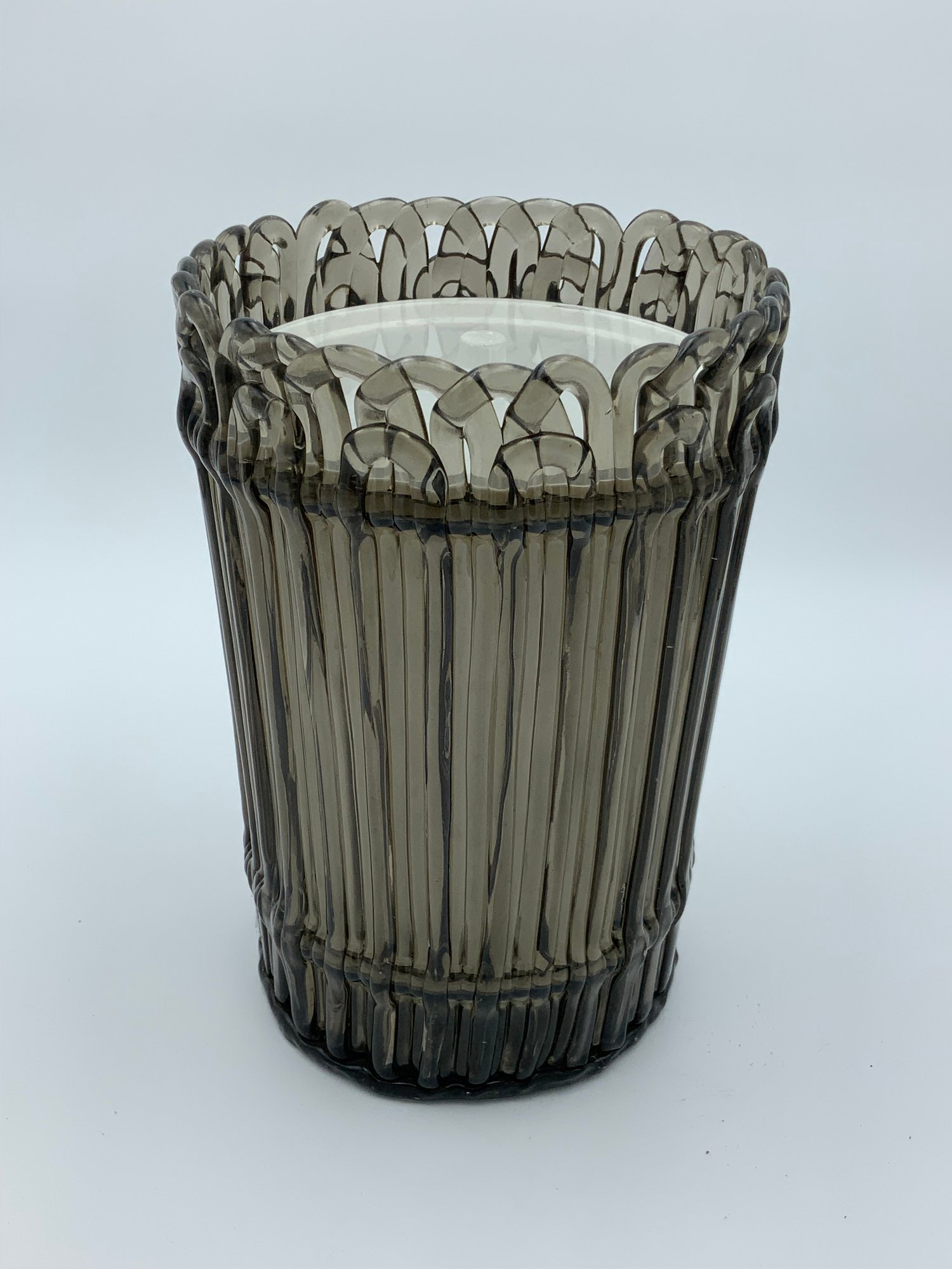 MCM style ice bucket, possibly vintage. Looks almost handmade with acrylic coils visible on the bottom. Good used condition, chip in plastic lid does not affect use. Includes ice tongs.