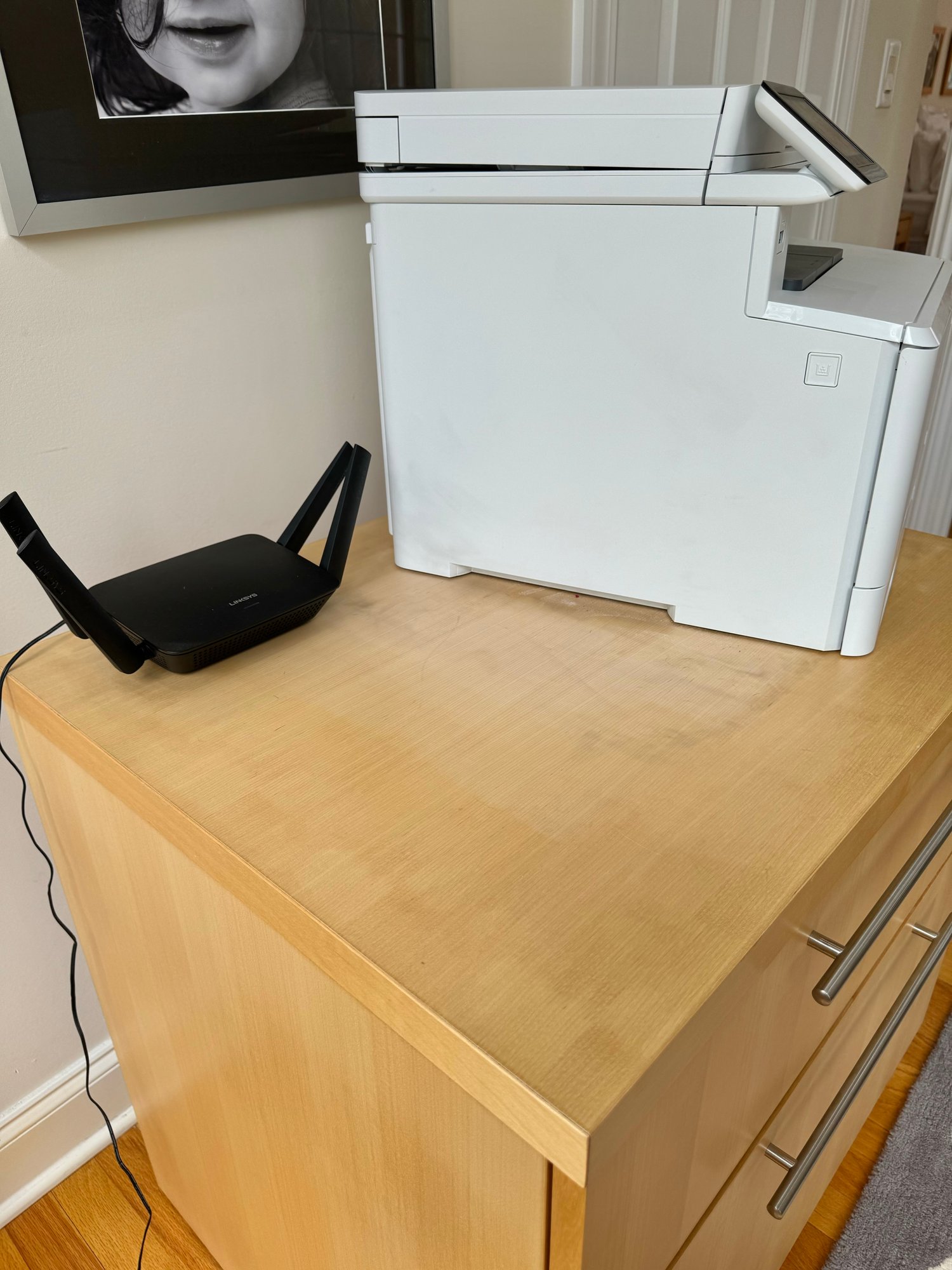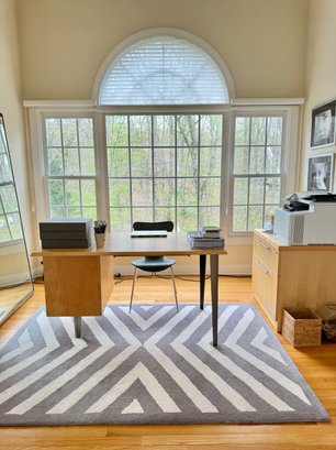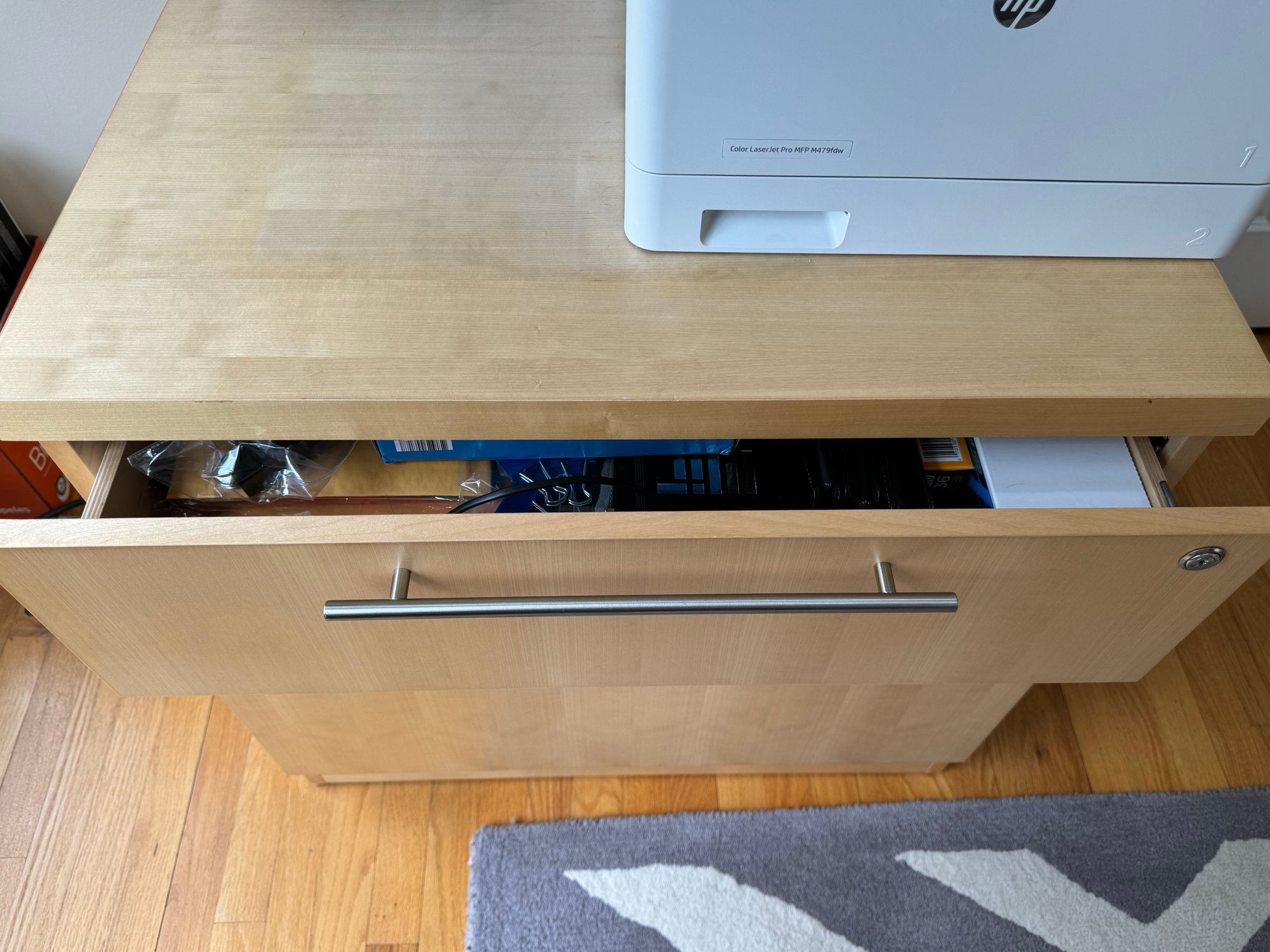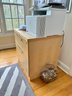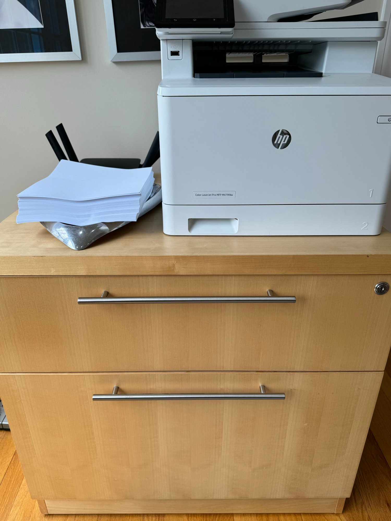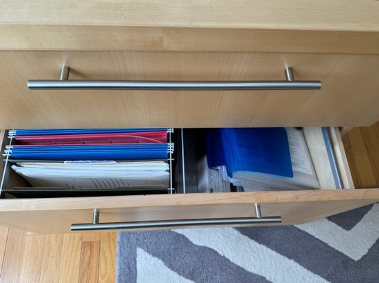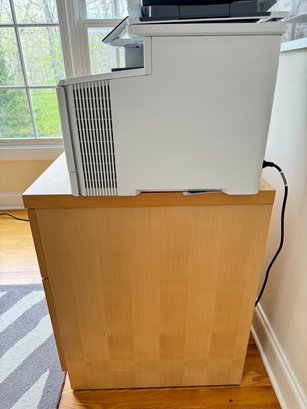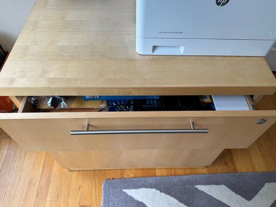 Beautiful modern two drawer file cabinet with brushed nickel pulls. Heavy and quality made item. Condition is good. Size 30 W x 24 D x 29 H