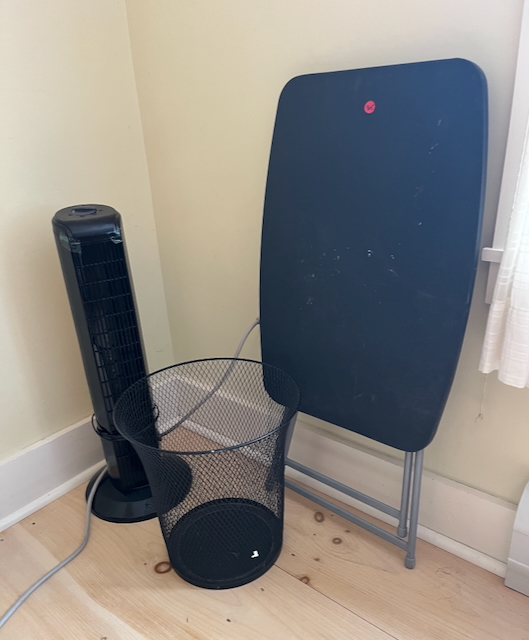 Adjustable Folding Table, Waste Basket, Tower Fan