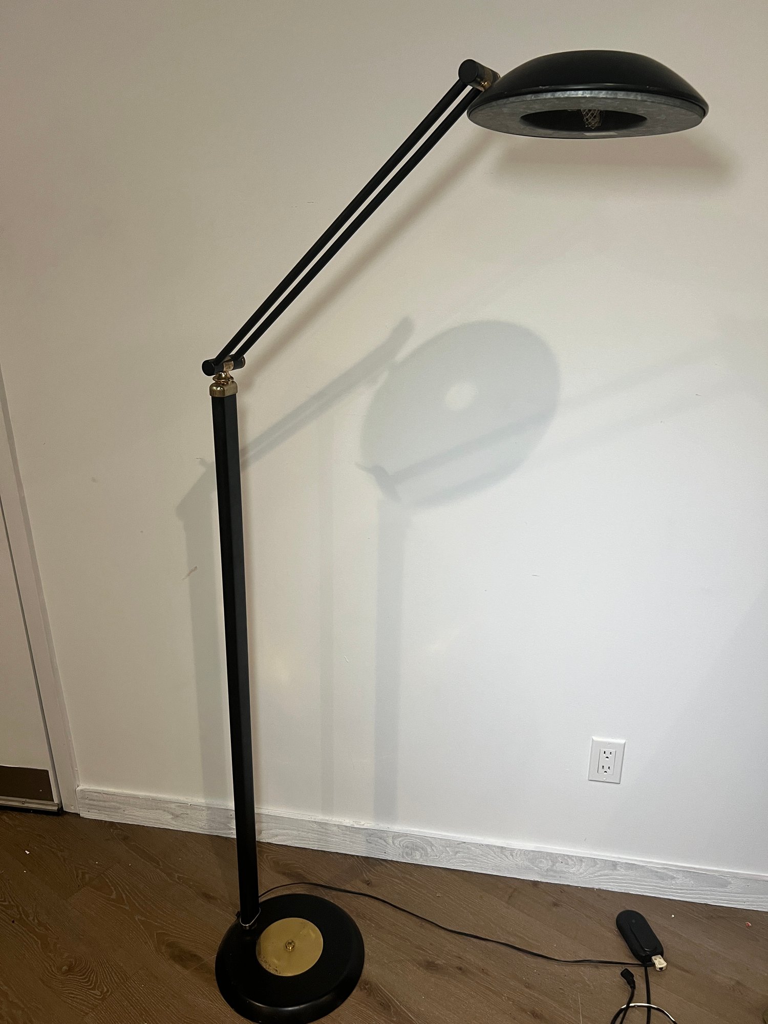 Adjustable height and light angle hinged midcentury-industrial style vintage floor lamp in black with brass accents.