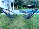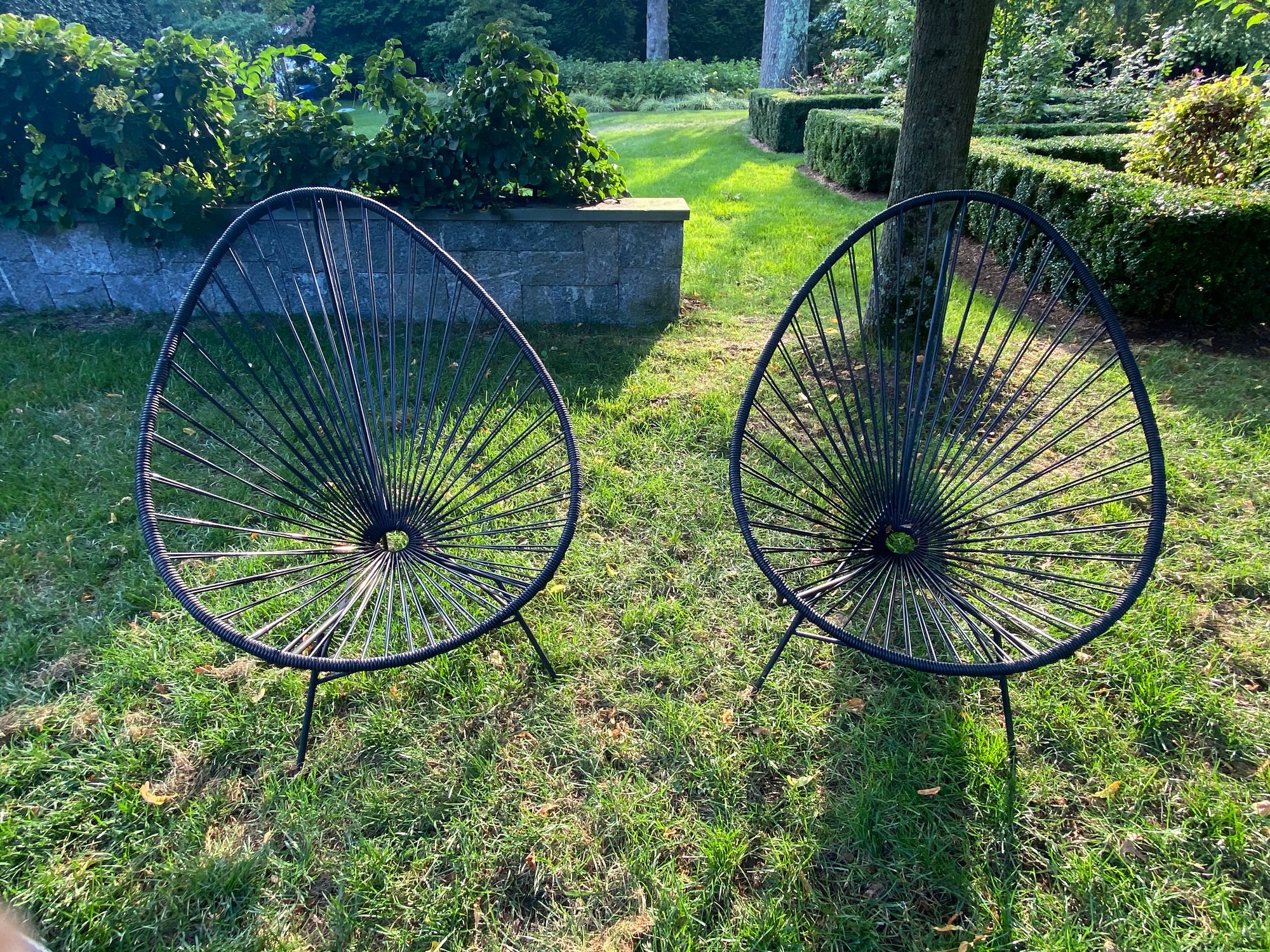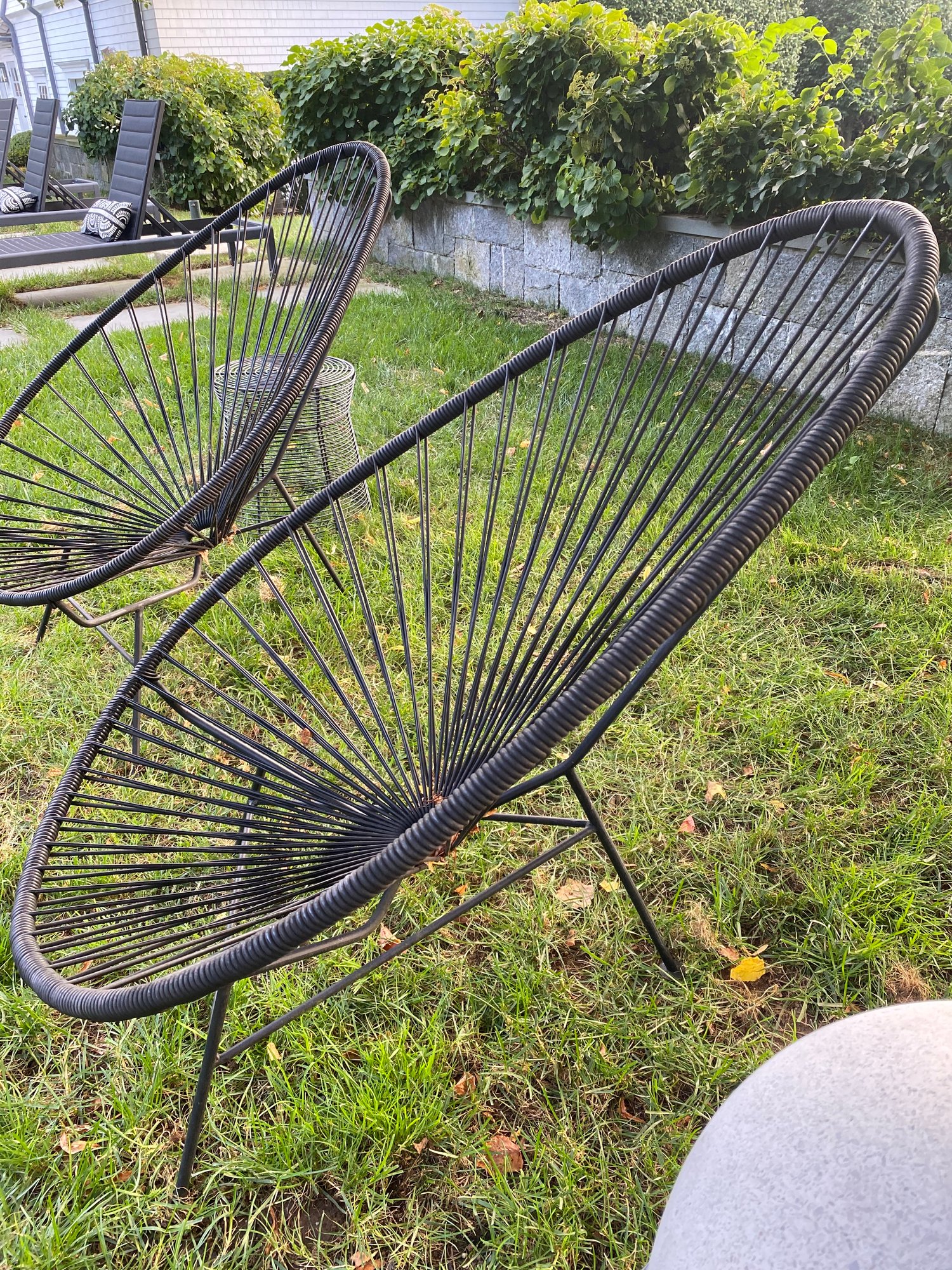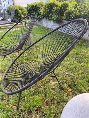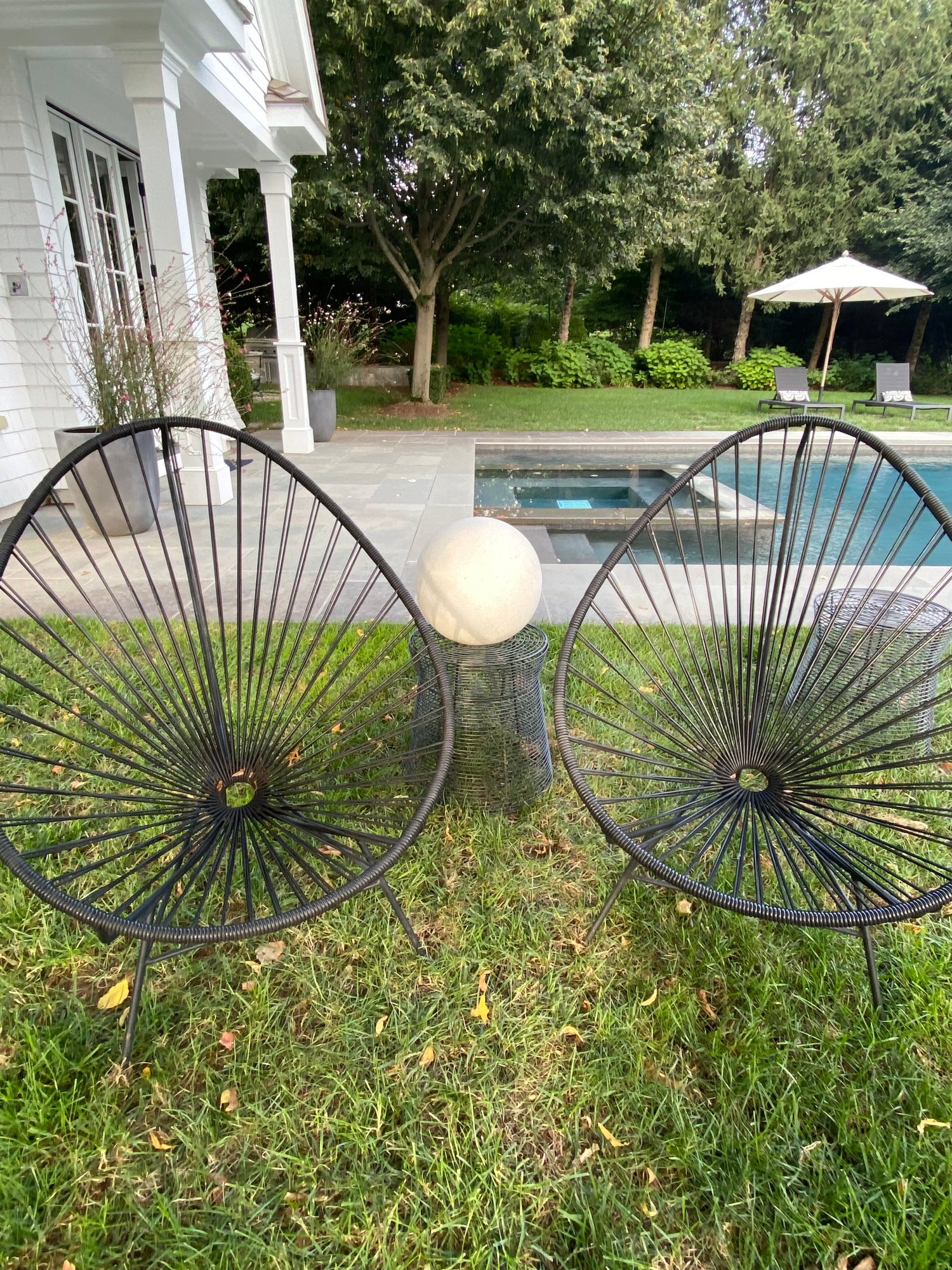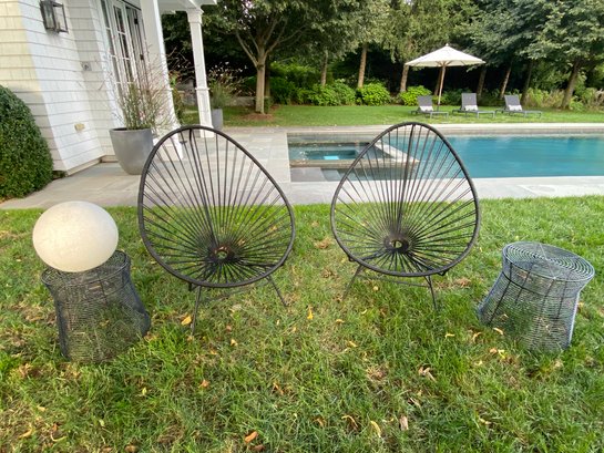 This very special group consists of 2 oval womb style chairs, two petite side tables and one white garden ball